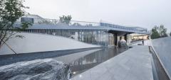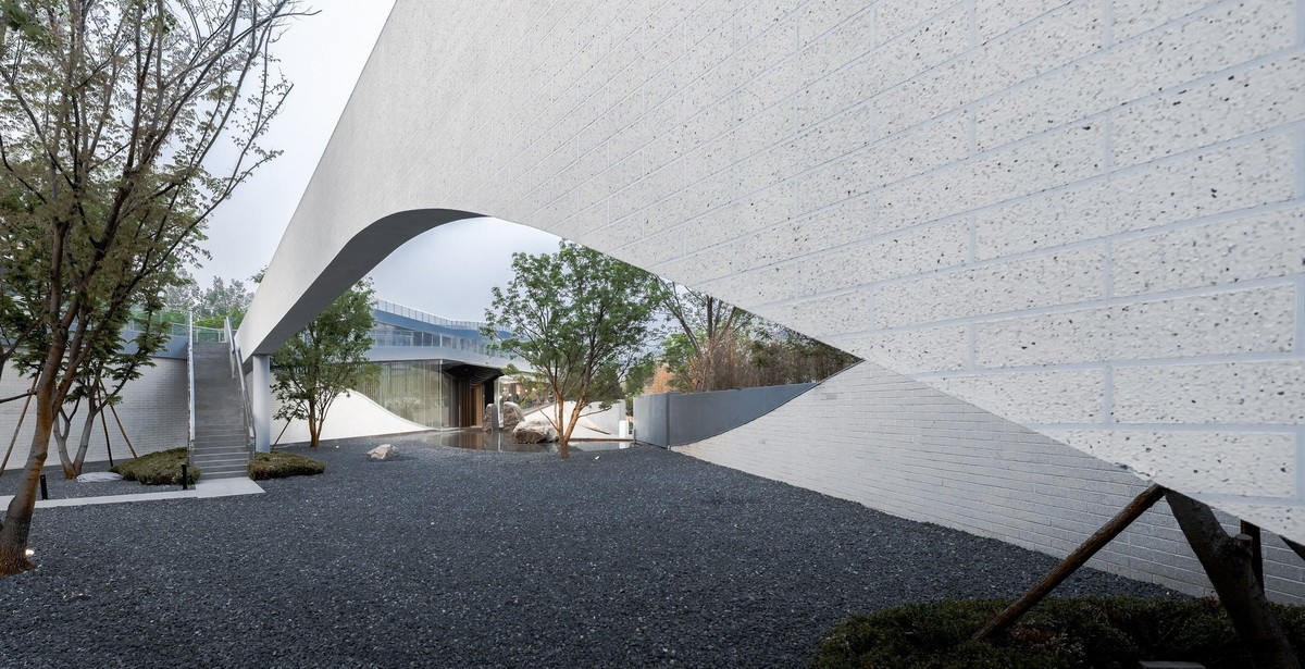 由于項(xiàng)目地段是三角形的,建筑通過一系列曲線墻堆疊在一起回應(yīng)了基地的輪廓,這些沿水平展開的或空中懸浮的墻以交錯(cuò)的方式創(chuàng)造了一系列多層次的庭院。為了與北京的四合院和長城形成對話,墻體的材料是精心控制比例的混凝土磚,這些磚同時(shí)也被用于景觀地面、建筑墻體和室內(nèi)墻體——統(tǒng)一的色調(diào)為項(xiàng)目帶來了歷史感的莊嚴(yán)。該項(xiàng)目包括一個(gè)1500平方米的社區(qū)體驗(yàn)空間和一個(gè)400平方米的滑冰場。
