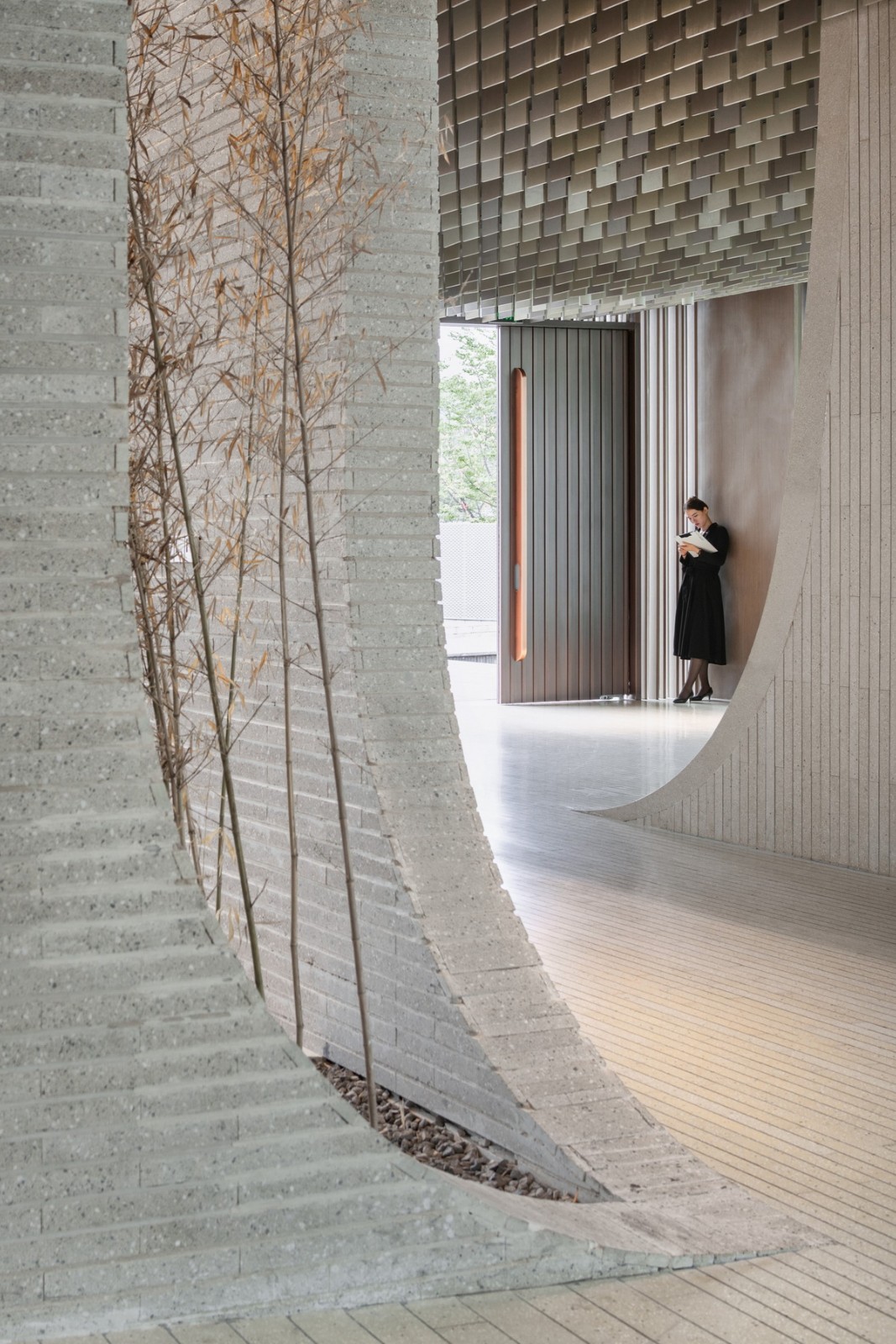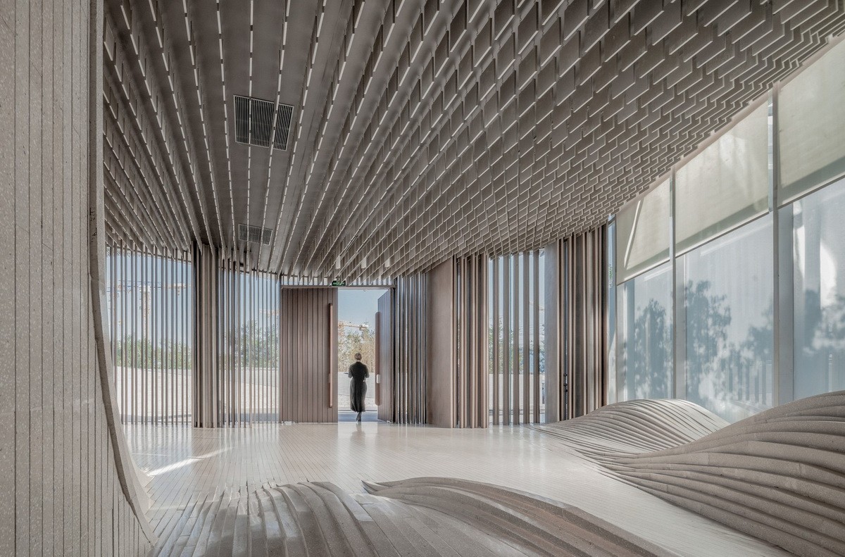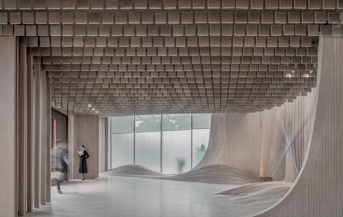第一特征和潛在的第二特征是并列出現(xiàn)而同時(shí)又緊密地結(jié)合在一起的:環(huán)保混凝土砌塊被切成薄片,拼成彎曲的具有自然形態(tài)的曲線,猶如山丘和流淌的瀑布,在天光和人工光的刻畫下展現(xiàn)了自然的凝固和抽象,而自然的易逝與不朽之間的對比帶給了人們思考自然的時(shí)刻。