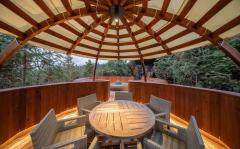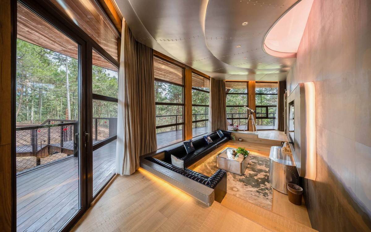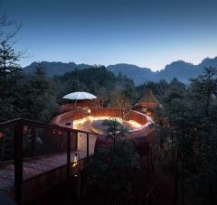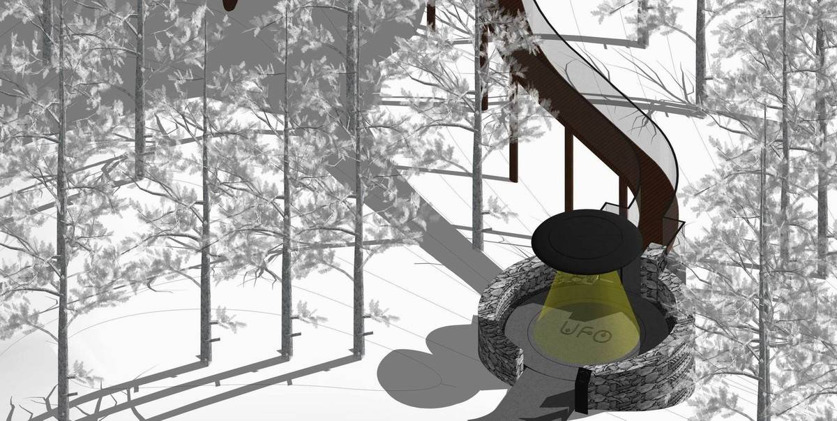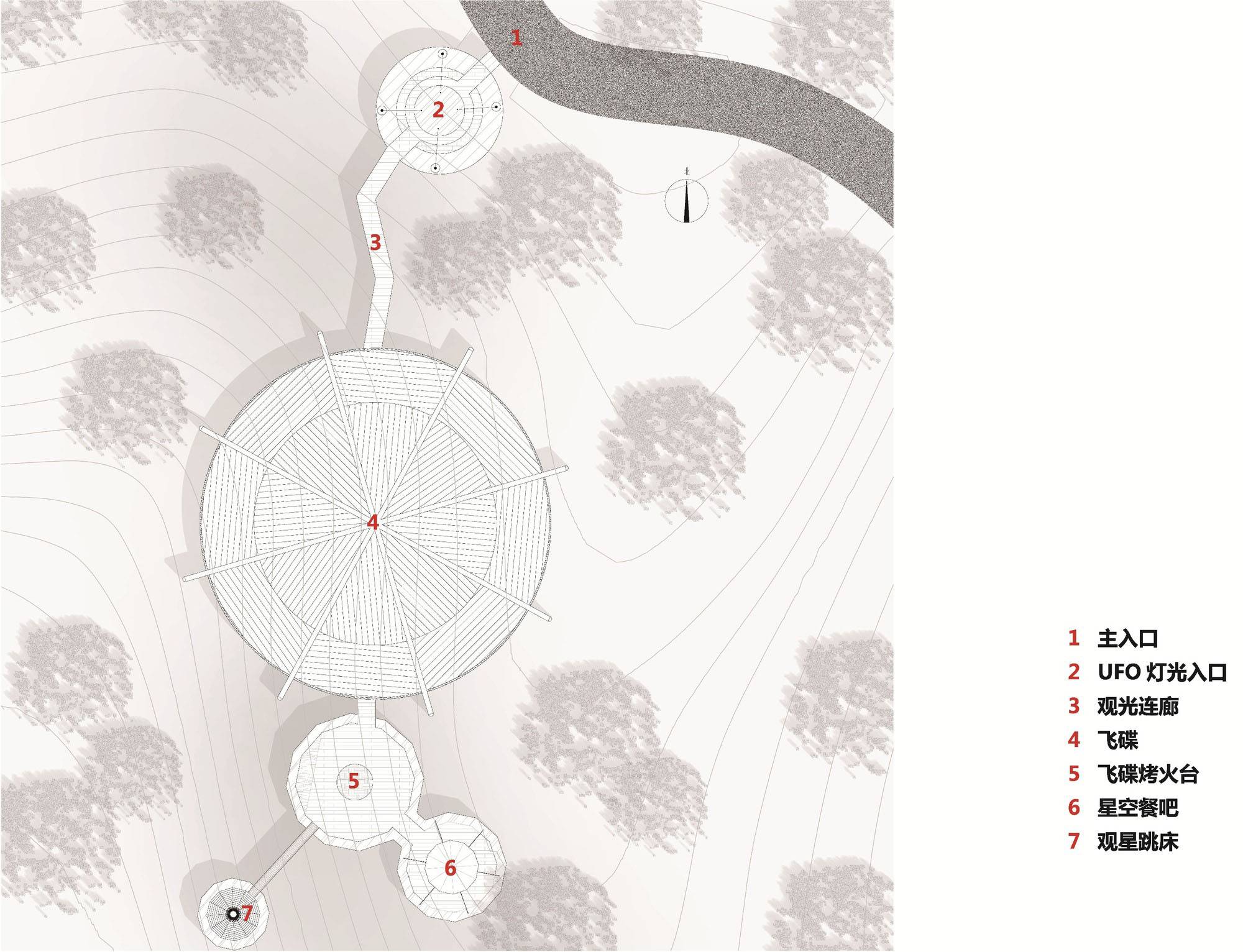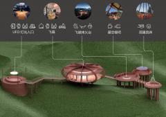 本棟樹屋景觀以星球UFO、魔幻燈光等為設(shè)計元素,配合建筑的趣味飛碟形態(tài),設(shè)計了特色UFO燈光入口、觀星跳床與飛碟烤火臺、星空餐吧,使入住者仿佛置身一個夢幻星球之上。