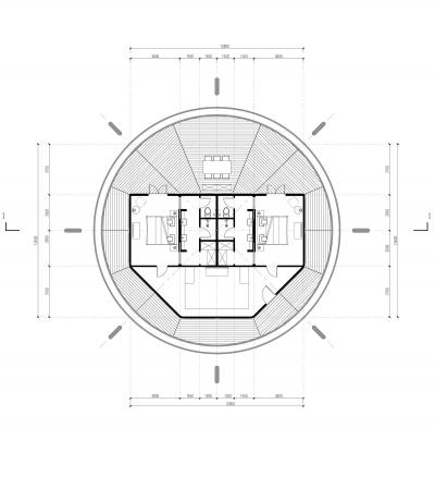 設(shè)計采用了大角度落地玻璃窗,以期對絕美景觀資源的最大反饋。親子房的定位,要求建筑形式語言須與孩子的興趣愛好相結(jié)合。兩種因素的作用下,建筑師采用了飛碟——這個兒童普遍喜歡的科幻主題。由于當(dāng)?shù)貫槎嘤隁夂颍瑲庀笥涗涳@示平均每年下雨的日子近200天,建筑師在平面閉合落地玻璃帶外面加入一圈圍廊,加深出檐,制造出一個徐徐向室內(nèi)過度的灰空間,并且在面朝齊云山主峰方向加大廊道,變成休閑平臺。入住者可以在此欣賞美景,拋擲時光。