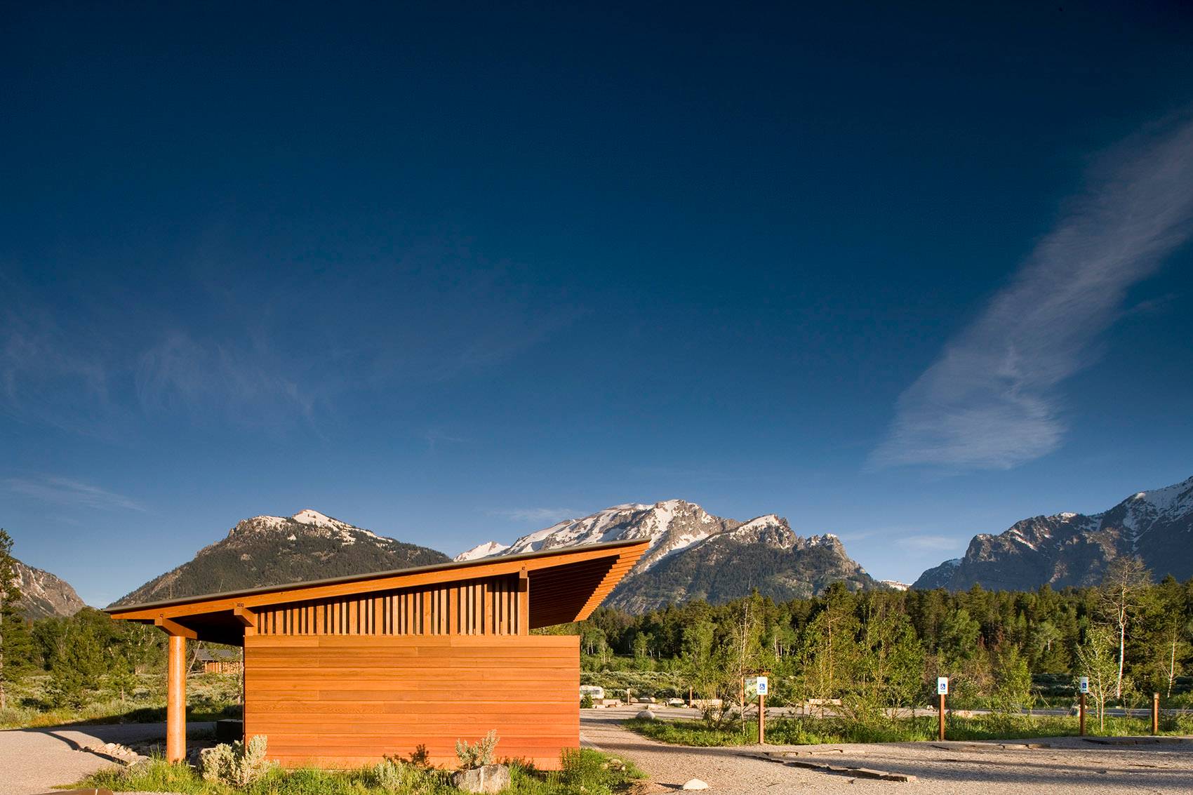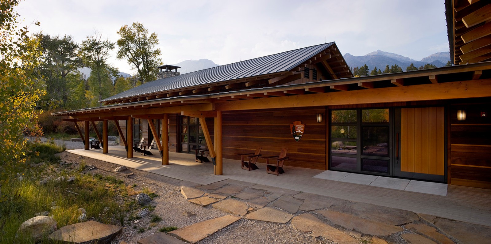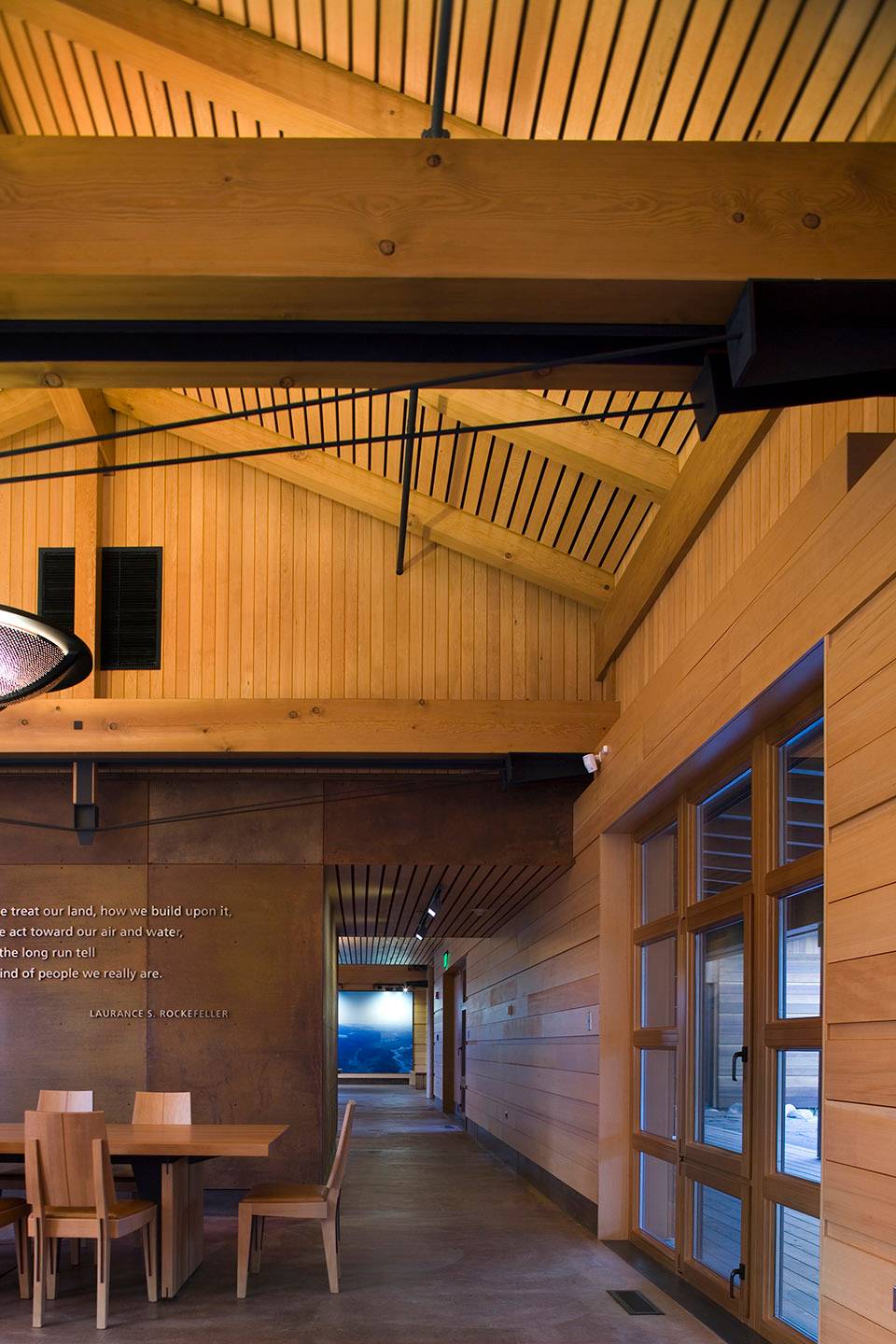勞倫斯·洛克菲勒自然保護區(qū)既表達了對大自然的敬畏之情,也體現(xiàn)了人們對自然遺產(chǎn)的珍愛與保護。這一開創(chuàng)性的項目是從勞倫斯·洛克菲勒時代開始的,在過去的75年間,這個家族對其下所有的1100英畝土地的修繕與維護成為當(dāng)?shù)鼐用褡钫湎〉酿佡?。洛克菲勒的最初?gòu)想是將35戶居民移出菲爾普斯湖沿岸,打造全新的步行網(wǎng)絡(luò),并將湖北側(cè)的保護區(qū)游客中心納入步行網(wǎng)絡(luò)之中。該項目完成后于2007年6月被用于國家公園服務(wù)中心。這一建筑設(shè)計的每一步都深刻考慮到對于自然保護區(qū)的管理,維護和修復(fù)。除了7000平方英尺的服務(wù)中心外,項目還包括停車場,三處帶公共衛(wèi)生間的休息處。與此同時,該項目還一并移除了先前的路徑規(guī)劃及其他附加設(shè)計。在這里,人類用設(shè)計回應(yīng)了對自然的責(zé)任與尊重。該項目獲得了LEED白金評級。