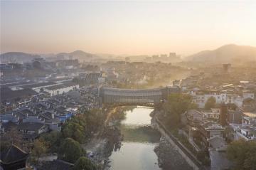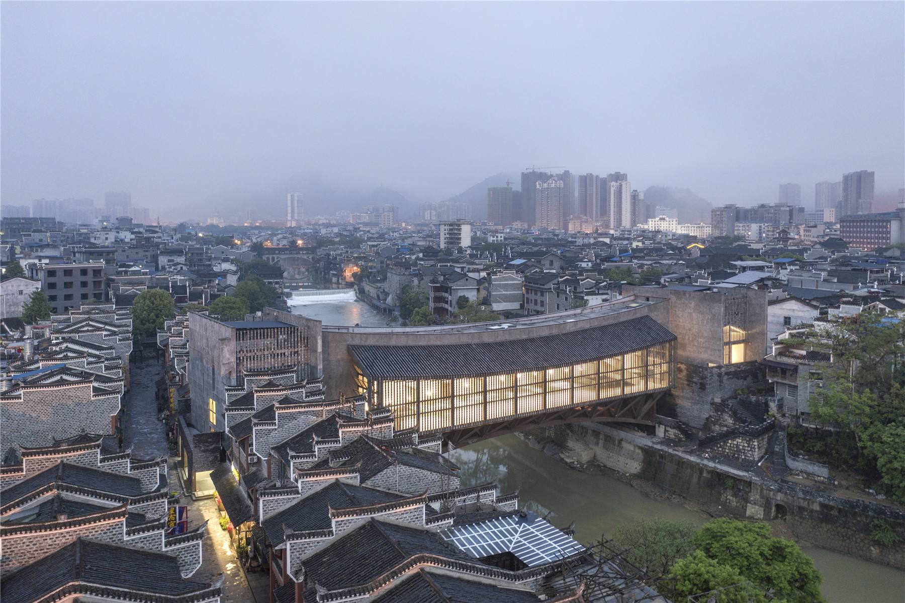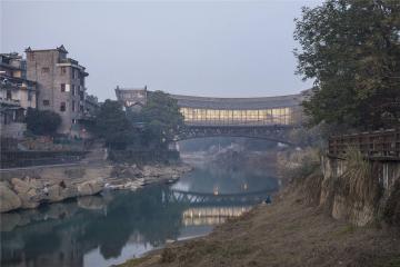 美術(shù)館所在的吉首市是湘西土家族苗族自治州的州府。起初地方政府考慮在城外的開發(fā)區(qū)內(nèi)選擇建設(shè)用地,然而我們作為建筑師則建議將美術(shù)館設(shè)立在人口密集的乾州古城的中心區(qū),因?yàn)槲覀冋J(rèn)為文化設(shè)施應(yīng)該盡可能地方便居民使用。穿城而過的萬溶江流經(jīng)吉首的核心地帶,因此我們構(gòu)想了一座橫跨江面、兼做步行橋的美術(shù)館。我們希望人們不僅會專程去欣賞藝術(shù),也可以在上班、上學(xué)、或者購物的途中與藝術(shù)邂逅。