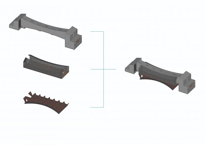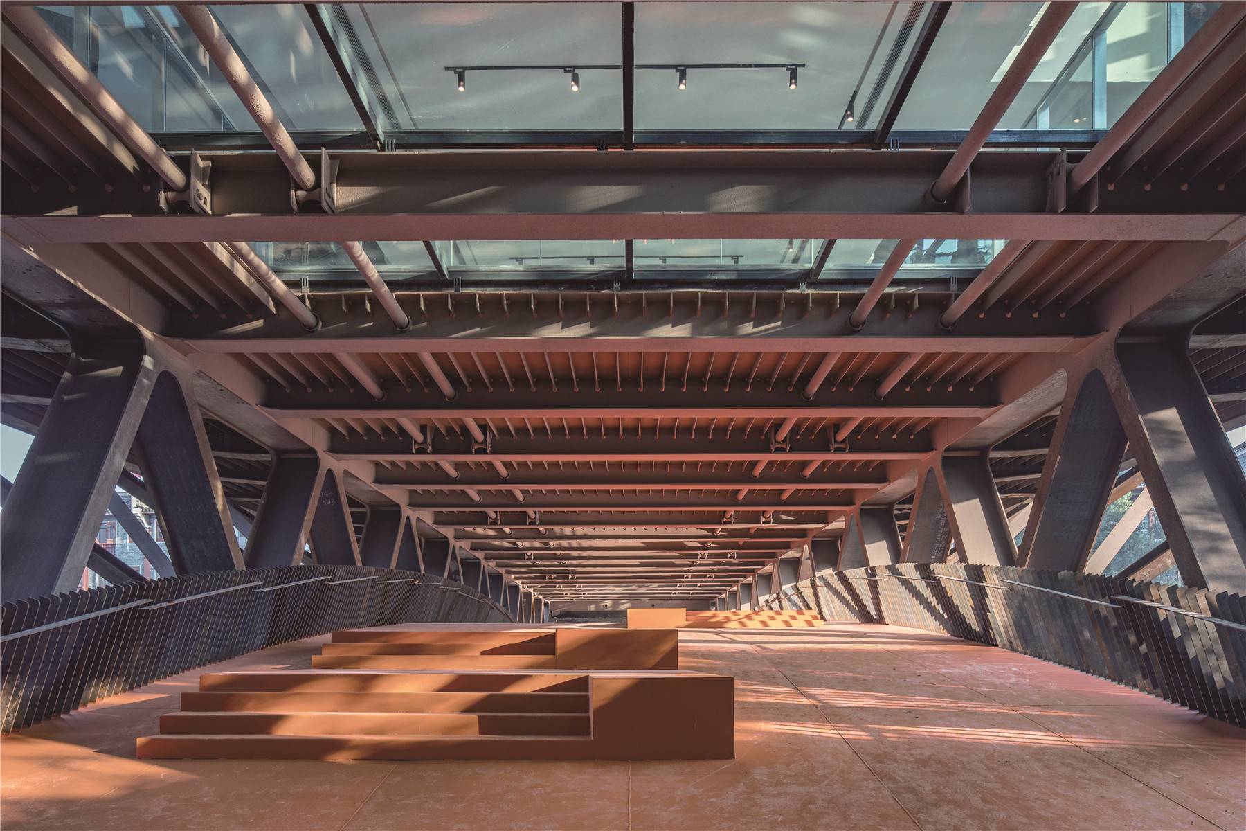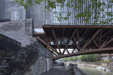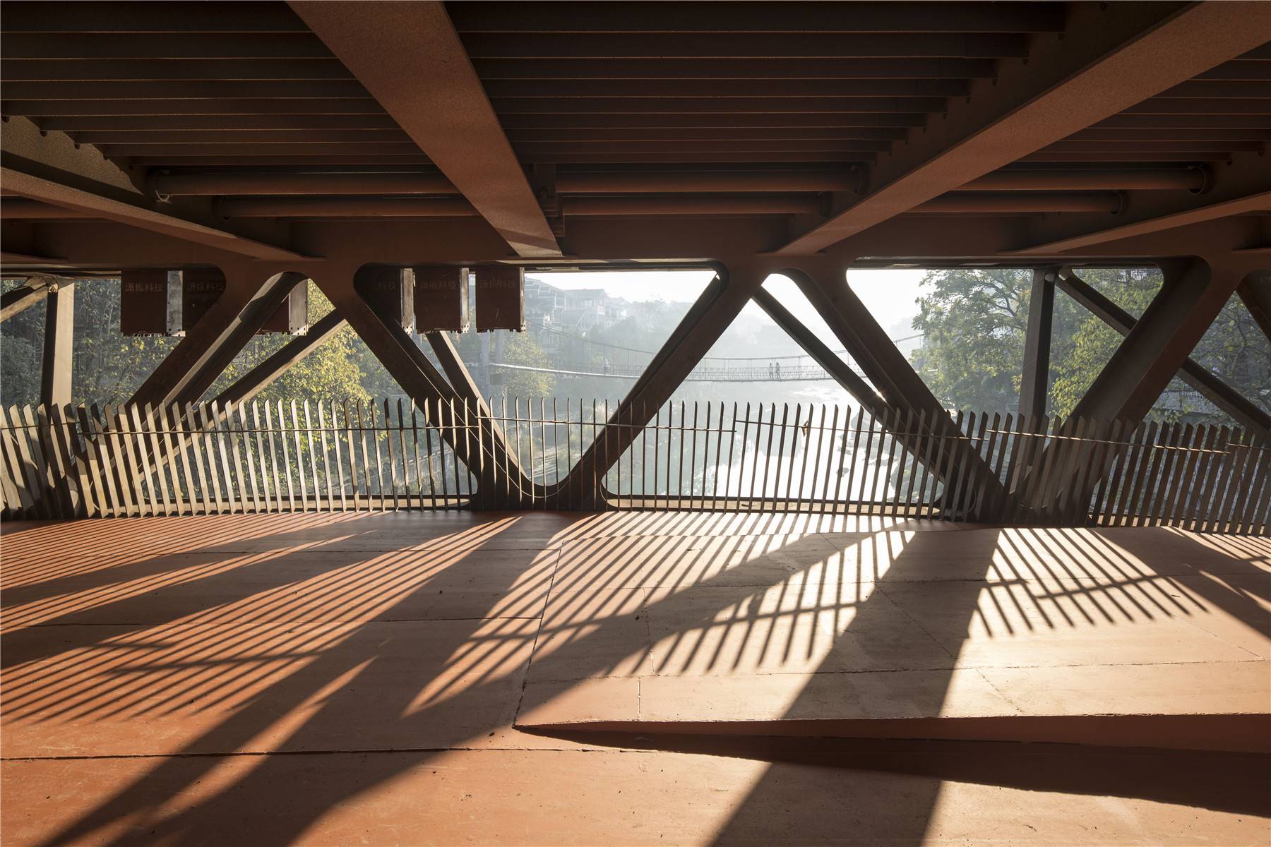 被稱作風(fēng)雨橋的廊橋在我國山區(qū)里有著悠久的歷史。除了跨越河流或山谷的功能,它們也是供旅人休憩、商販擺攤售賣的公共空間。作為對這一古老建筑類型的當(dāng)代詮釋,我們的設(shè)計在保持傳統(tǒng)廊橋的交通與歇腳功能的同時引入新的藝術(shù)內(nèi)容,并將風(fēng)雨橋的形式語言加以現(xiàn)代化。