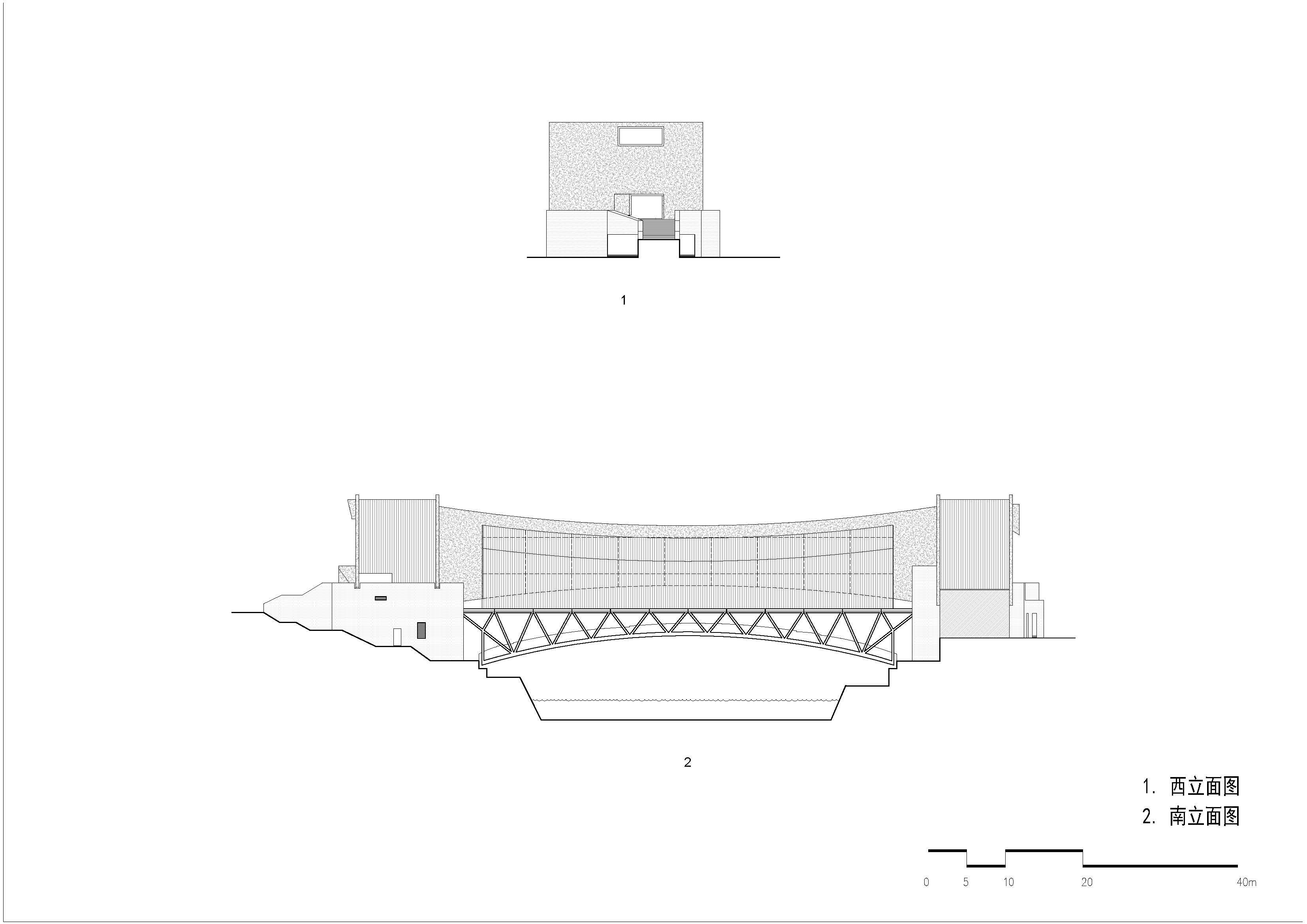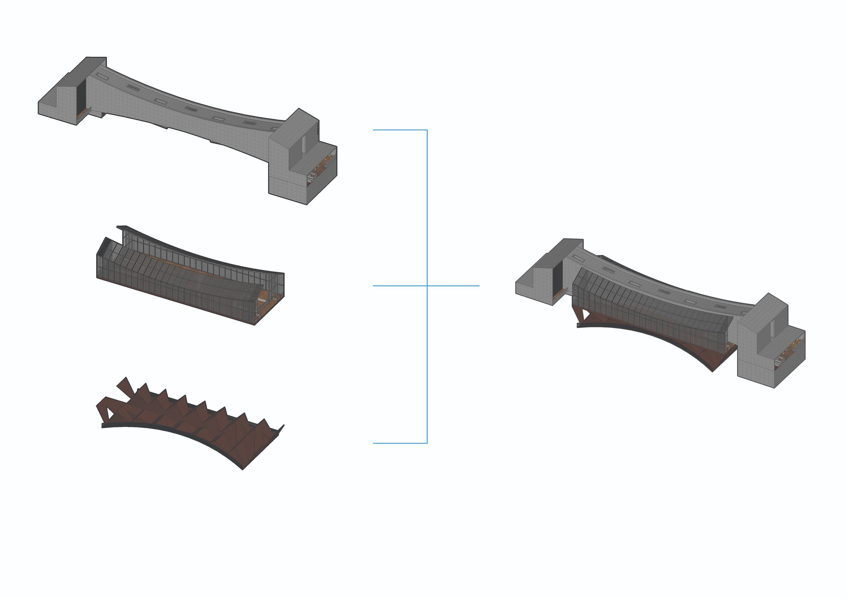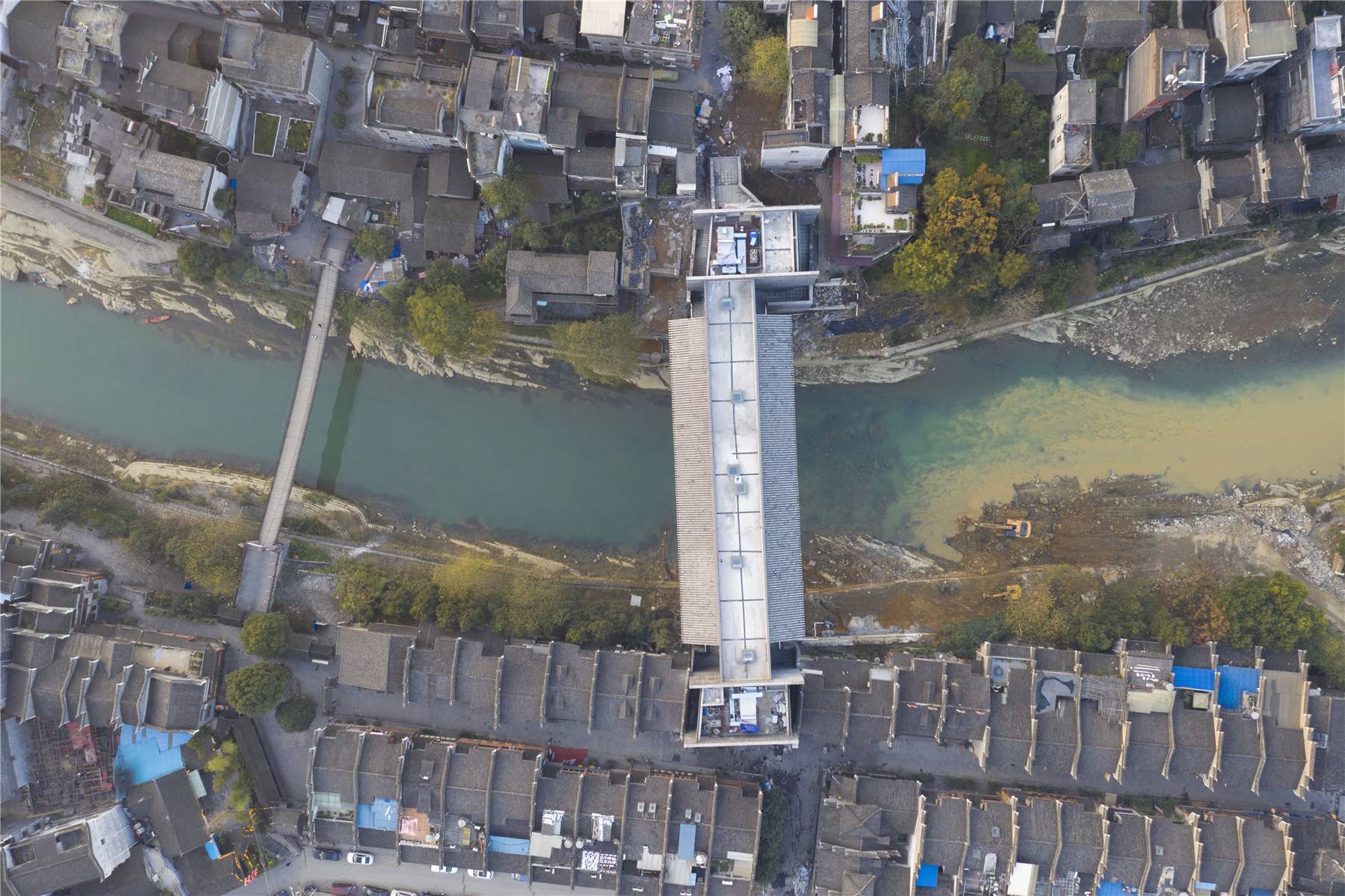 被稱作風(fēng)雨橋的廊橋在我國山區(qū)里有著悠久的歷史。除了跨越河流或山谷的功能,它們也是供旅人休憩、商販擺攤售賣的公共空間。作為對這一古老建筑類型的當(dāng)代詮釋,我們的設(shè)計在保持傳統(tǒng)廊橋的交通與歇腳功能的同時引入新的藝術(shù)內(nèi)容,并將風(fēng)雨橋的形式語言加以現(xiàn)代化。