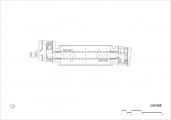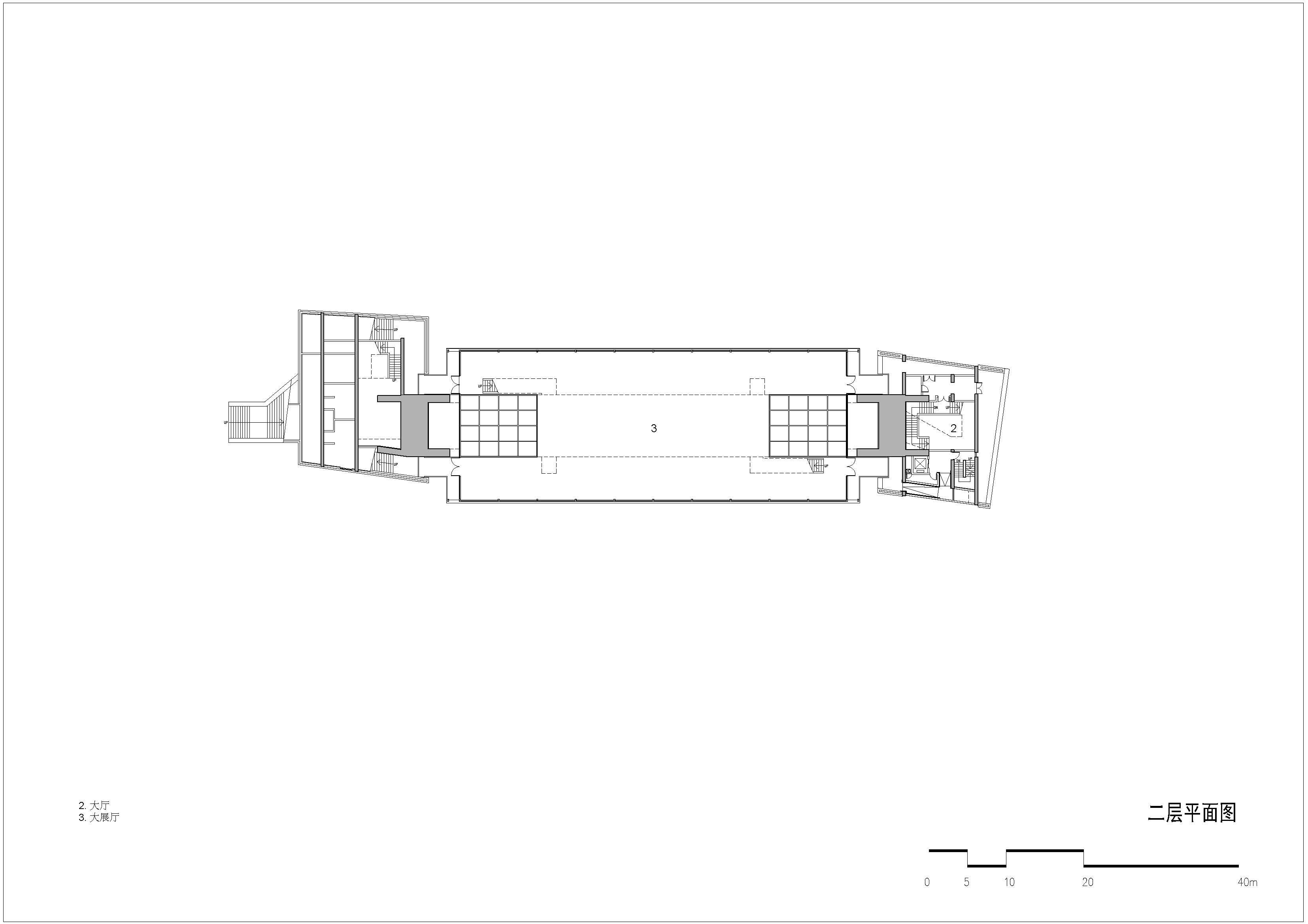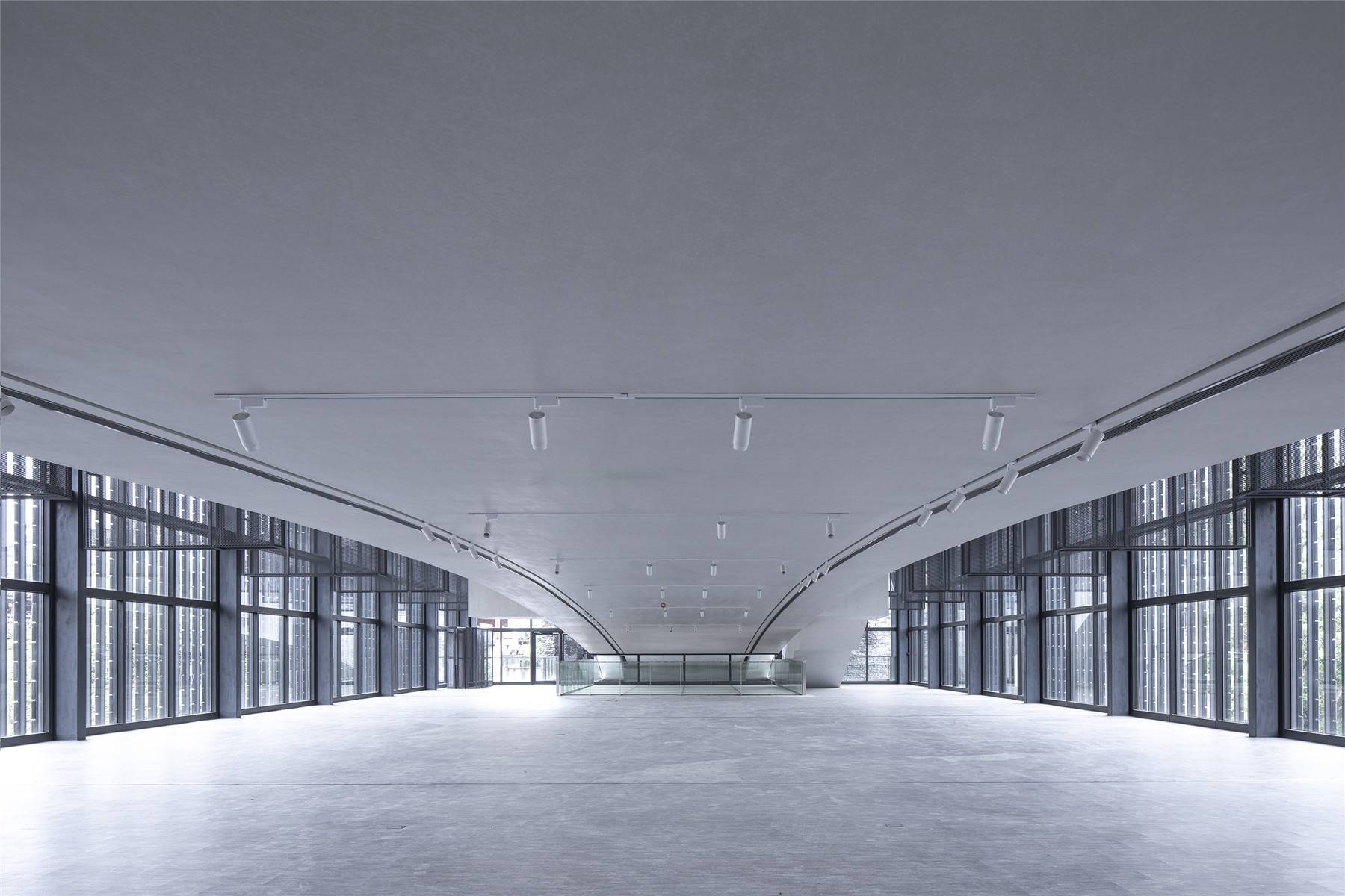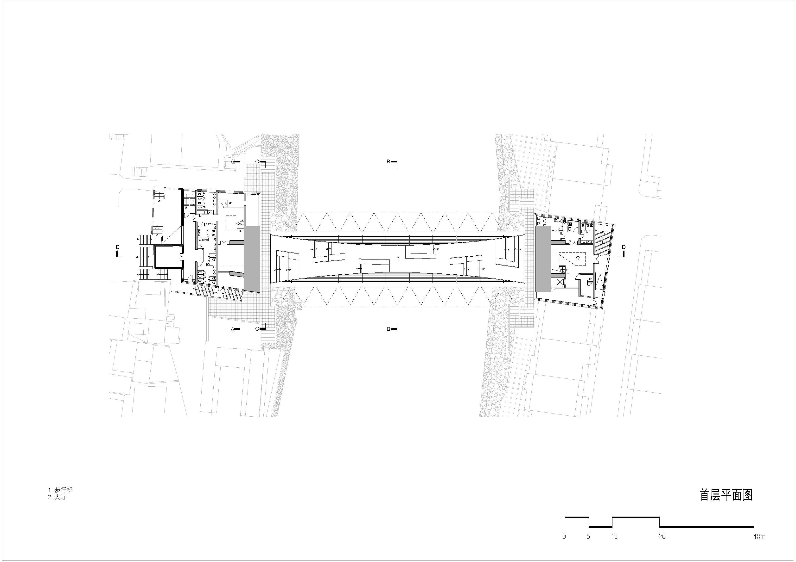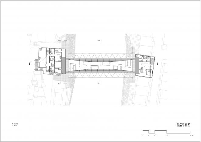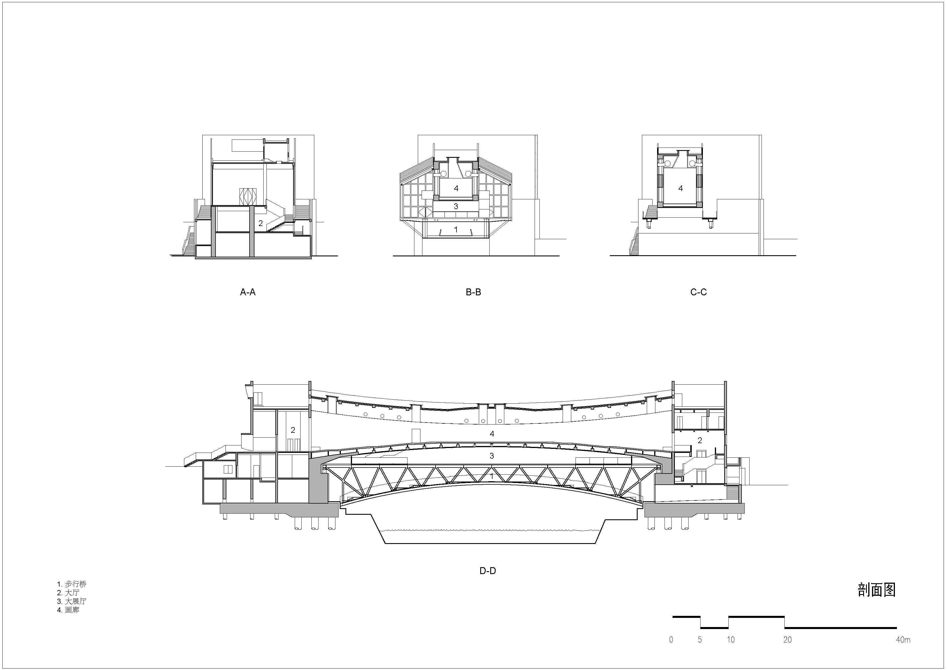 美術(shù)館以橋上橋的形式構(gòu)成。下層的鋼橋是開放的桁架結(jié)構(gòu),為行人通過提供了一個帶頂?shù)慕值溃瑫r也助于疏導(dǎo)洪流;上層的現(xiàn)澆混凝土拱橋內(nèi)部設(shè)有畫廊。兩橋之間是一個由玻璃幕墻和筒瓦遮陽系統(tǒng)圍合而成的大展廳,用于舉辦臨時展覽。美術(shù)館的服務(wù)空間如門廳、行政辦公、商店和茶室則被安置在兩端的橋頭建筑內(nèi)。人們可以從任意一側(cè)河岸進(jìn)入美術(shù)館。