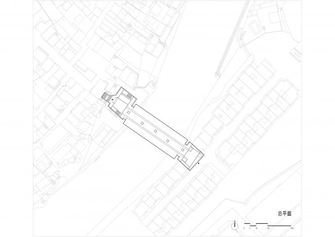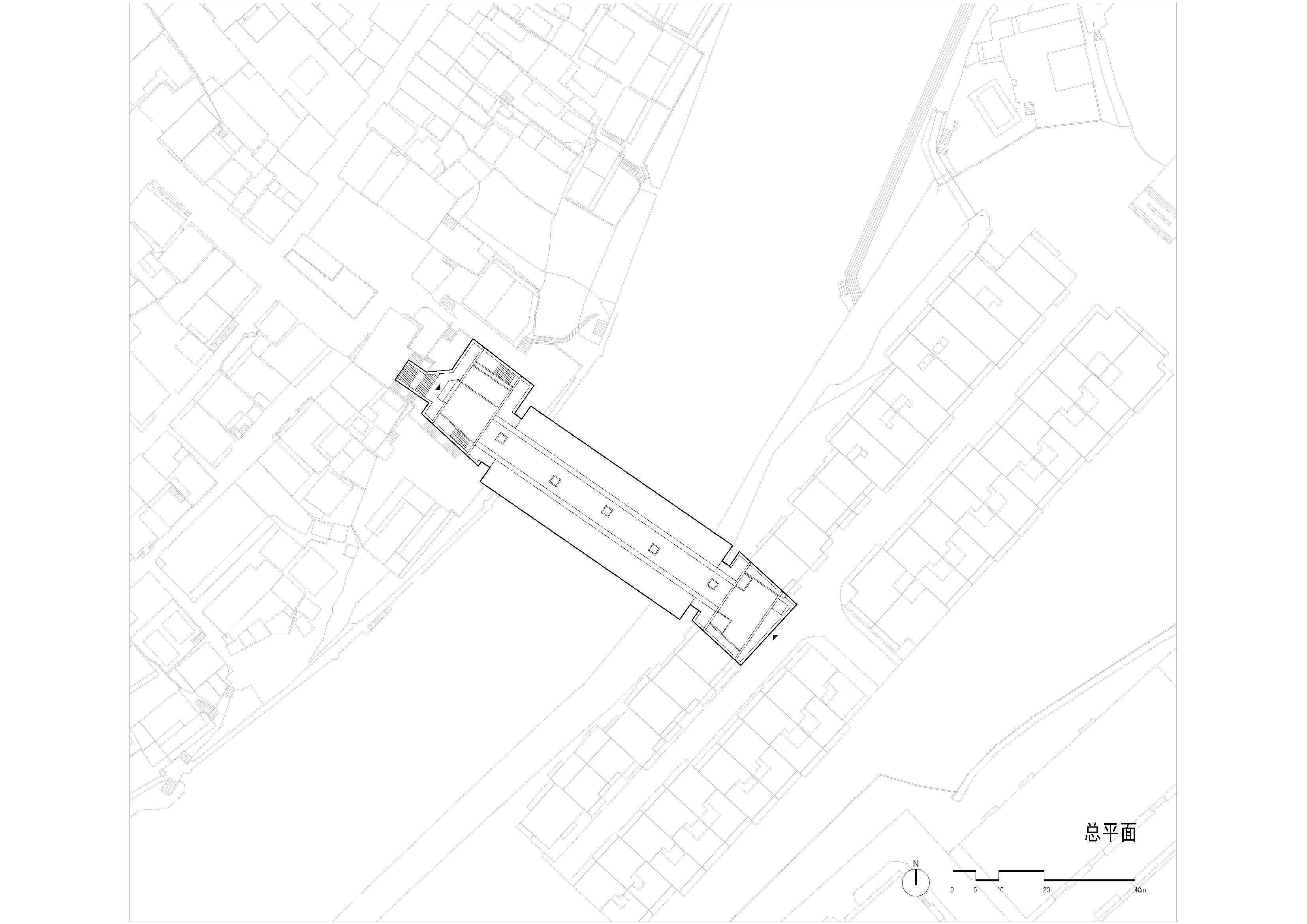 如今,許多諸如博物館和劇院的當(dāng)代文化設(shè)施都被當(dāng)作獨(dú)立的紀(jì)念物而遠(yuǎn)離社區(qū)。我們認(rèn)為美術(shù)館不應(yīng)該從區(qū)位上脫離受眾,因此將其嵌入到現(xiàn)有的城市肌理中,兩岸的橋頭部分與萬溶江畔的排屋緊密相連在一起。這些排屋包含了店鋪、餐館、小旅館,樓上通常便是屋主的居所。因此,吉首美術(shù)館位于河兩岸的入口都可以被視作混合功能街道界面的一部分,從而融入當(dāng)?shù)厝说娜粘I睢?/p>