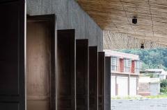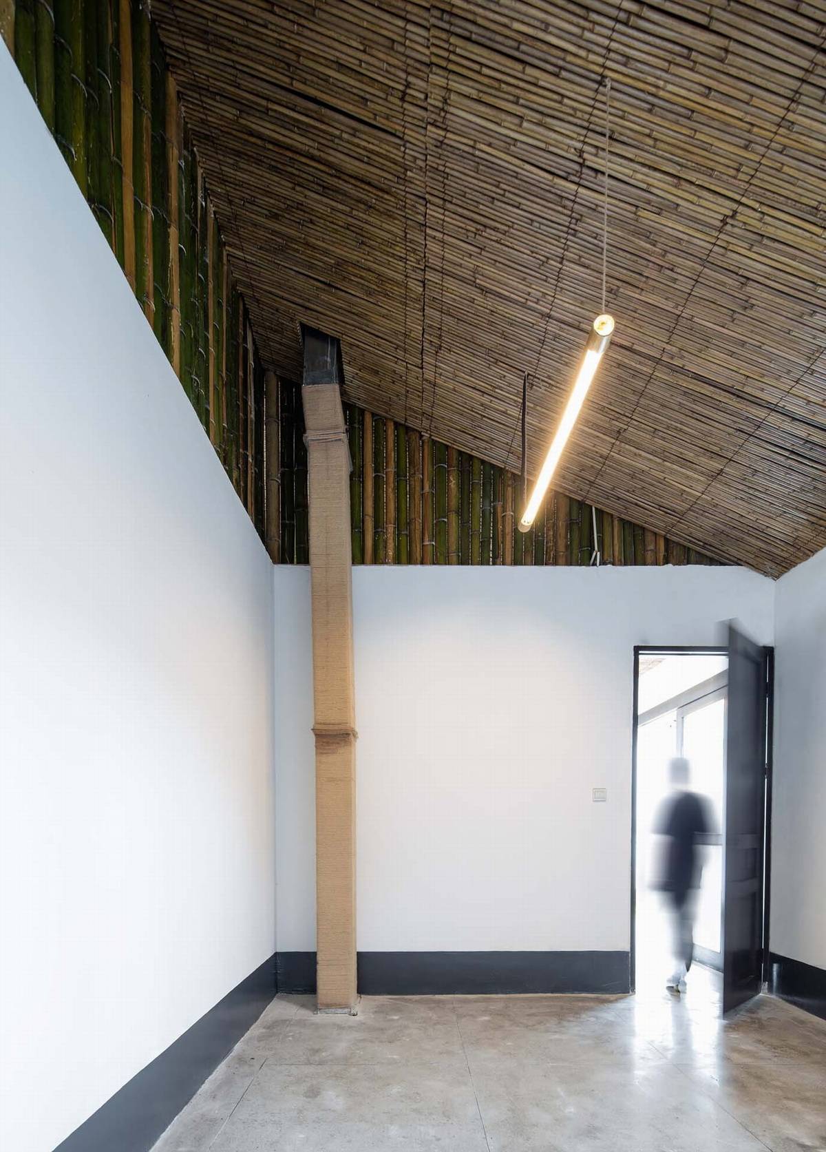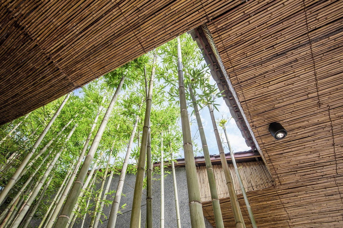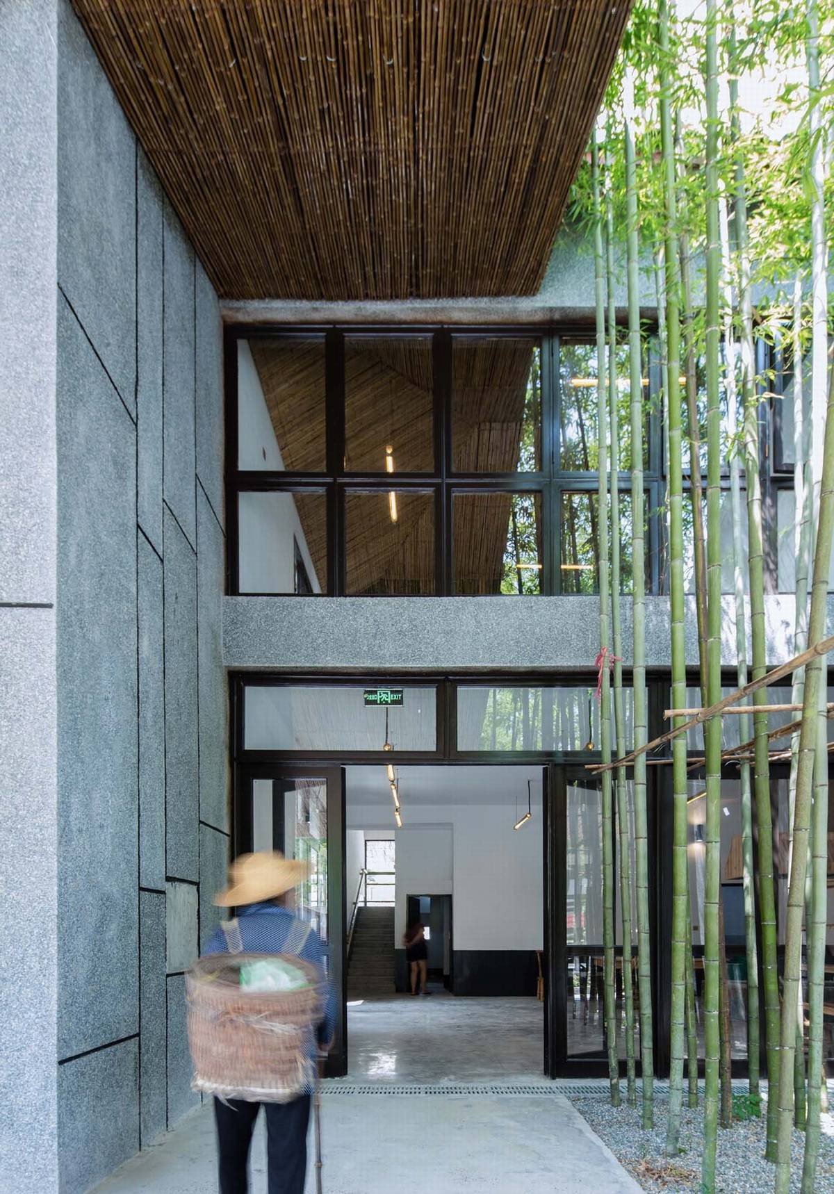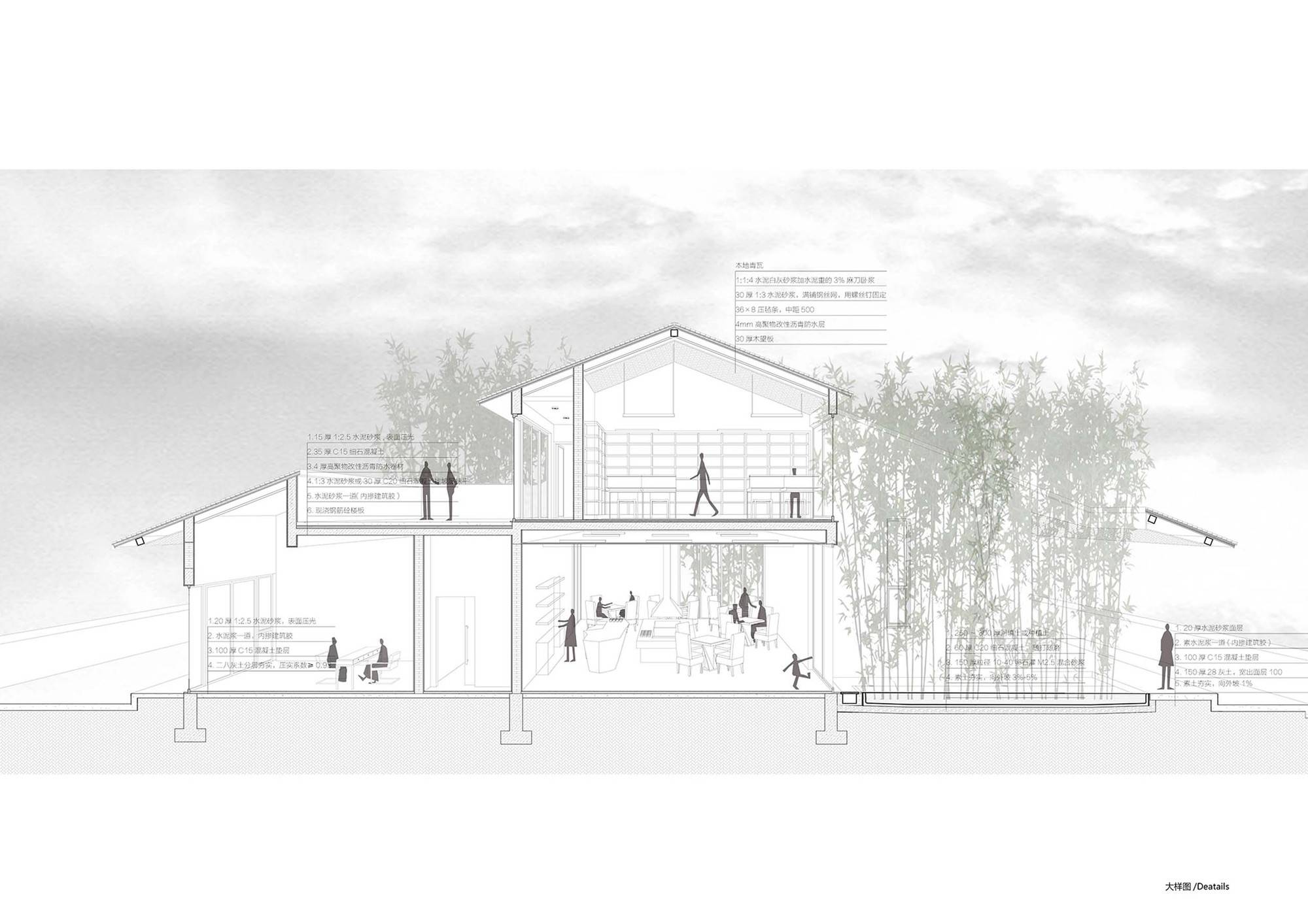 為實(shí)現(xiàn)屋檐處8米的懸挑,采用了混凝土梁挑鋼梁的形式;屋面下再用處理過的細(xì)竹吊頂,提供一種溫暖的尺度和微妙的光線折射。與此相對(duì)應(yīng)的,建筑的外墻采用了黑石子水刷石的處理,地面采用素混凝土打磨,目的是將光線控制在一個(gè)明凈柔和的狀態(tài),從而使屋頂?shù)某叨扰c人的關(guān)系更加明確。墻面水磨石的尺度和分格,暗示了竹節(jié)的紋樣,與屋頂和天井景觀構(gòu)成了自然、人工、抽象,三種竹意向的對(duì)話。