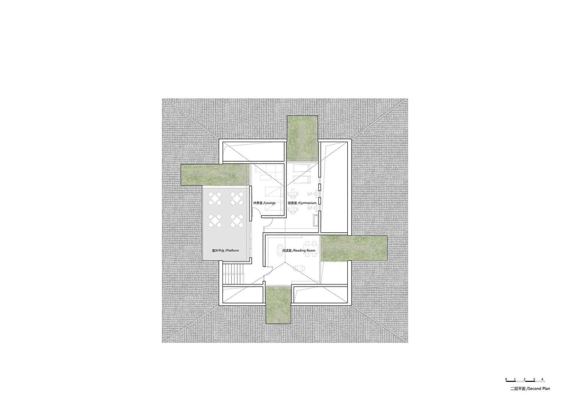 文化大院的設(shè)計(jì)用一個(gè)占滿用地范圍的四坡瓦屋頂來統(tǒng)領(lǐng)結(jié)構(gòu)、材料、細(xì)節(jié)和功能的發(fā)展。我們?cè)谖蓓數(shù)乃钠路謩e打開四處天井,和一層分居四處的輔助空間相互呼應(yīng),為屋檐下的入口營造了看似無意識(shí)但十分流暢的進(jìn)入方式;修茂的竹子從天井中生長出來,為一層核心空間和二層各房間提供景觀和與自然的親密度。