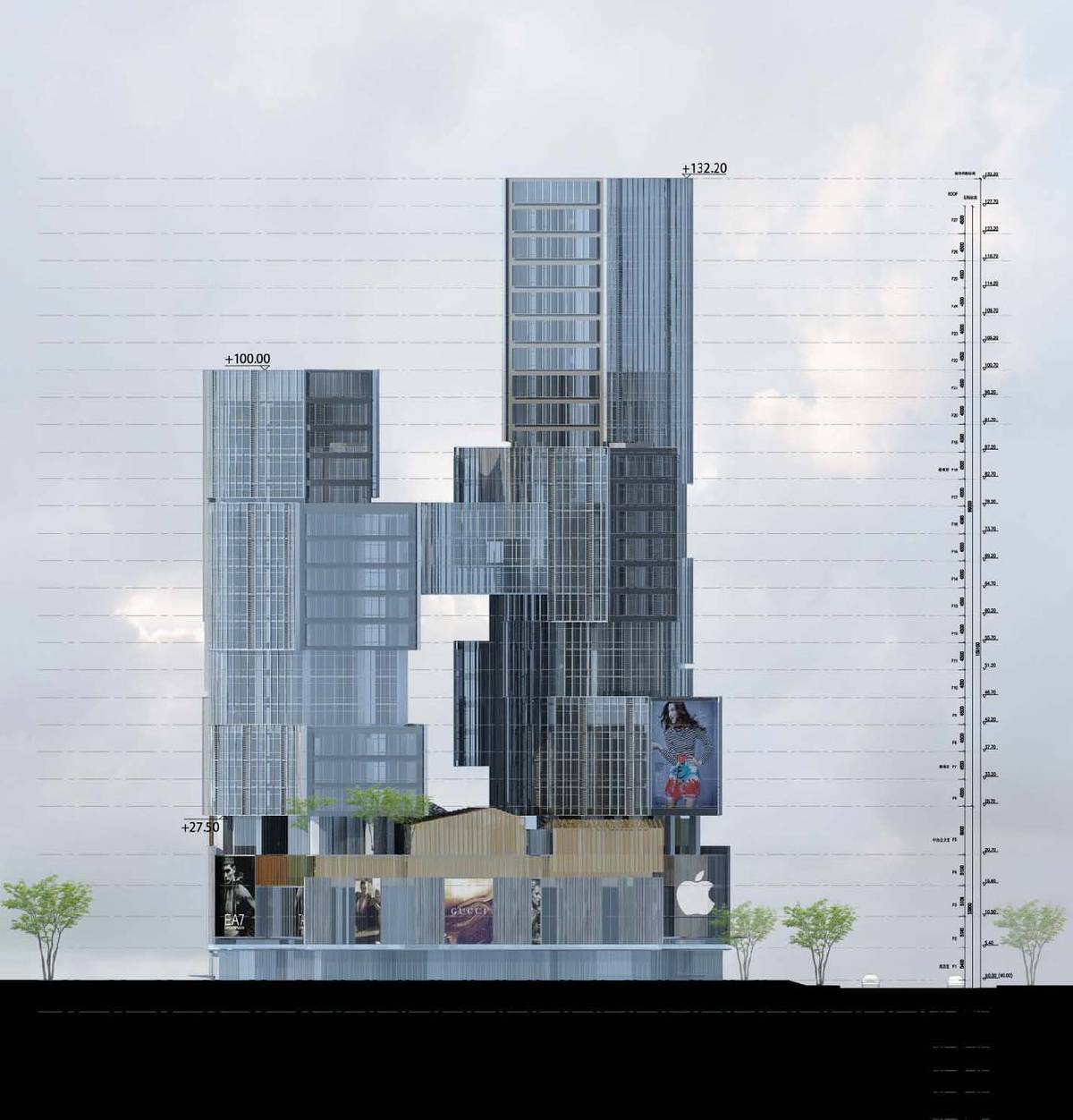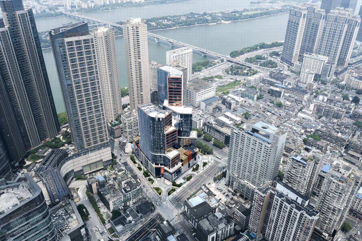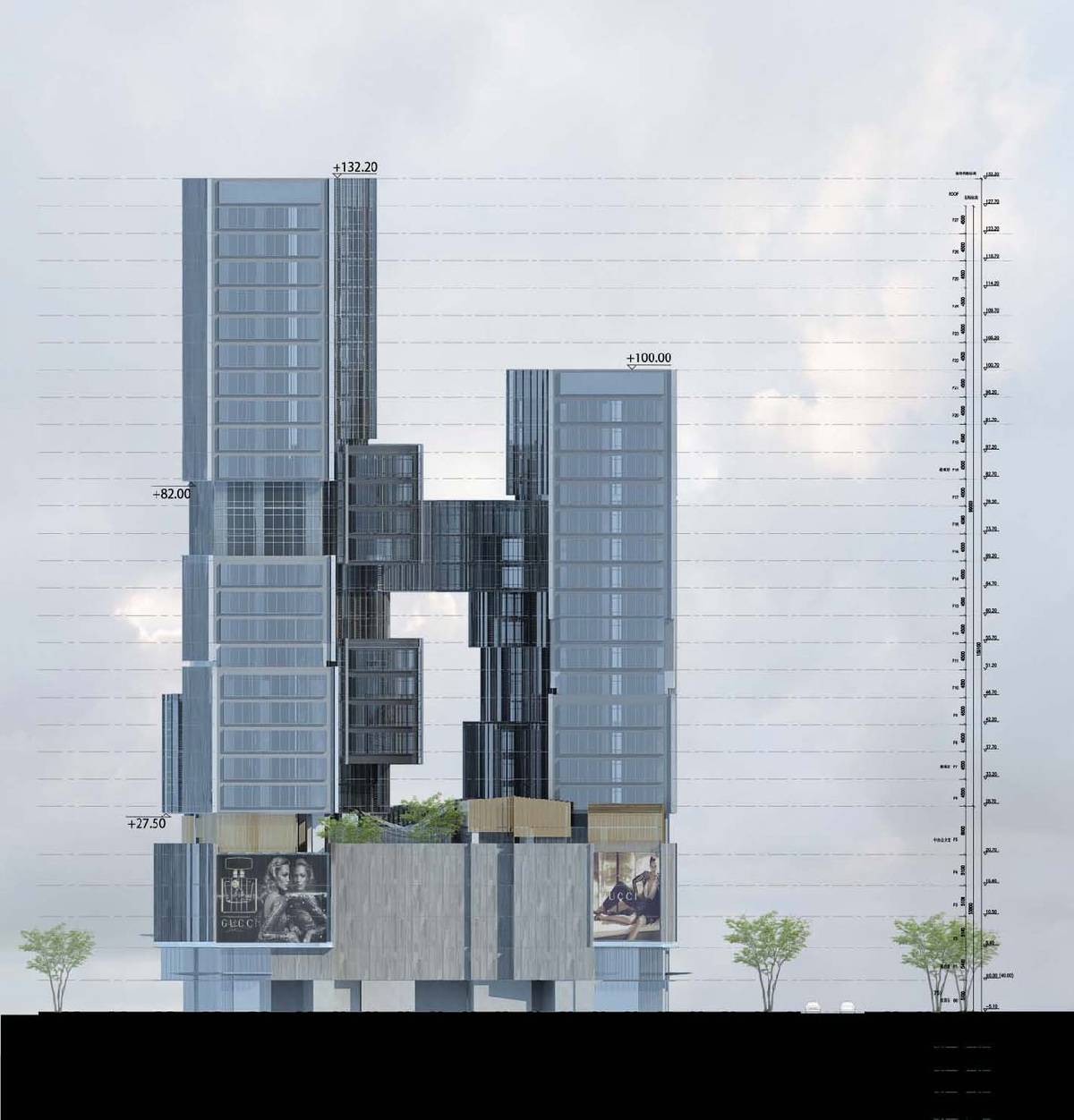 通過Dr. Andy Wen的巧妙設(shè)計,特殊的建筑輪廓結(jié)構(gòu)在突顯長沙人霸蠻的個性、呼應(yīng)地貌特征的同時,也大幅提升了建筑的使用體驗以及與城市的空間聯(lián)系。塔樓形體以視野為設(shè)計導(dǎo)向,通過退進(jìn)、錯位、聯(lián)通形成了豐富的形體,可以從不同角度一覽長沙的山、水、洲、城。通過對朝向方位的精心考量,曲線的建筑輪廓構(gòu)建出具有拔風(fēng)效應(yīng)的半圍合微觀環(huán)境,營造出自然通風(fēng)、日照優(yōu)良的環(huán)境條件。塔樓退進(jìn)形成的露臺與公共空間,提供了更多的景觀平臺,助力打造城市會客廳,而裙樓屋頂?shù)倪^渡平臺也為市民提供了休閑新去處。