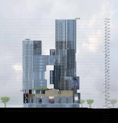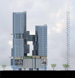 裙樓體量在各方向有不同的退進(jìn),頂層一個巨型的玻璃穹頂,猶如洞穴的入口,可以窺見其中明黃的燈光和往來的人流,如同黃龍洞一般。裙樓與塔樓之間則以一棟棟用現(xiàn)代建筑語匯重新詮釋的古村落房屋作為過渡的架空平臺,傳統(tǒng)房屋形式與現(xiàn)代金屬材質(zhì)形成了鮮明的對比,亦古亦今,極富沖擊力。裙房之上是兩座板型塔樓,通過體量的錯落扭轉(zhuǎn)以及層與層之間參差進(jìn)退,模擬了張家界嶙峋山石,營造出生命蓬勃的自然景象。南北兩棟塔樓以連橋連接,形成類似天門洞與天生橋的景觀,而錯落的體量間形成的平臺,猶如高山臺地,通過綠化即可成為屋頂花園。