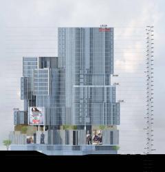 設(shè)計用直觀的立面語言對建筑功能加以區(qū)分。裙樓立面除首層為了商業(yè)展示部分使用玻璃幕墻外,主要使用石材搭配橫向的玻璃櫥窗;而塔樓立面則以縱向線條為主,與裙樓建筑設(shè)計語言形成呼應(yīng),又界限分明。