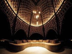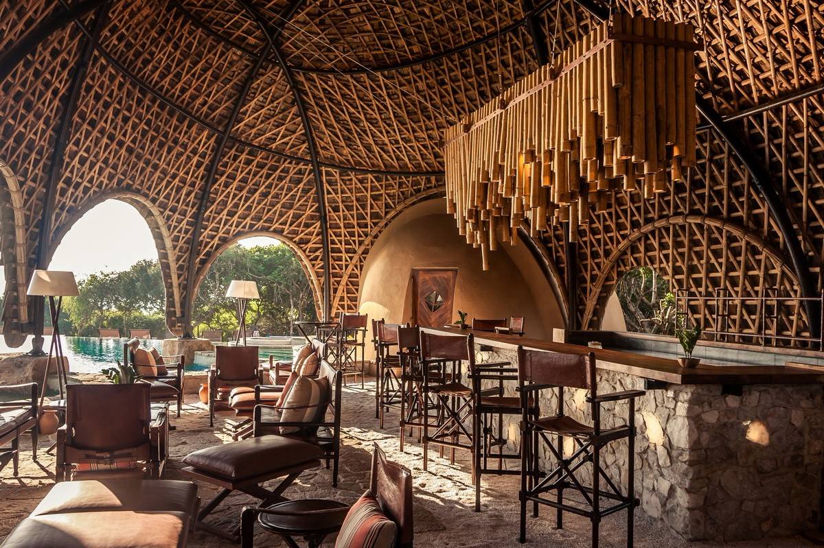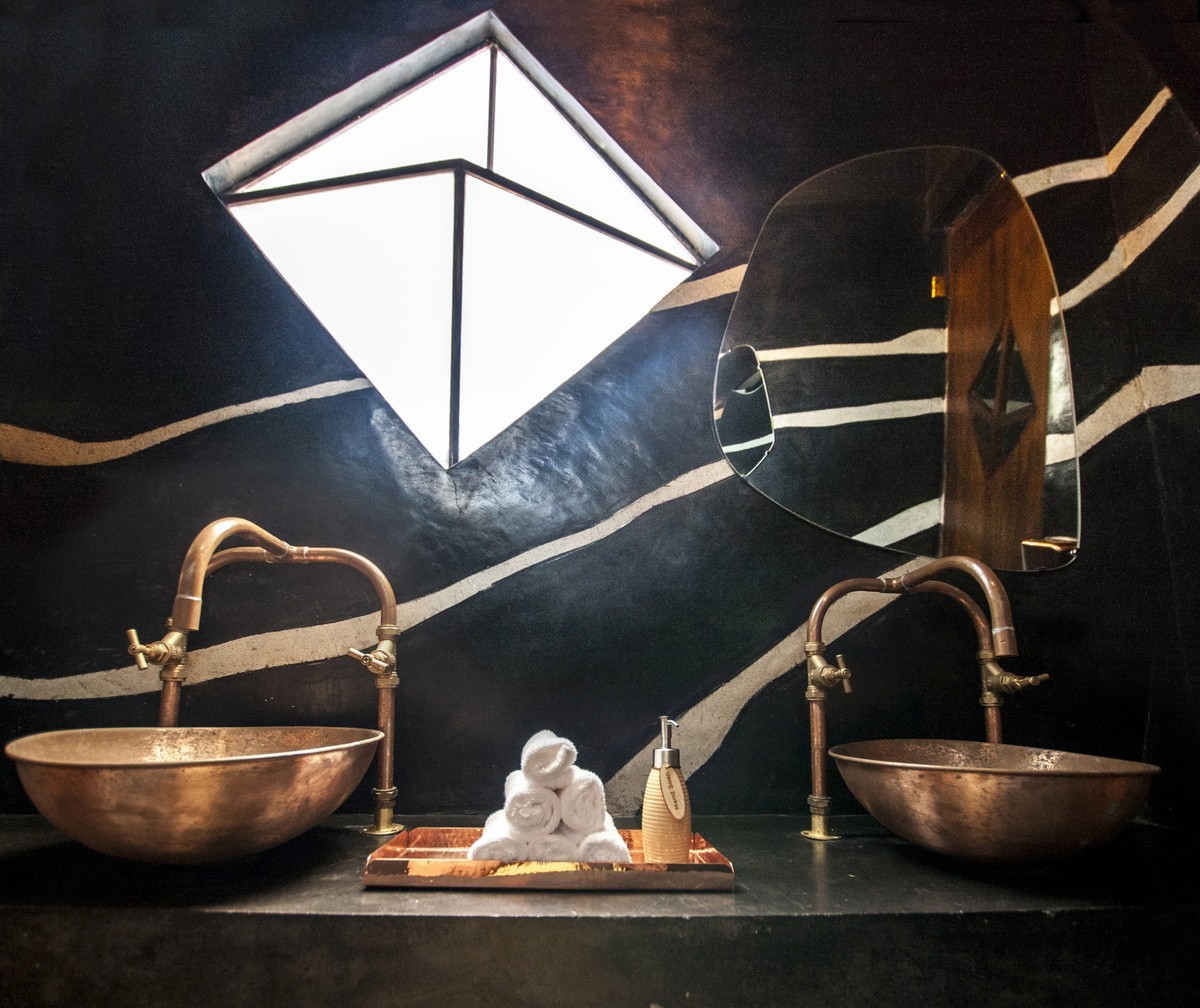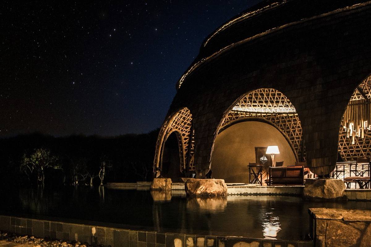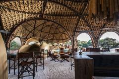 建筑的重點(diǎn)是巨石的外部,而內(nèi)部的特點(diǎn)則是仿佛隱藏在洞穴、水晶和珍貴礦物的脈絡(luò)之下的寶藏。在這里可以捕捉到一種發(fā)現(xiàn)、冒險(xiǎn)和迷人的感覺,把生態(tài)的奢侈和當(dāng)?shù)氐膬?yōu)勢結(jié)合在一起。設(shè)計(jì)的重點(diǎn)放在高質(zhì)量的材料上,石、石英和泥磚等當(dāng)?shù)夭牧吓c豐富的銅、黃銅、水磨石、木材、竹子和紡織品搭配在一起,與現(xiàn)場環(huán)境相呼應(yīng)。設(shè)計(jì)的亮點(diǎn)包括在餐廳和酒吧里流動(dòng)的游泳池,像夜空一樣明亮的燈光,在餐廳10米高的竹穹頂上懸掛著一盞亮閃閃的銅葉樹,泥磚的座位裝置和強(qiáng)調(diào)主空間的竹枝吊燈等。