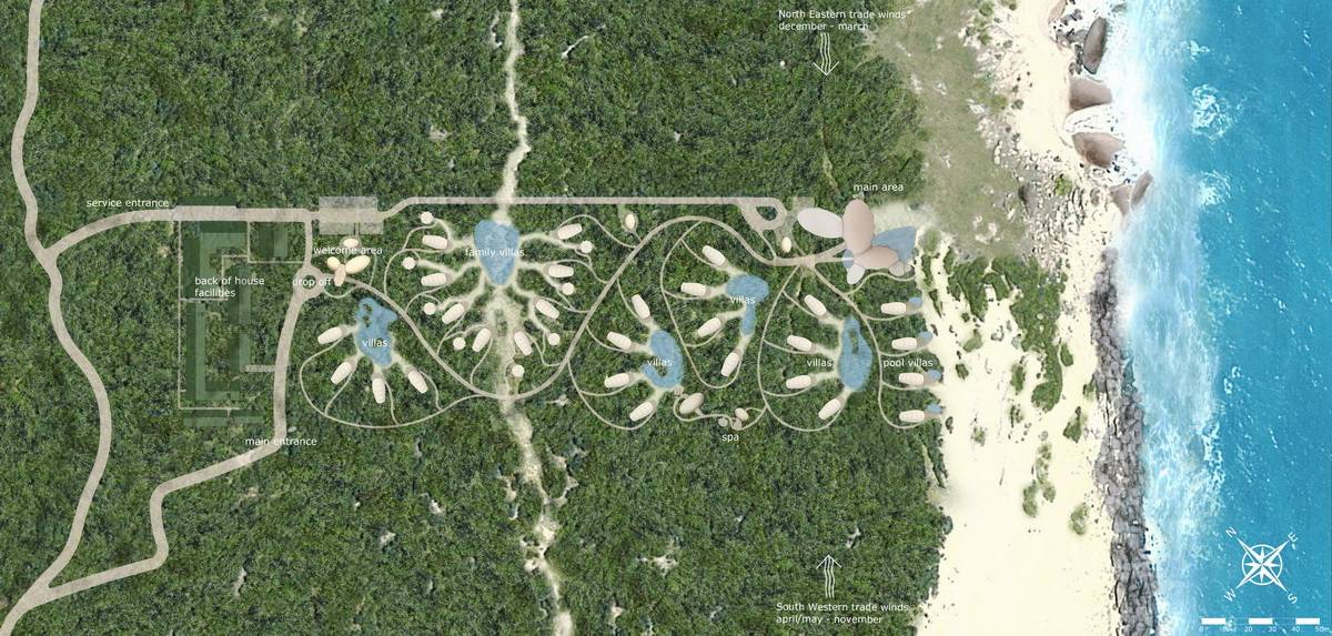 Nomadic Resorts 和 Bo Reudler 工作室聯(lián)合設(shè)計(jì)和建造了這座壯觀的自然海岸帳篷酒店,這是斯里蘭卡首家?guī)づ窬频???沙掷m(xù)的景觀和傳統(tǒng)在酒店的設(shè)計(jì)中不斷交織。這個(gè)位于斯里蘭卡南部 Yala 國家公園邊,含有36個(gè)帳篷的營地在2017年11月迎來了第一批客人。生態(tài)度假村有機(jī)地融合到基地環(huán)境中,基地周圍是與俯瞰印度洋的崎嶇沙質(zhì)海岸融為一體的旱地森林。5個(gè)酒店組團(tuán)設(shè)計(jì)希望訪者對(duì) Yala 產(chǎn)生親密的體驗(yàn),利用該地區(qū)的植物群、動(dòng)物群和文化,對(duì)周圍景觀產(chǎn)生最小的影響。在地影響尤其重要,從當(dāng)?shù)氐膫鹘y(tǒng)和材料到社區(qū)都對(duì)設(shè)計(jì)產(chǎn)生了影響。