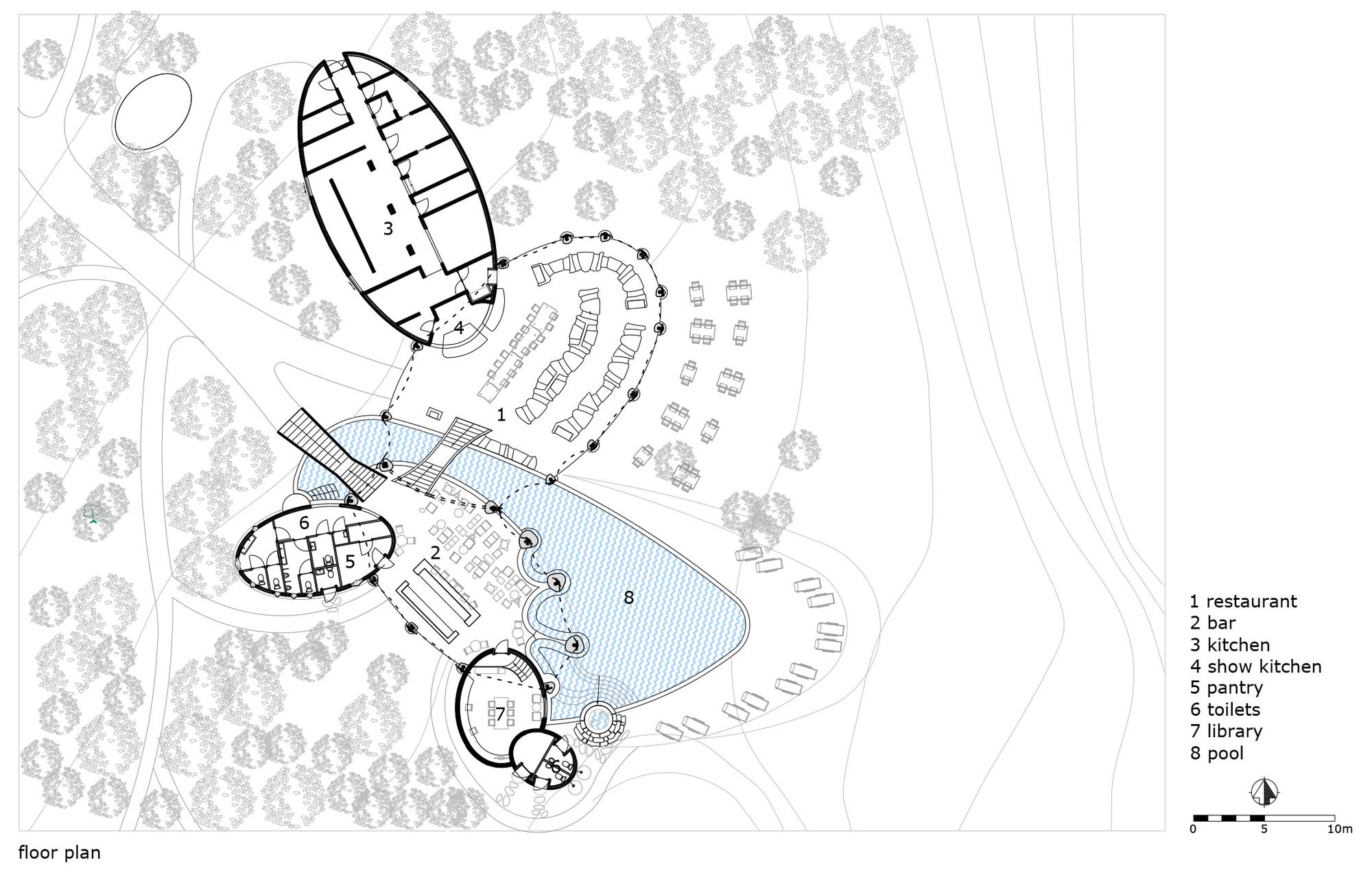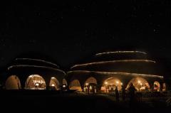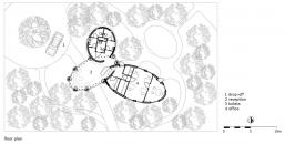 該項(xiàng)目由 Dilmah Tea 公司旗下的Resplendent Ceylon公司委托進(jìn)行,該公司獨(dú)特的度假村為好奇的旅行者提供了與斯里蘭卡的歷史、文化和自然有關(guān)的各種體驗(yàn)。建筑在雅拉的景觀中自然形成,宏觀上仿佛在公園內(nèi)散布的圓形巨石,在微觀上又好像白蟻丘。為了適應(yīng)人體尺度,營地的主建筑看起來就像是在場地兩端有機(jī)地聚集在一起的卵石狀亭子。大的開放體量與小的封閉圓屋頂相交,提供更私密的功能。餐廳和圖書館入口處的歡迎區(qū)是一個(gè)蜿蜒曲折的自然景觀,線性排列著一叢叢繭狀的張力膜結(jié)構(gòu)。
