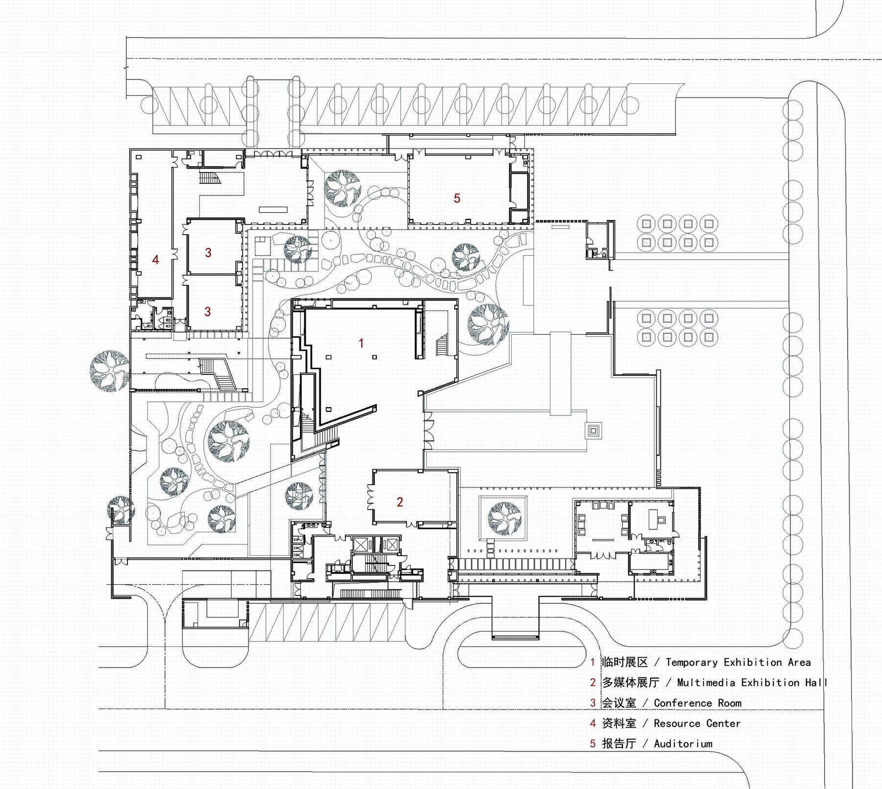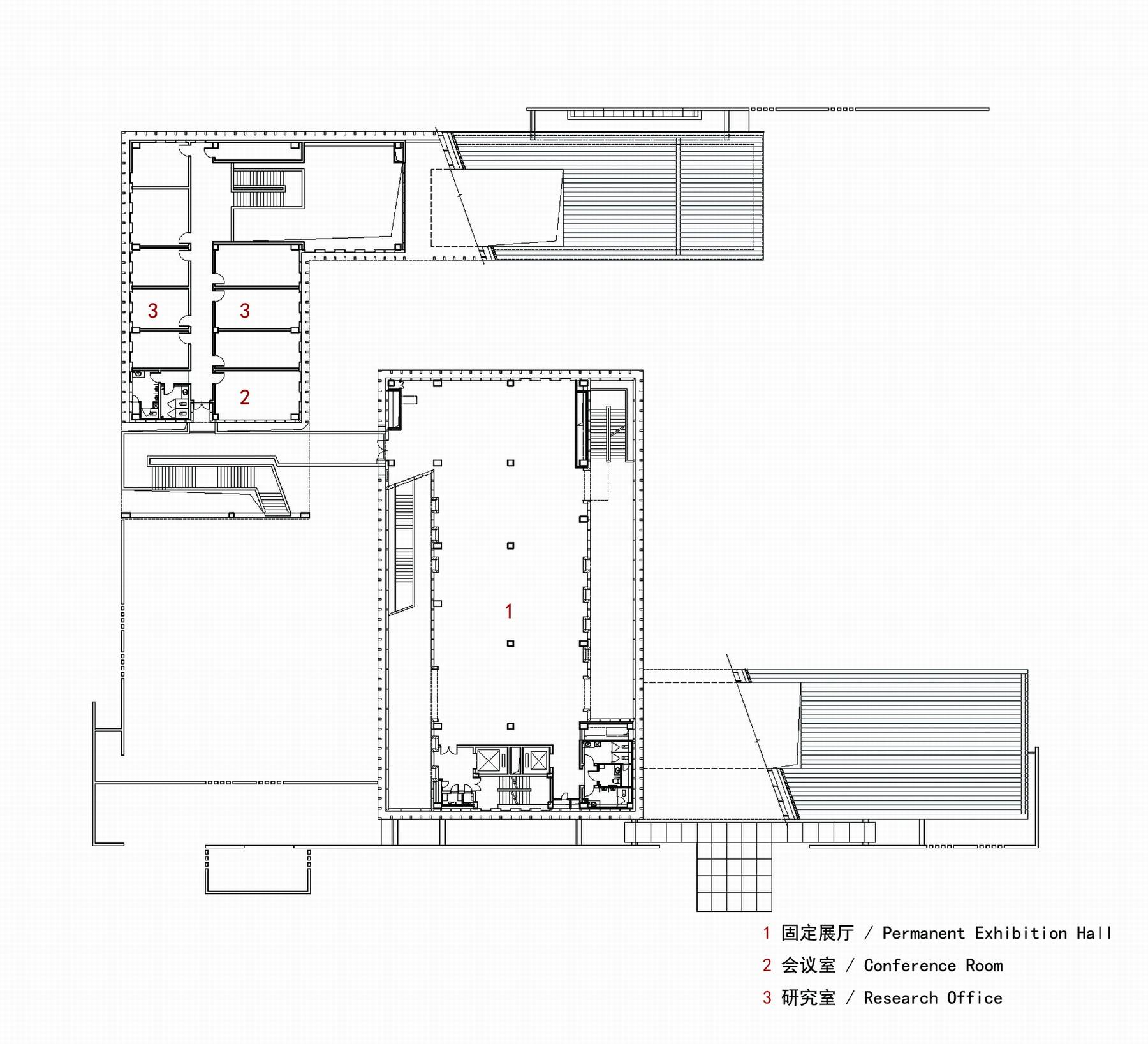 訪客經(jīng)過(guò)建筑與片墻圍合形成的東院進(jìn)入博物館一層,其整體塑造更偏向于現(xiàn)代幾何的造園手法,西院以自然的“柔”對(duì)比呼應(yīng)了東院現(xiàn)代的“剛”. 兩個(gè)側(cè)院分別為貴賓接待書房和多功能報(bào)告廳。
