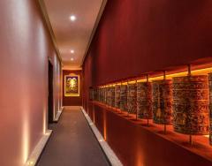 訪客經(jīng)過(guò)建筑與片墻圍合形成的水庭進(jìn)入博物館一層,博物館首層的主體功能為臨時(shí)展區(qū)及多媒體展廳,二層及三層為不同主題的固定展廳,通高明亮的邊庭使其形成整體,亦串聯(lián)組織上下樓梯交通。訪客參觀完首層臨時(shí)展區(qū)后通過(guò)西側(cè)“L”形樓梯上到二層固定展廳,并繼而通過(guò)東北角樓梯上到三層參觀。當(dāng)訪客來(lái)到三層精品展區(qū)時(shí),轉(zhuǎn)經(jīng)筒展廊主導(dǎo)的公共空間氛圍驟變,之前參觀過(guò)程中伴隨的自然融入、輕松明快的感覺(jué),瞬間被一種黑暗神秘的感官體驗(yàn)所取代,這種氛圍上的反差營(yíng)造出整個(gè)觀展序列的高潮。