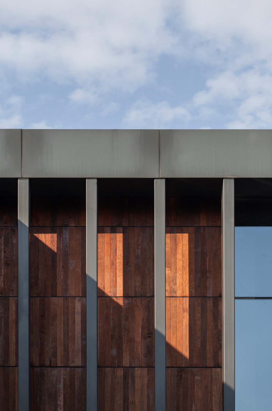 建筑師在喜馬拉雅博物館與研究中心材料類型、色彩和質(zhì)感的選擇上,延續(xù)了四川傳統(tǒng)民居用材質(zhì)樸的特點(diǎn),建筑立面處理針對(duì)空間朝向的不同特性,被概括為兩種模式——博物館主體形態(tài)莊嚴(yán)穩(wěn)重,立面設(shè)計(jì)更傾向于古城民居沿街立面虛實(shí)相生的構(gòu)成手法;而面向景觀庭院、對(duì)各層采光通風(fēng)有更高要求的研究中心,則借鑒了古城民居落地花格木墻的通透性手法。