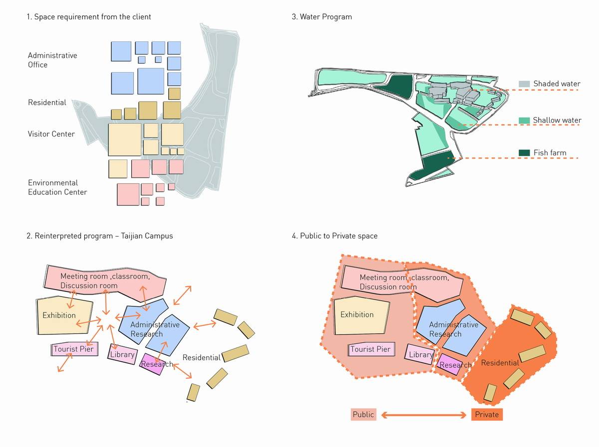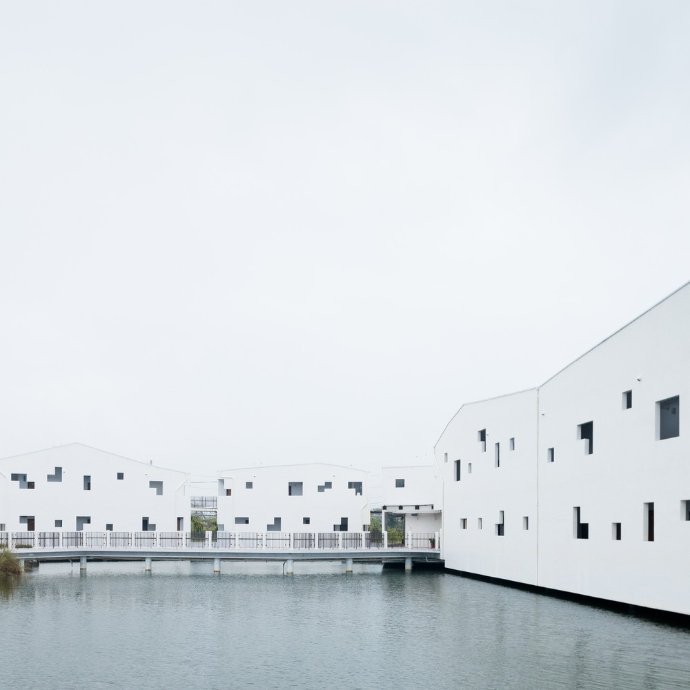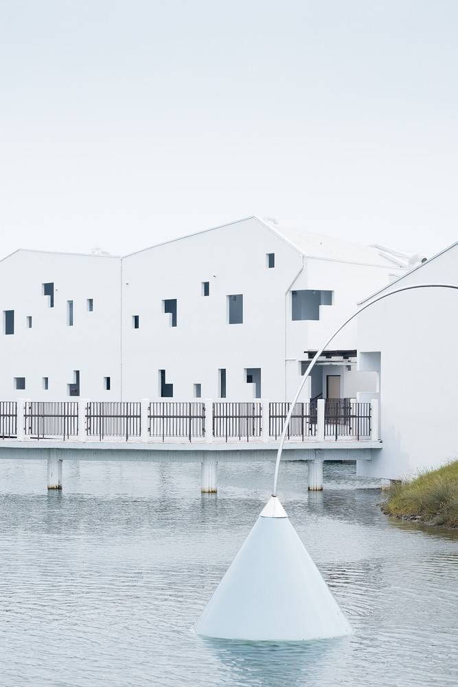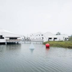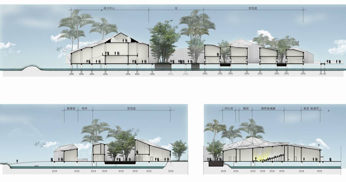 建筑在養(yǎng)魚場中拔地而起,采高腳屋的構造形式,體現(xiàn)了場地的自然環(huán)境。它的設計是由不同的因素決定的:建筑的功能性,公共無障礙環(huán)境等等。建筑的外觀是由建筑體塊與高度等多重因素推敲而成的。小路和水路網(wǎng)將建筑體塊分割成更小的形式,以保證足夠的通風并減少太陽熱量。
