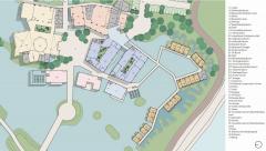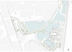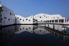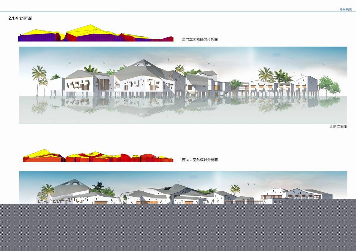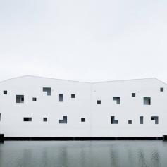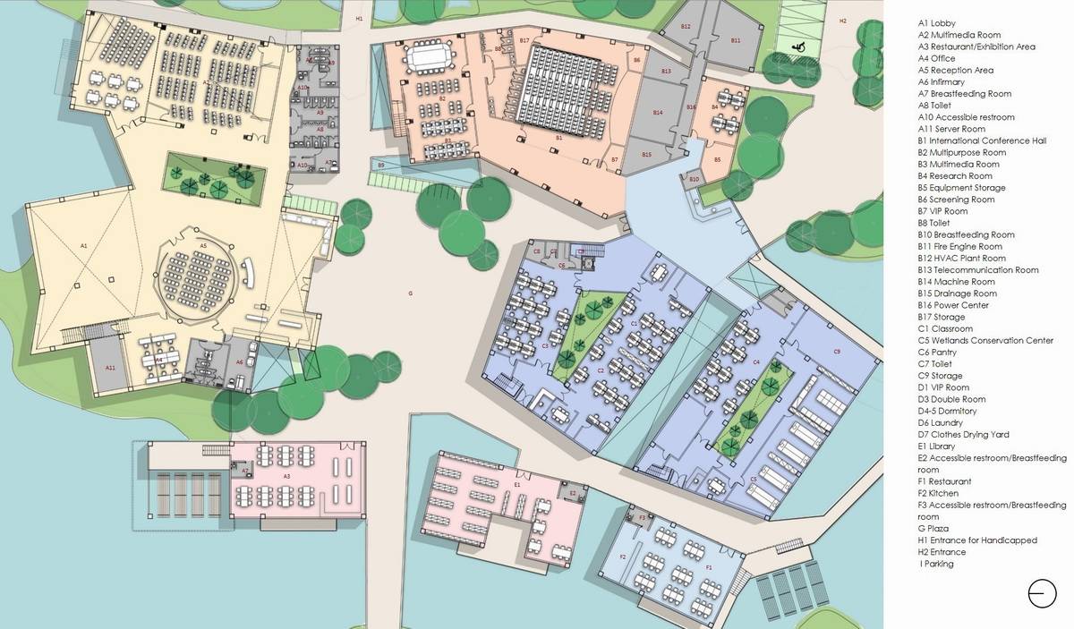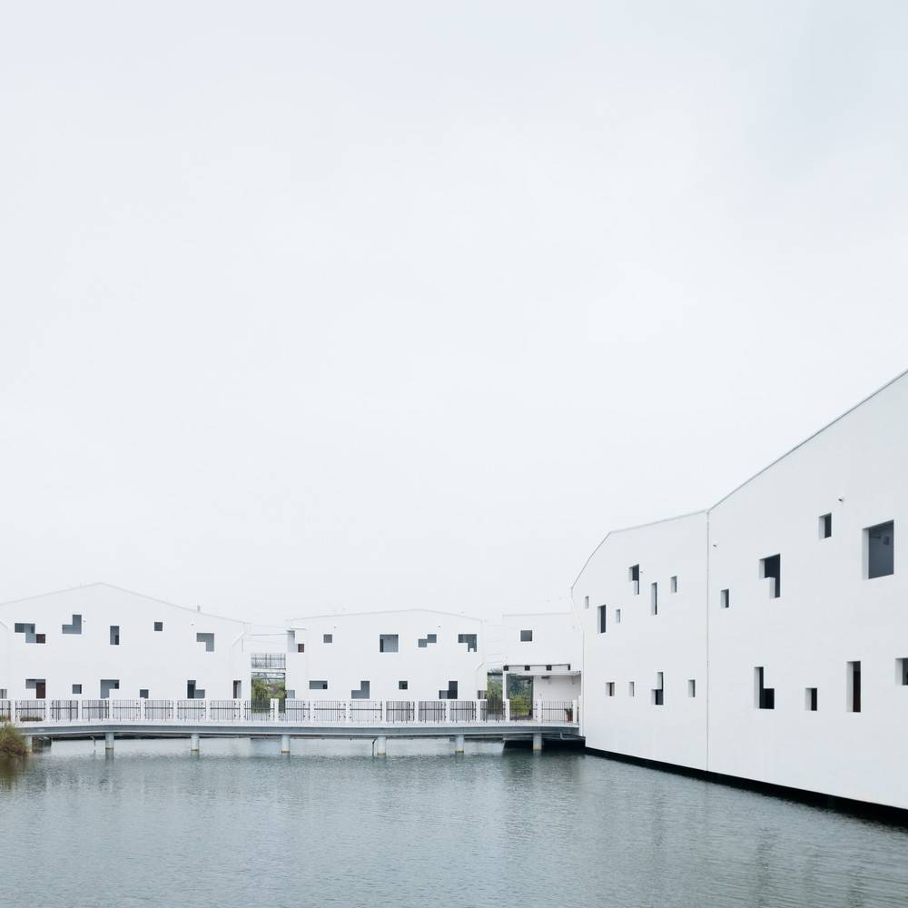 建筑在養(yǎng)魚場中拔地而起,采高腳屋的構造形式,體現(xiàn)了場地的自然環(huán)境。它的設計是由不同的因素決定的:建筑的功能性,公共無障礙環(huán)境等等。建筑的外觀是由建筑體塊與高度等多重因素推敲而成的。小路和水路網(wǎng)將建筑體塊分割成更小的形式,以保證足夠的通風并減少太陽熱量。