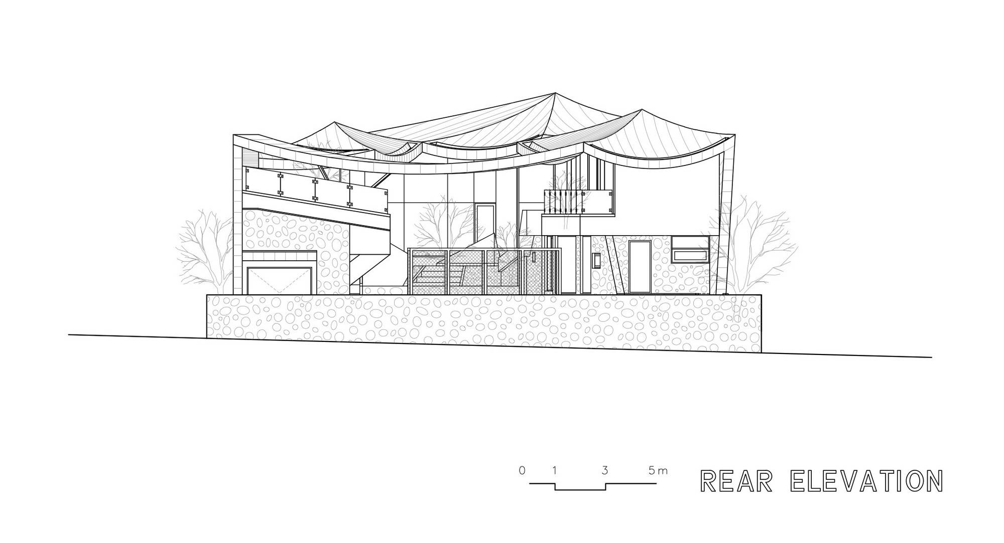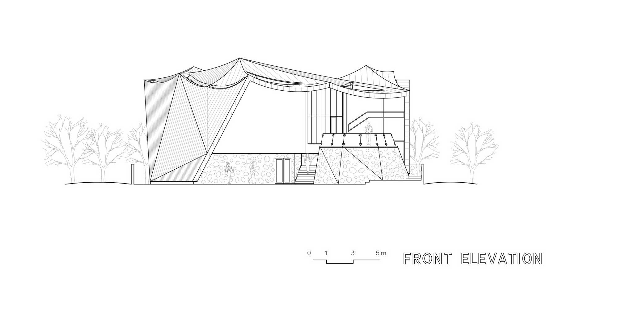 通過(guò)引入“Cheoma”式懸臂屋頂,不僅能夠抵御惡劣的天氣條件,同時(shí)還能將傳統(tǒng)建筑語(yǔ)言轉(zhuǎn)換為現(xiàn)代建筑語(yǔ)言。并采用橢圓形的圖案來(lái)裝飾墻面,這源自于韓國(guó)傳統(tǒng)的石墻,留下一絲過(guò)去的痕跡。