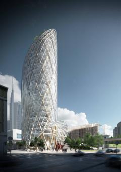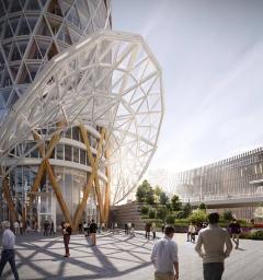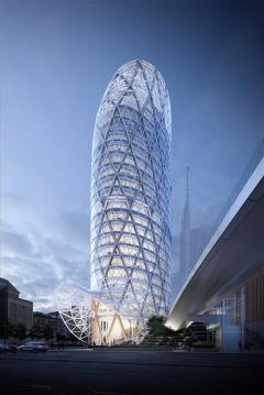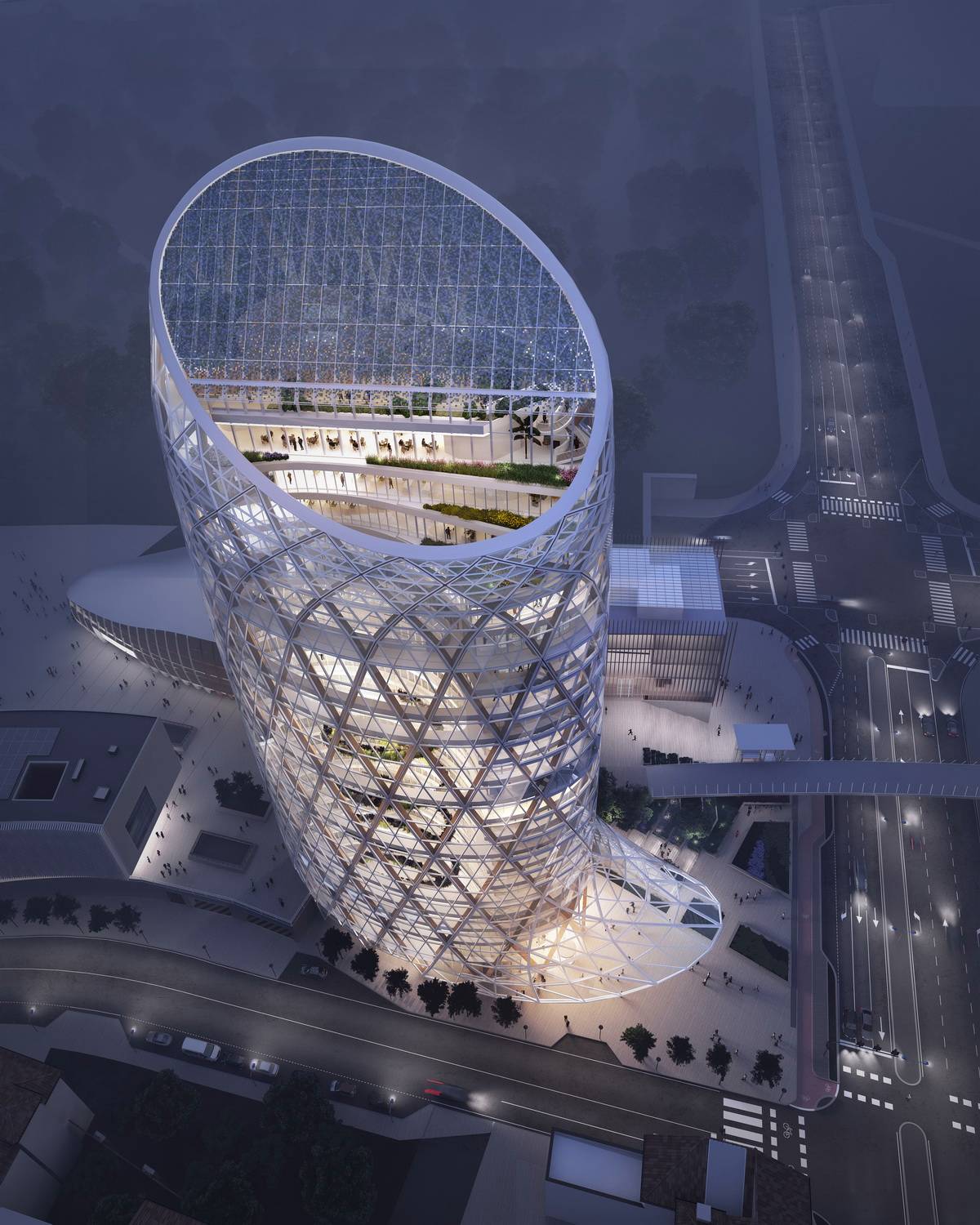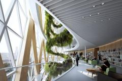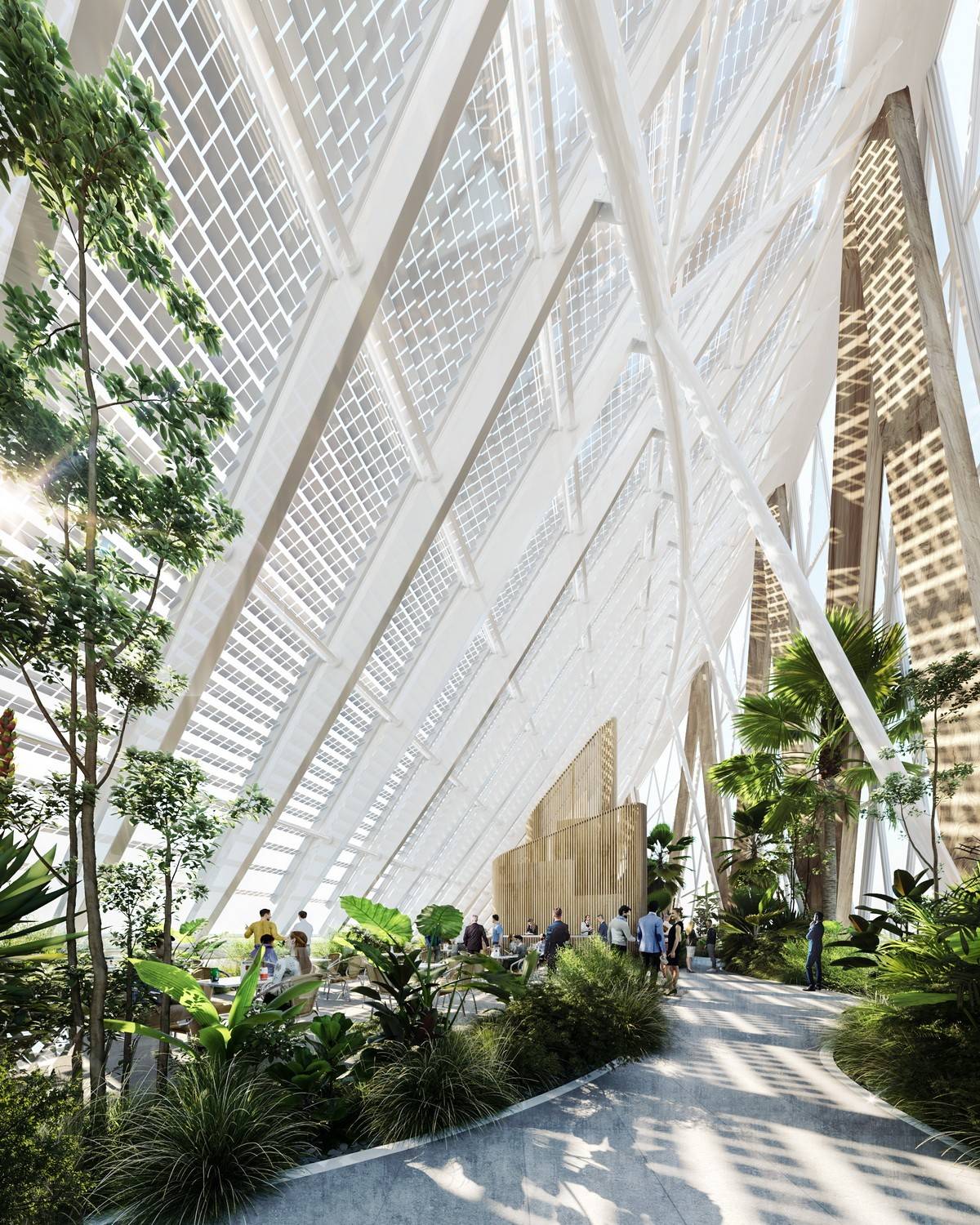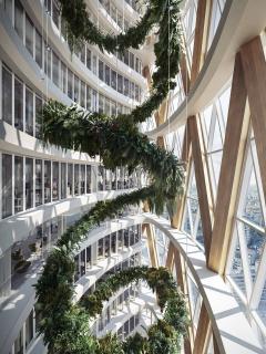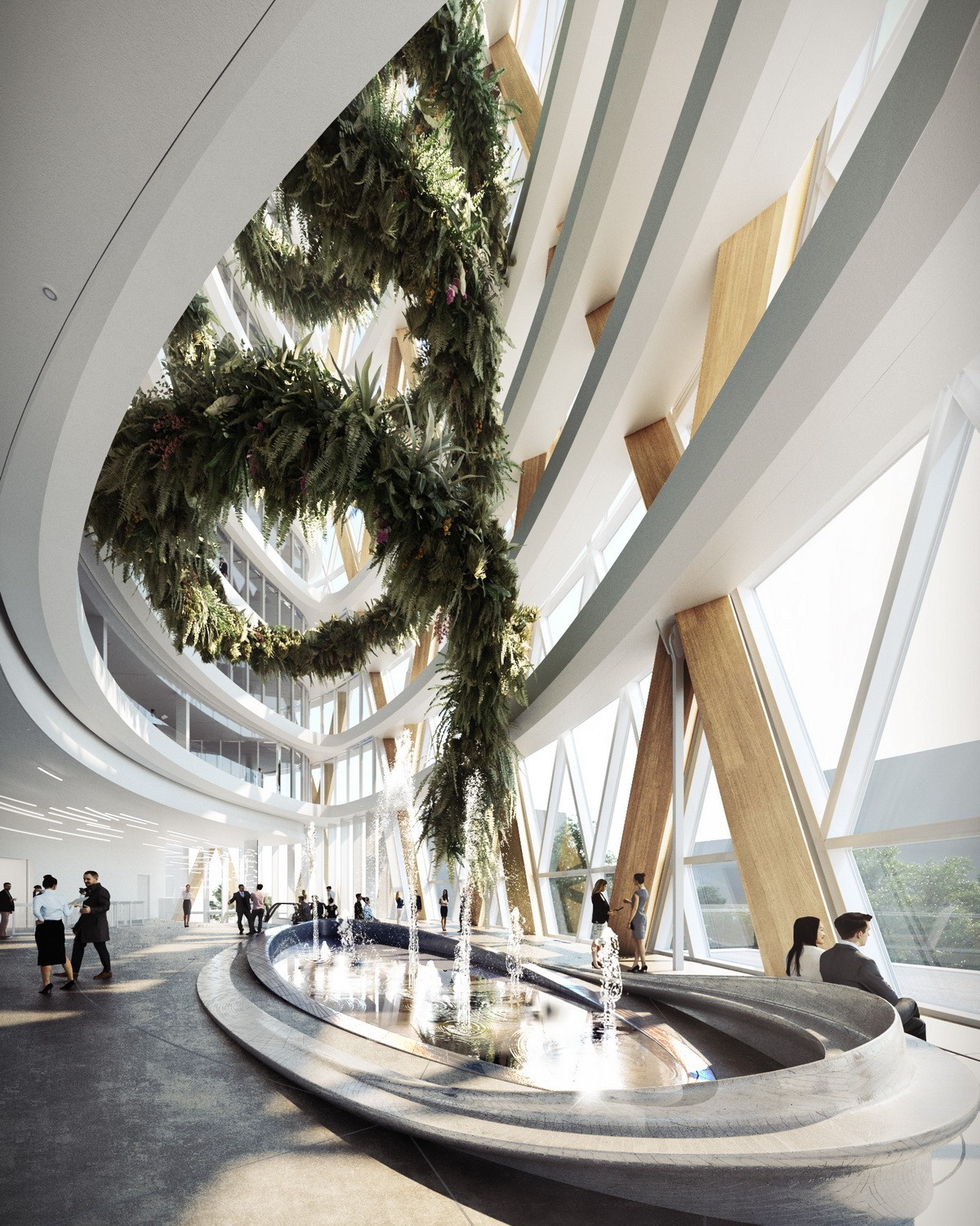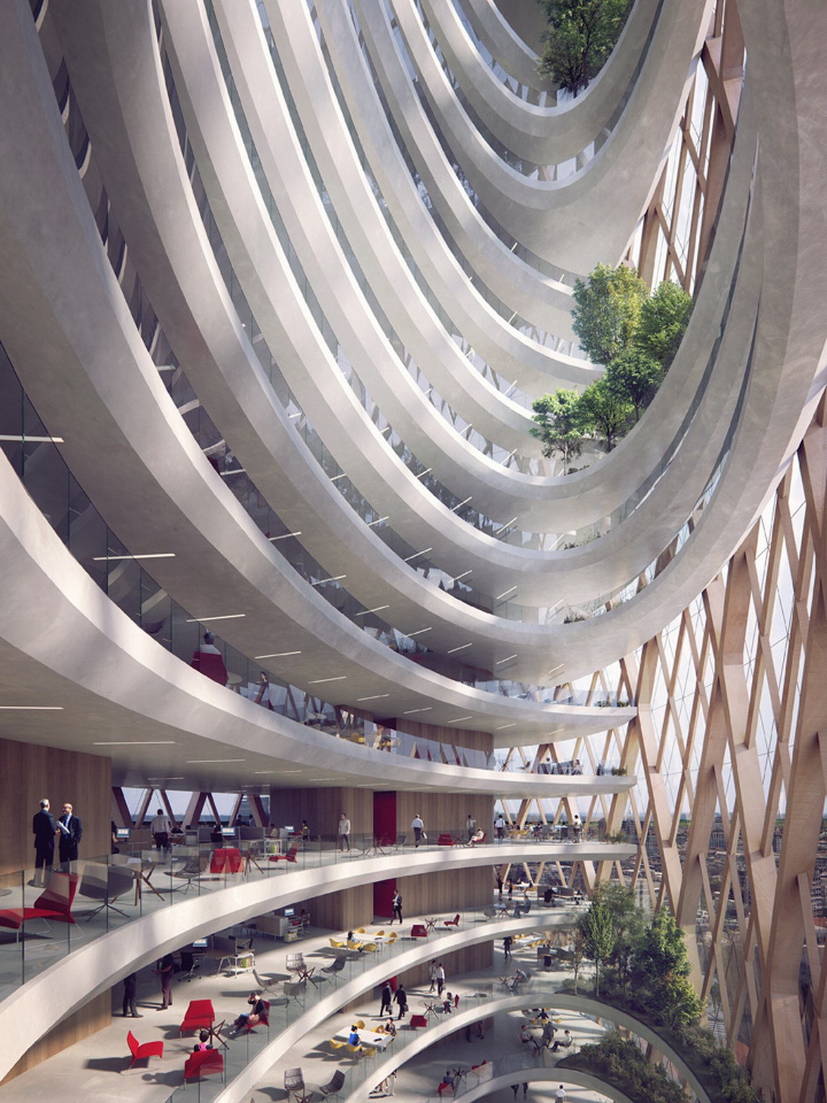 建筑內(nèi)的辦公空間面向新門區(qū)的大型公園,以尋求工作區(qū)域內(nèi)最佳的熱度和視覺舒適度;較高樓層的辦公空間面向帶有空中花園的通高中庭;建筑的頂部則是一個(gè)大型的全景溫室花園,用于舉辦公共活動(dòng)和休閑娛樂。