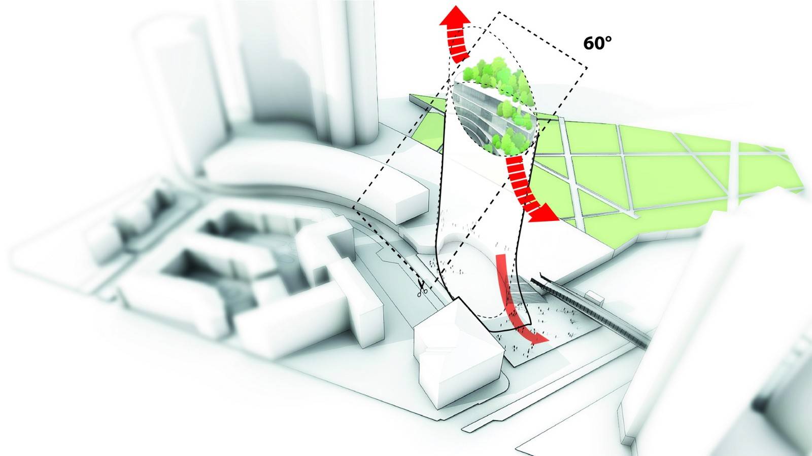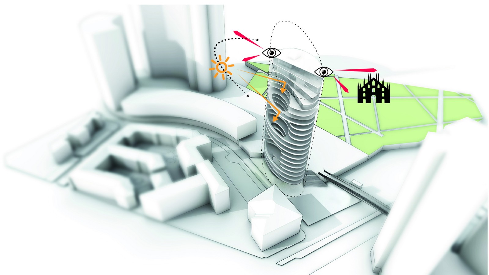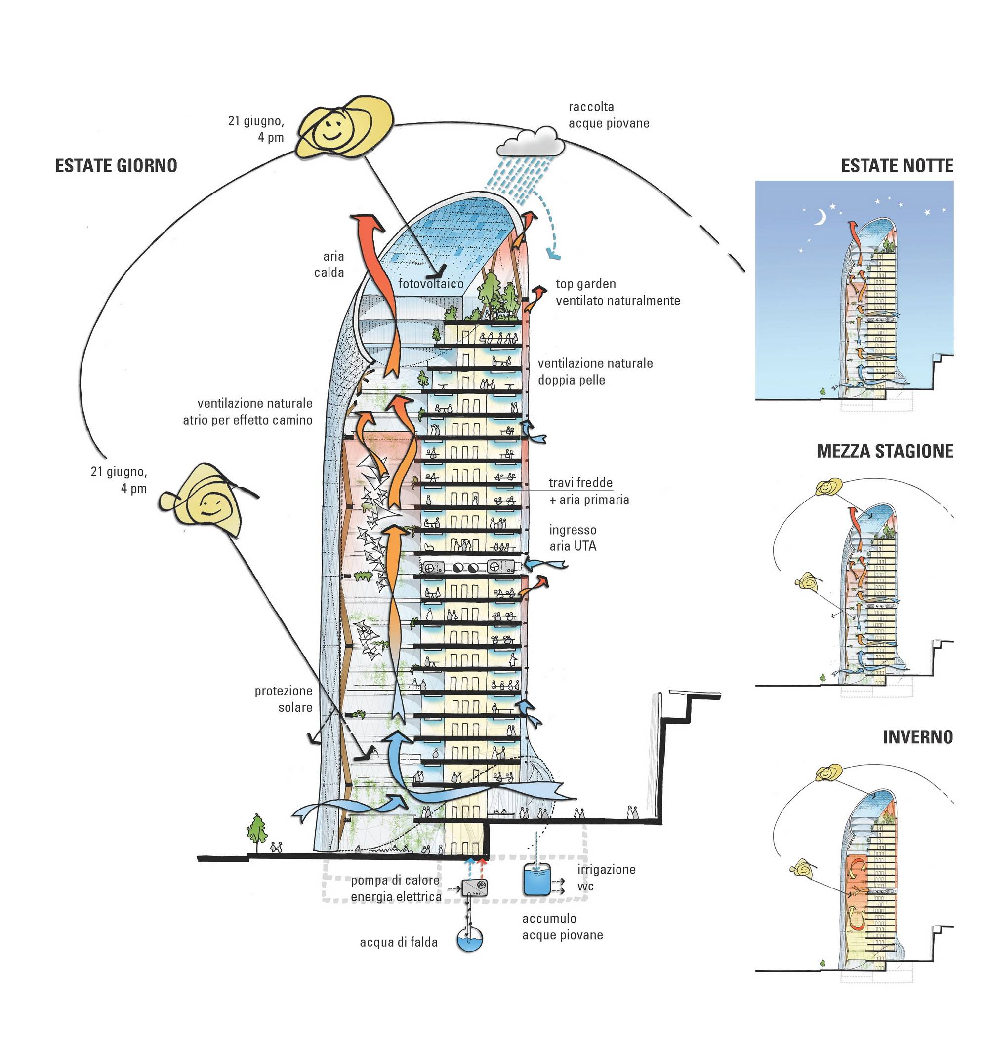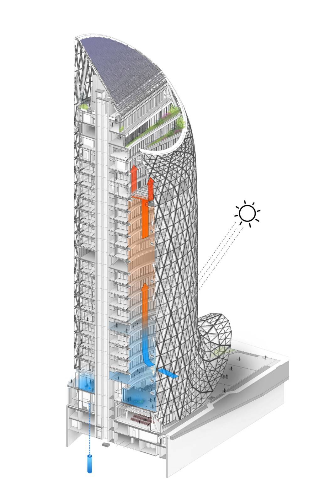 從橢圓形平面圖發(fā)展而成的建筑物外形旨在提高能源效率,顯著減少分散的表面(如果與體積相似但為矩形的建筑物相比),并與周圍的微環(huán)境形成更多的互動(dòng)。