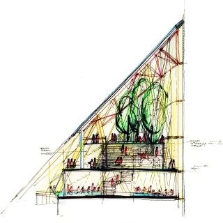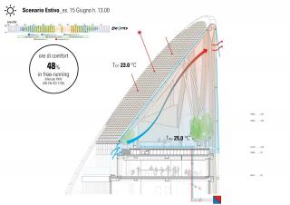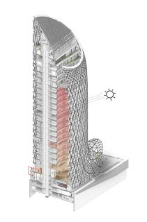 塔樓的頂部作為一個(gè)生物氣候溫室容納了一個(gè)現(xiàn)實(shí)中的空中花園。在冬季,得益于移動(dòng)的光伏板條系統(tǒng),溫室保持關(guān)閉并儲(chǔ)存太陽能。在夏季,薄板避免了陽光的直接照射,提供了充足的遮罩,并且最大限度地提高了可再生能源的發(fā)電量。底部和頂部的開口也有助于促進(jìn)通風(fēng)的效果。在冬季和夏季的高峰時(shí)期,可移動(dòng)窗簾系統(tǒng)可增加被遮蓋區(qū)域的熱度限制,提高舒適度。