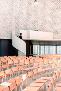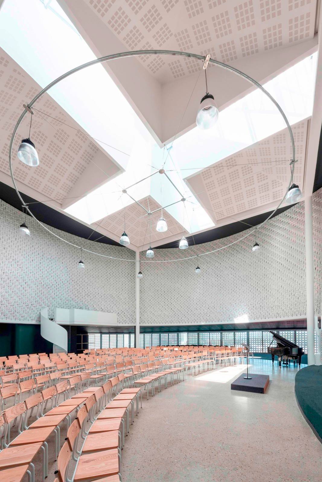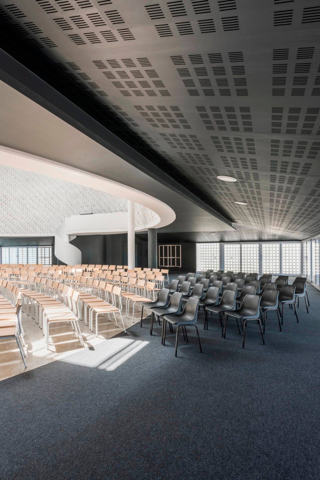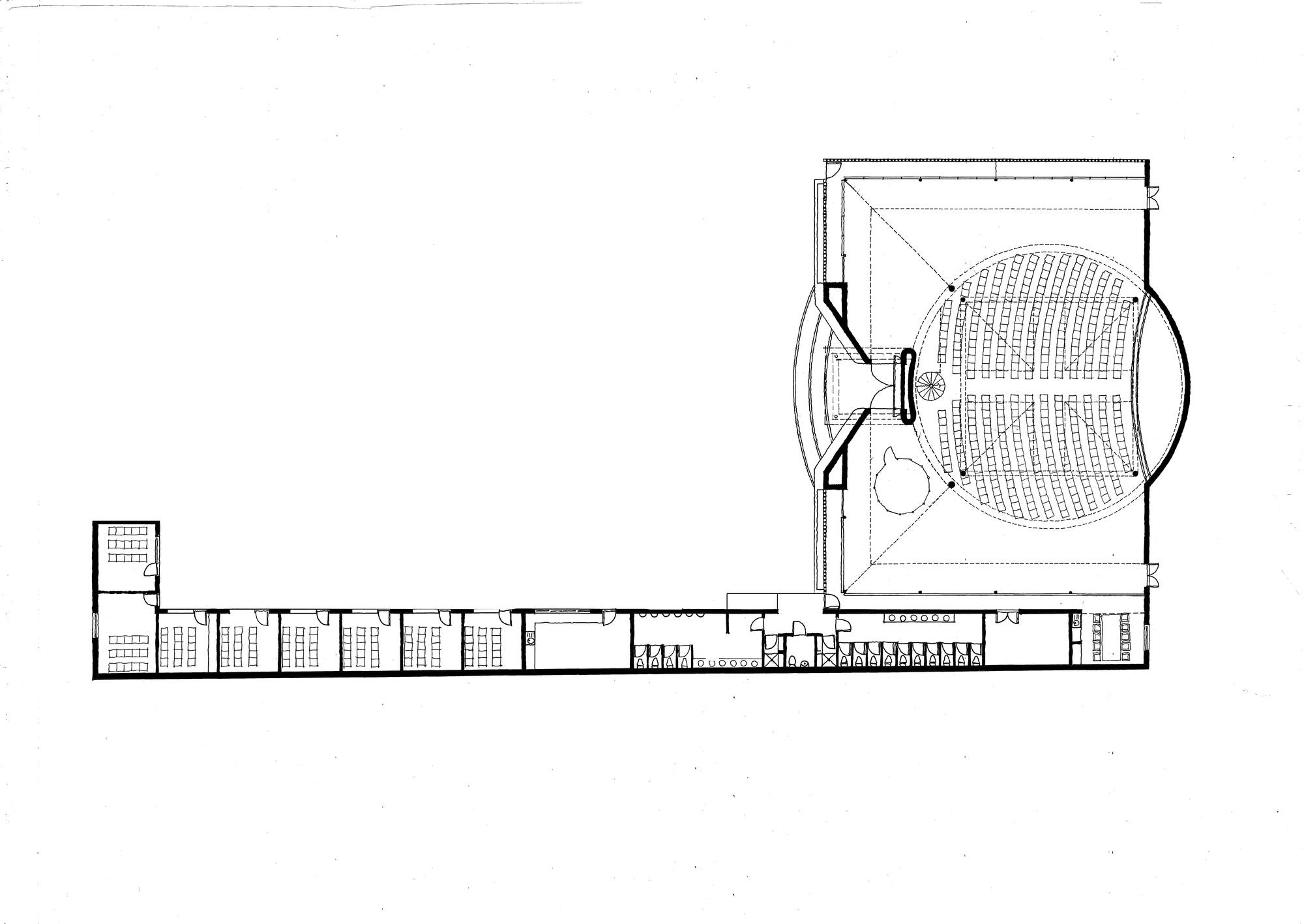 新教堂需要根據(jù)情況輕松地從400人擴(kuò)大至900人。建筑采用圓形嵌入正方形的平面形式,圓形平面可以容納450人,與周圍的方形空間相平衡。圓形空間在垂直方向上具有一定的戲劇性,它賦予空間獨(dú)特的存在感,在這里,牧師與教堂中的任何人的距離不超過15米,這使得牧師更為接近信眾。自然光從屋頂向下進(jìn)入圓形空間,通過屋頂?shù)膶?shí)體和空隙元素,形成了光的十字架。鼓壁的設(shè)計(jì)確保將聲音的反射降至最小,主樓板上方的圓形墻壁被視為多面的聲學(xué)隔音磚墻。入口庭院將新舊教堂沿縱向軸線對(duì)齊。