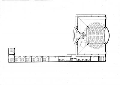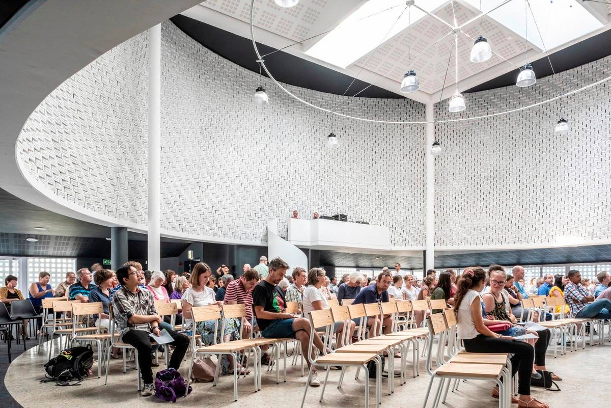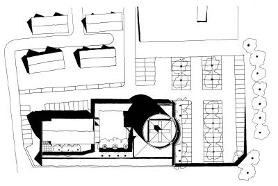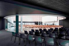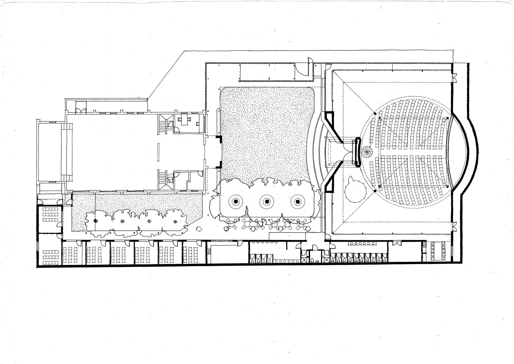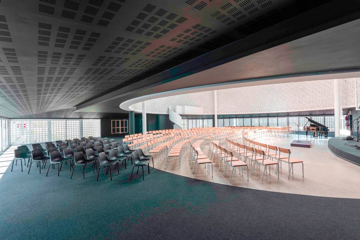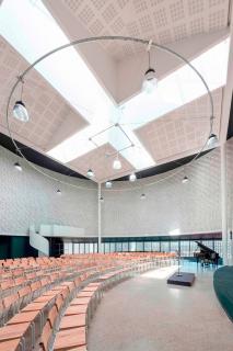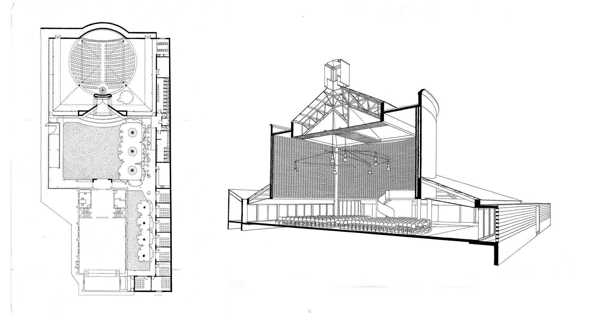 新教堂需要根據(jù)情況輕松地從400人擴(kuò)大至900人。建筑采用圓形嵌入正方形的平面形式,圓形平面可以容納450人,與周圍的方形空間相平衡。圓形空間在垂直方向上具有一定的戲劇性,它賦予空間獨(dú)特的存在感,在這里,牧師與教堂中的任何人的距離不超過15米,這使得牧師更為接近信眾。自然光從屋頂向下進(jìn)入圓形空間,通過屋頂?shù)膶?shí)體和空隙元素,形成了光的十字架。鼓壁的設(shè)計(jì)確保將聲音的反射降至最小,主樓板上方的圓形墻壁被視為多面的聲學(xué)隔音磚墻。入口庭院將新舊教堂沿縱向軸線對(duì)齊。