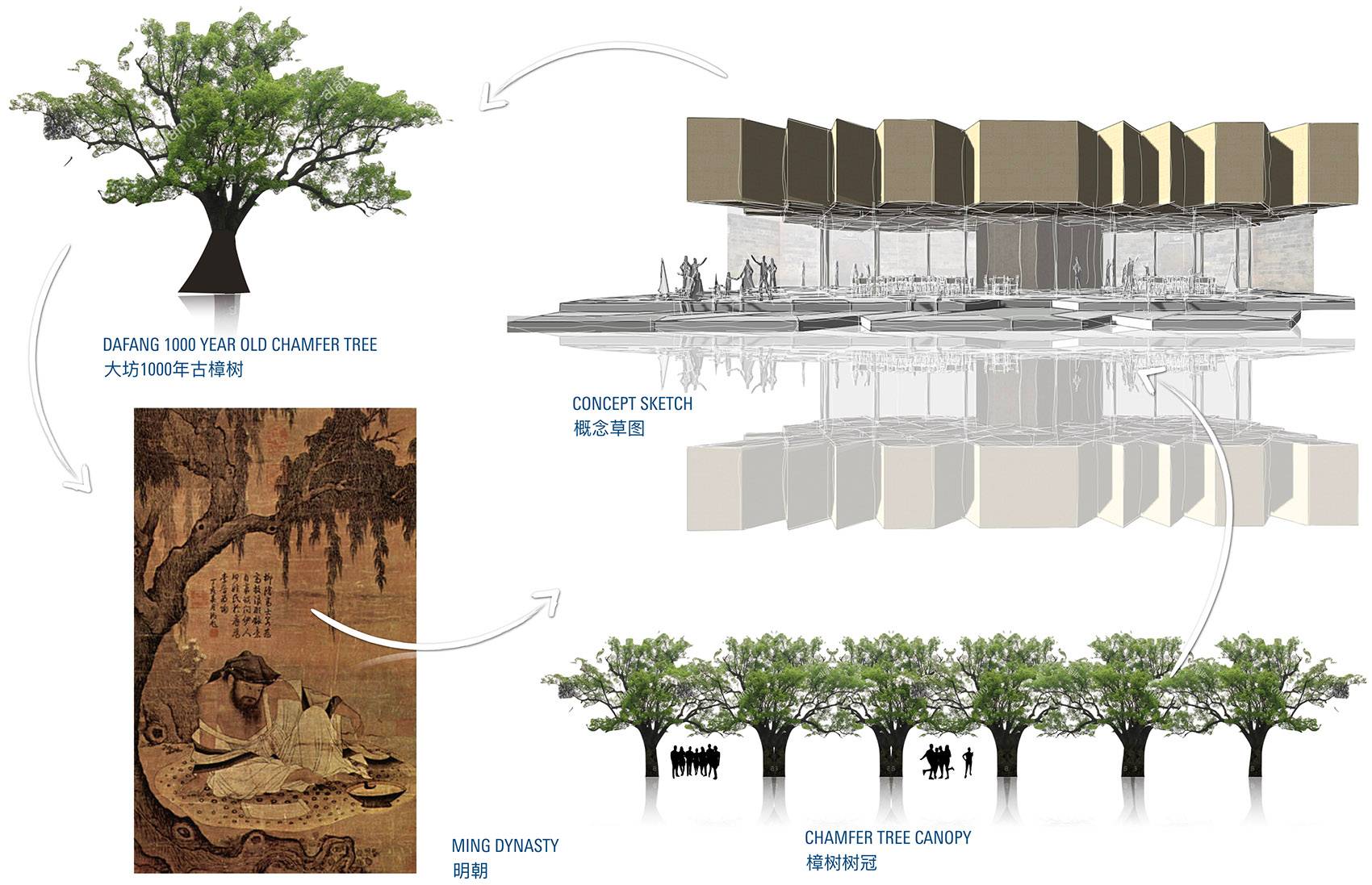 在村子的中心,NEXT設(shè)計(jì)了新的鄉(xiāng)村客廳(古樟樹(shù)咖啡廳)。鄉(xiāng)村客廳是在文化大革命時(shí)期被毀的四合院舊址上修建的。獨(dú)特屋頂?shù)撵`感和造型來(lái)自于村旁的一棵千年古樟樹(shù),幾百年來(lái),它那高大的樹(shù)冠為村民們提供了一個(gè)聚集的空間。古樟樹(shù)的造型融入村子的結(jié)構(gòu)中,提供了一個(gè)有遮蔽性的集體空間。樹(shù)葉形態(tài)的定制陶瓦立面也為鳥(niǎo)兒提供了筑巢的地方。