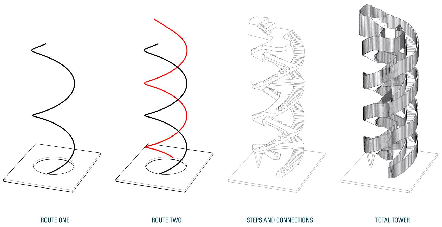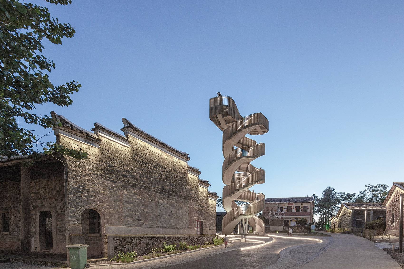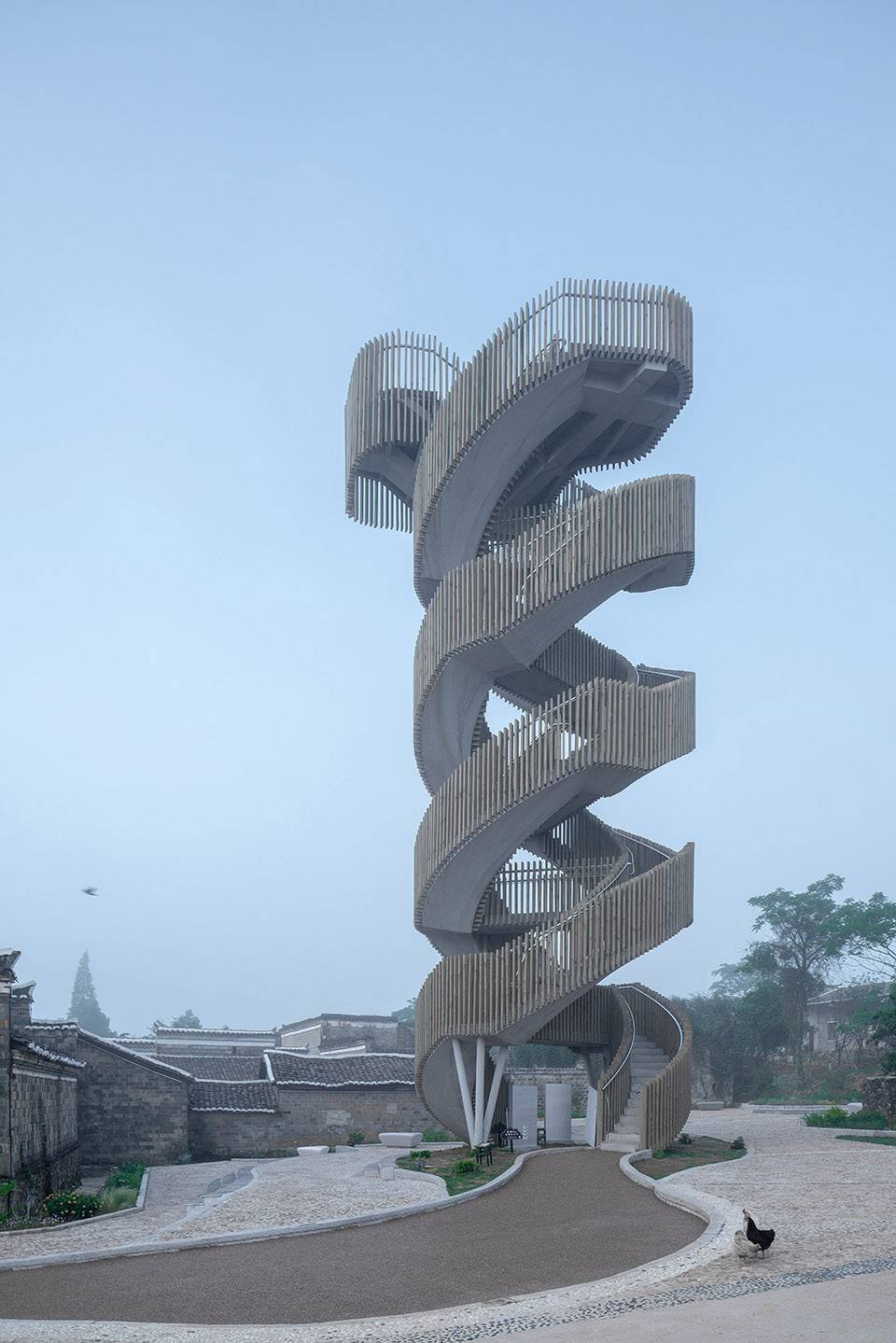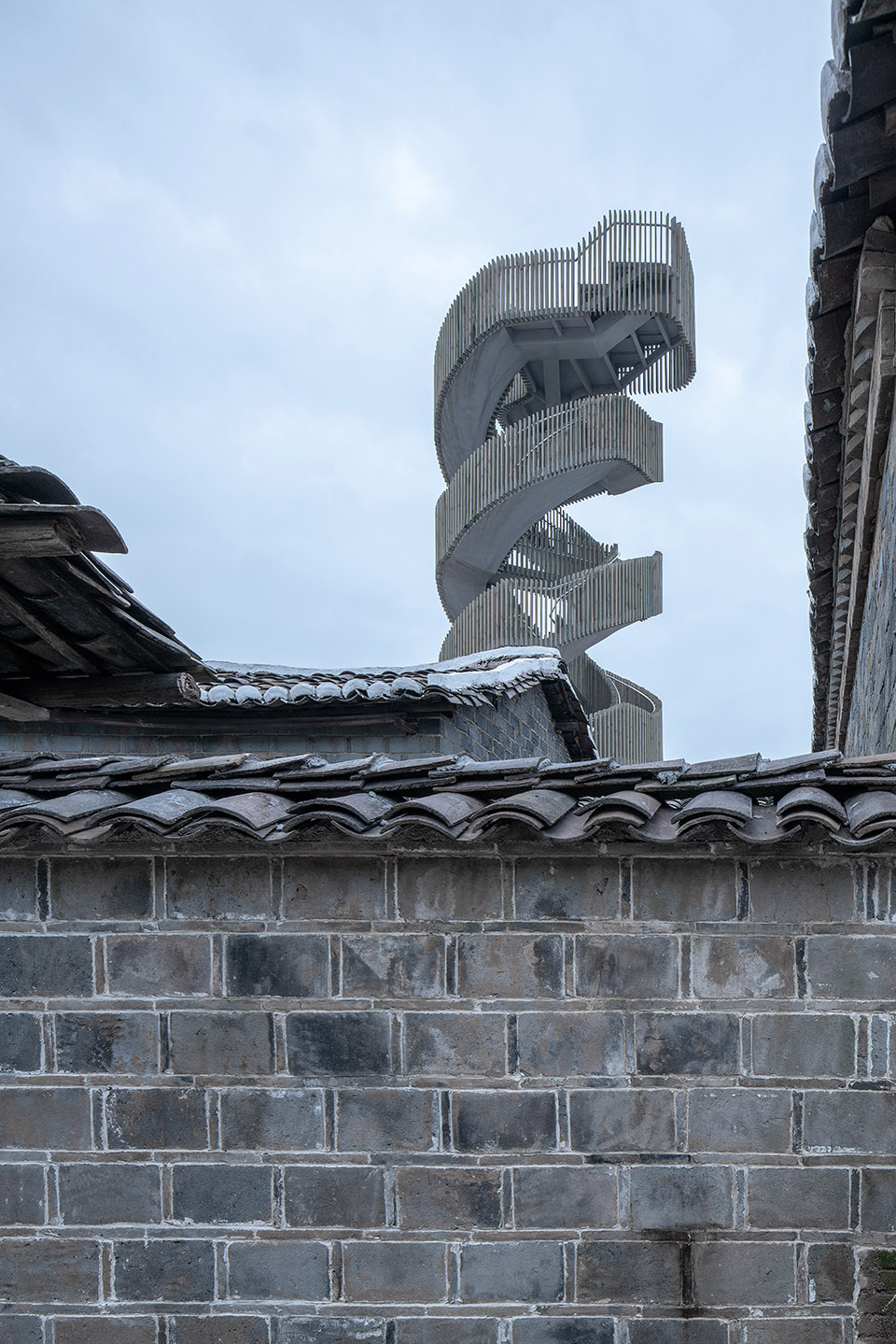其次,還增設(shè)了瞭望塔和鄉(xiāng)村客廳:新的建筑結(jié)構(gòu)借鑒了現(xiàn)場(chǎng)的先例。這一帶的古村落都有防御用的瞭望塔。原有的瞭望塔早已不復(fù)存在,新的瞭望塔被設(shè)計(jì)成了猶如兩條巨龍相互纏繞,互相支持,團(tuán)結(jié)一心的形狀。瞭望塔上隨著每一臺(tái)階的轉(zhuǎn)移,目光都將游離在故鄉(xiāng)和遠(yuǎn)方,既可以看到村子里的新舊景色,也可以看到遠(yuǎn)處的鄉(xiāng)村風(fēng)景,遠(yuǎn)眺地平線上的山巒。瞭望塔在當(dāng)?shù)乇蛔u(yù)為 “游子塔”,這讓人想起中國(guó)著名詩(shī)人李白的一首詩(shī),詩(shī)中描寫(xiě)了人們思親返鄉(xiāng)的故事。