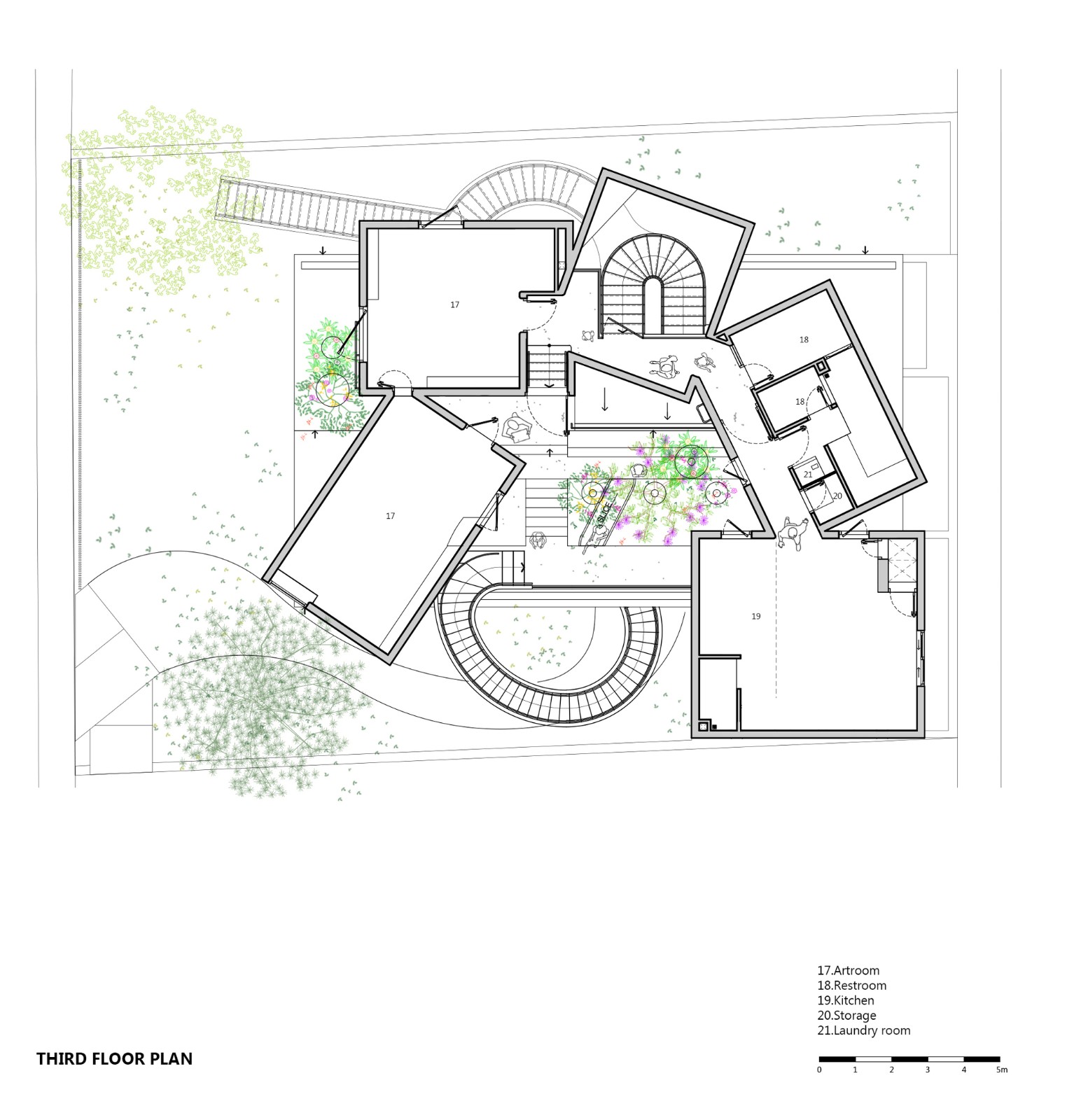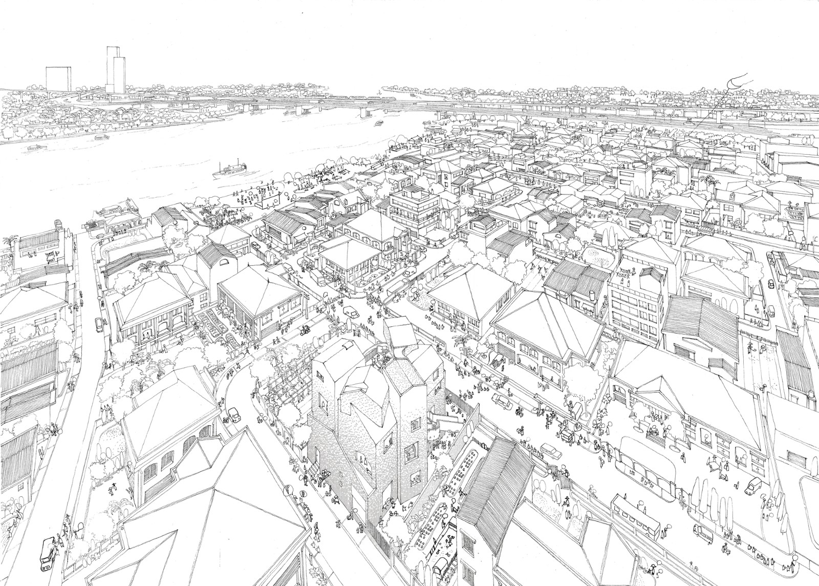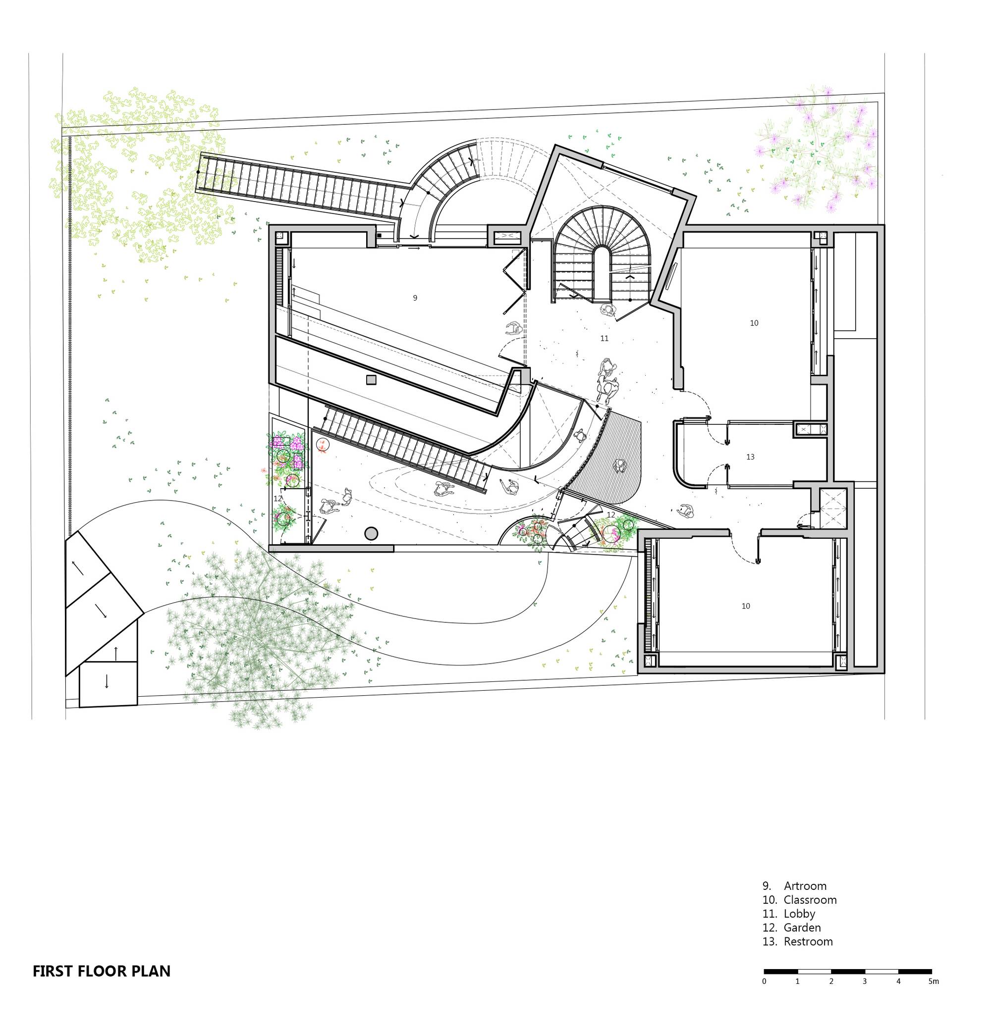 和教室的安靜氛圍相比,這個游樂核心充滿了活力,動感十足。人們可以透過地面上花園形成的空隙看到內(nèi)部或是看到外部。隨著樓層的向上,內(nèi)部空間最終與屋頂?shù)拈_放式花園連接在一起,并能在此體驗探索一回那綿延流長一望無際的西貢河。