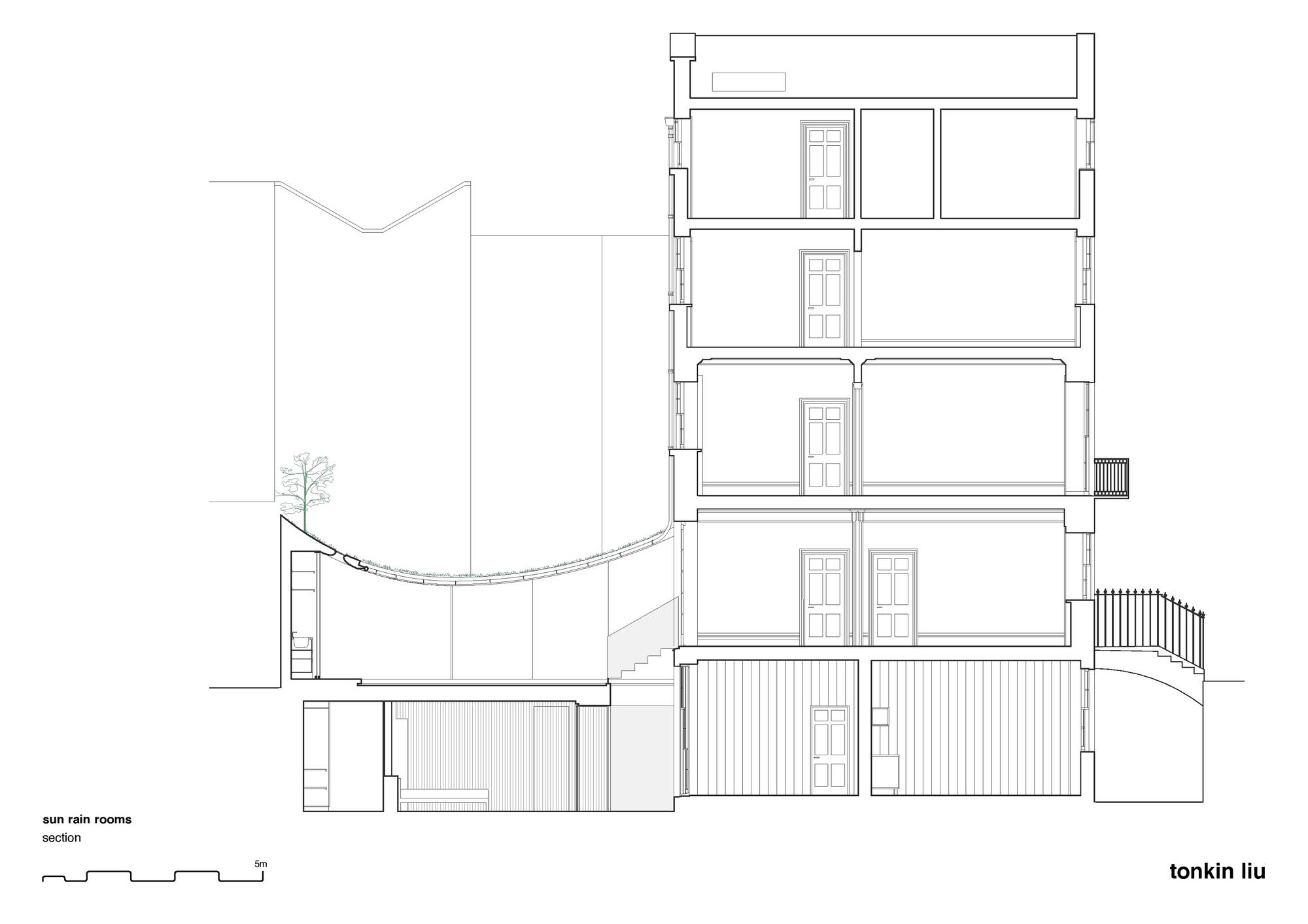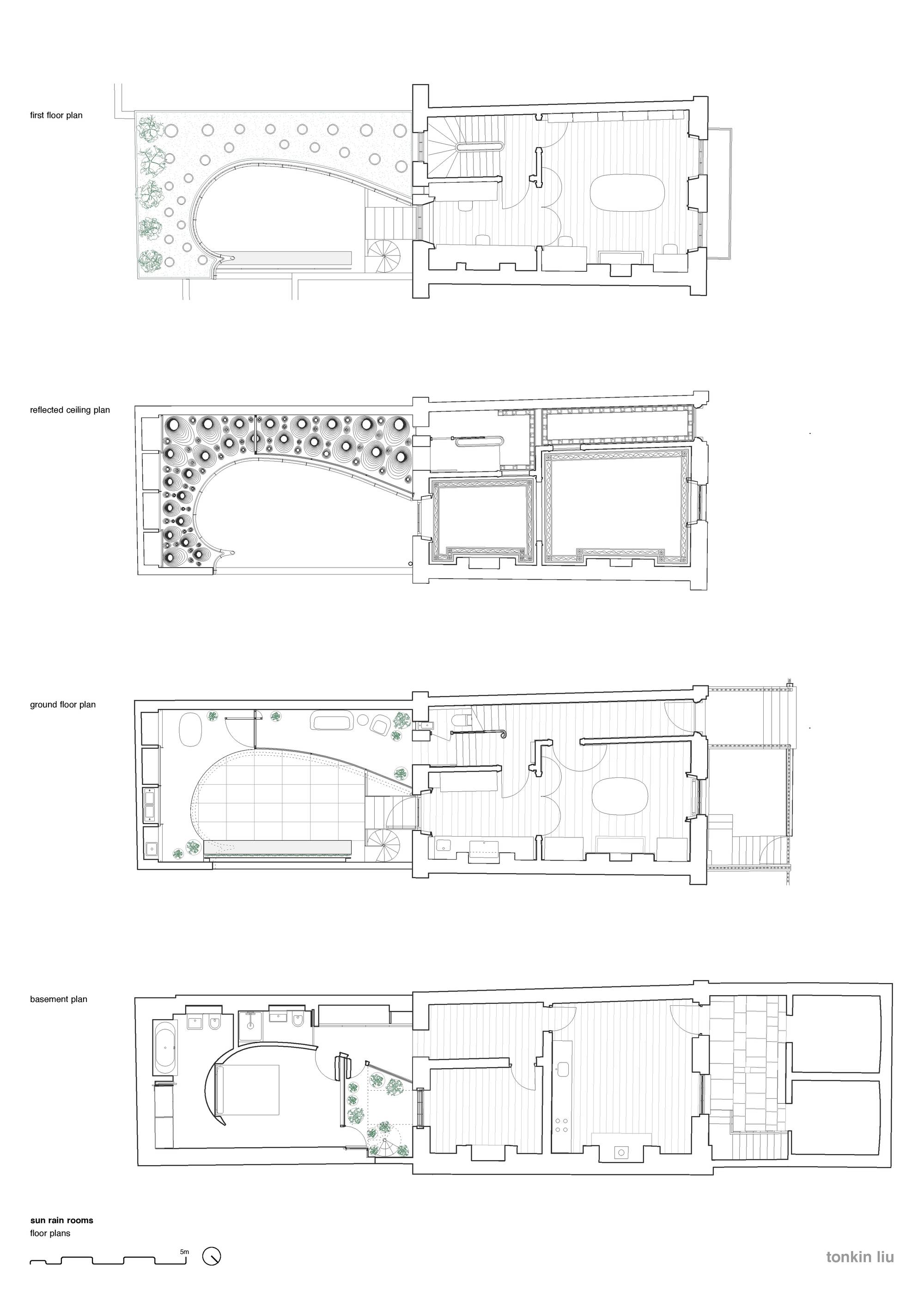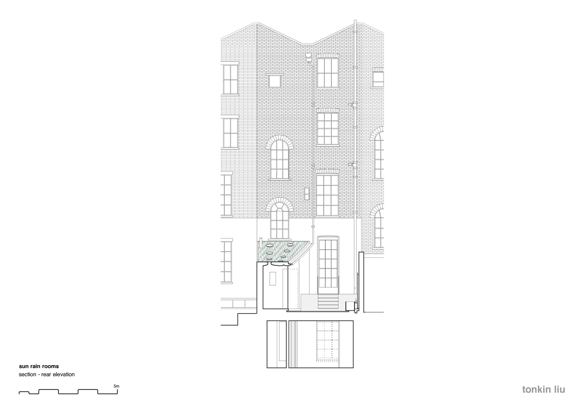 晴雨屋的主體是一棟兩層樓高的格魯吉亞排屋的擴建,建筑師在這棟珍貴的二級遺產的背面進行了重組和擴充。延伸的部分沿用了原本的材料風格,重新強調了建筑的后院。建筑是由 Tonkin Liu工作室與本地匠人合作設計完工的,它既是一個工作室,也是合伙人的家。原始的后院圍墻撐起了復合板制成的屋頂、為了盡可能讓陽光傾入天井,縱橫墻體都根據(jù)日照肆意扭動。