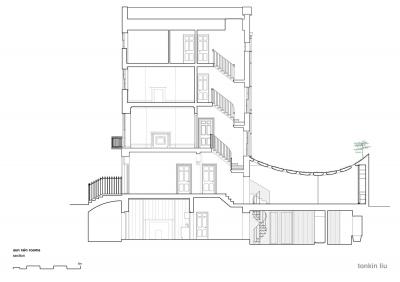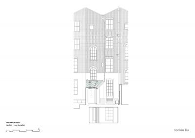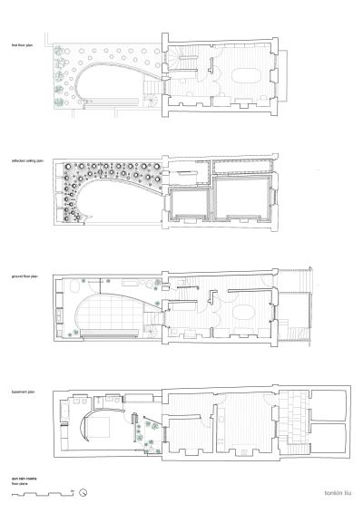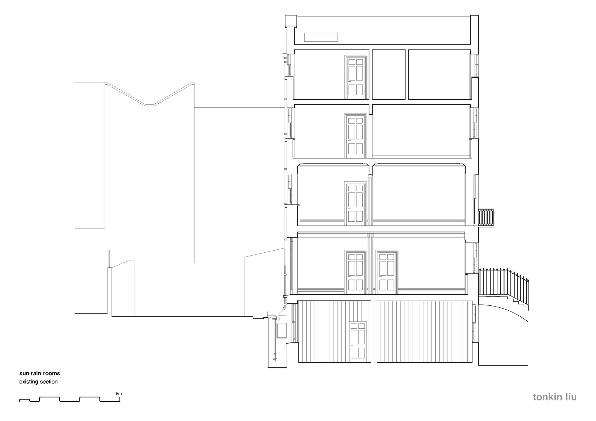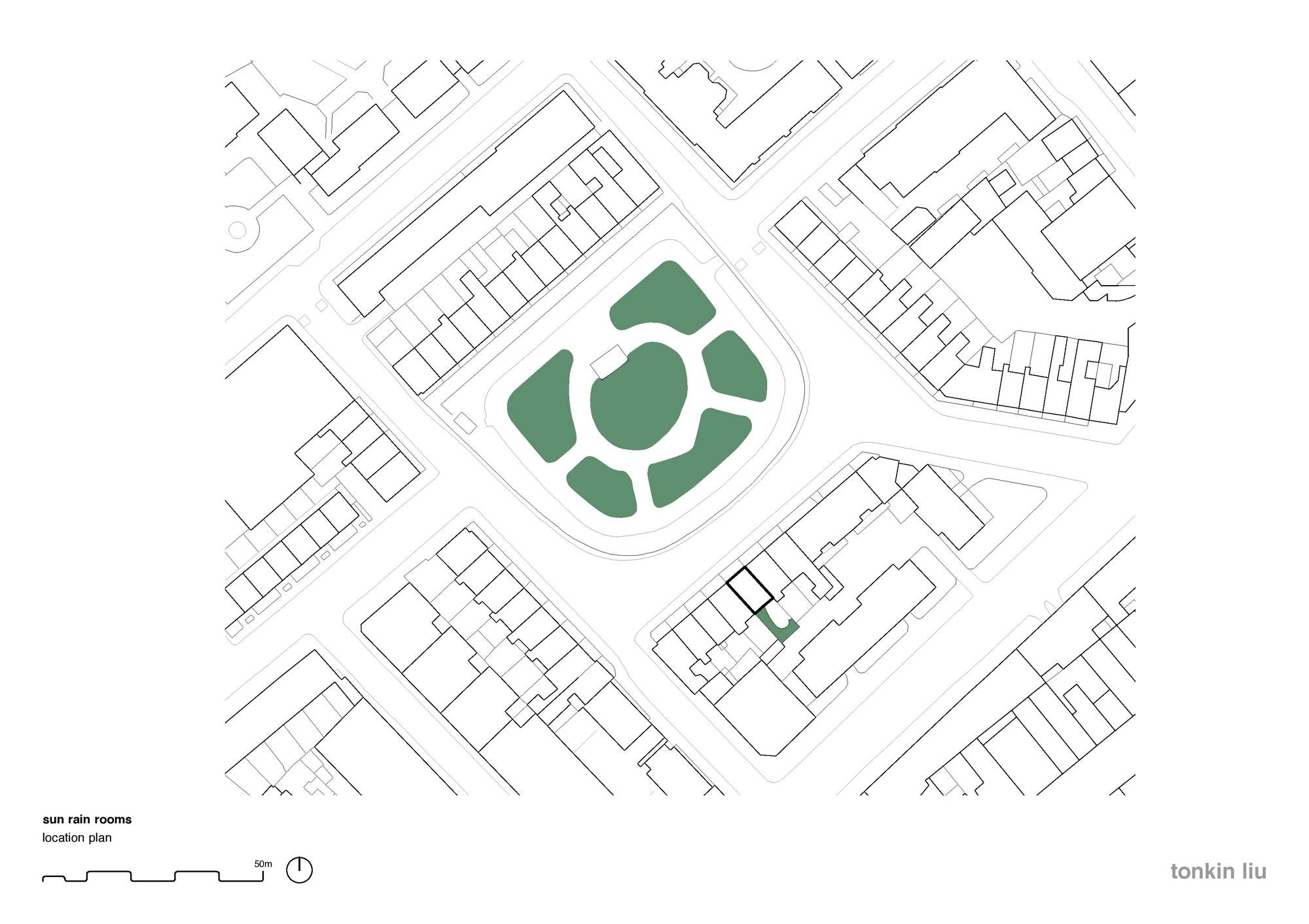 晴雨屋的主體是一棟兩層樓高的格魯吉亞排屋的擴建,建筑師在這棟珍貴的二級遺產的背面進行了重組和擴充。延伸的部分沿用了原本的材料風格,重新強調了建筑的后院。建筑是由 Tonkin Liu工作室與本地匠人合作設計完工的,它既是一個工作室,也是合伙人的家。原始的后院圍墻撐起了復合板制成的屋頂、為了盡可能讓陽光傾入天井,縱橫墻體都根據(jù)日照肆意扭動。