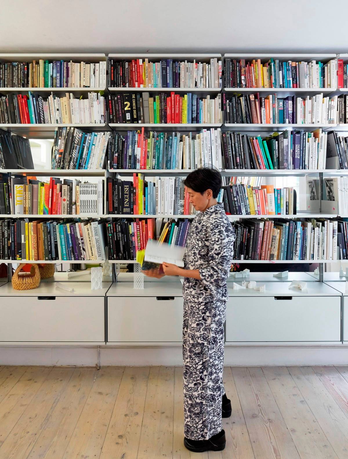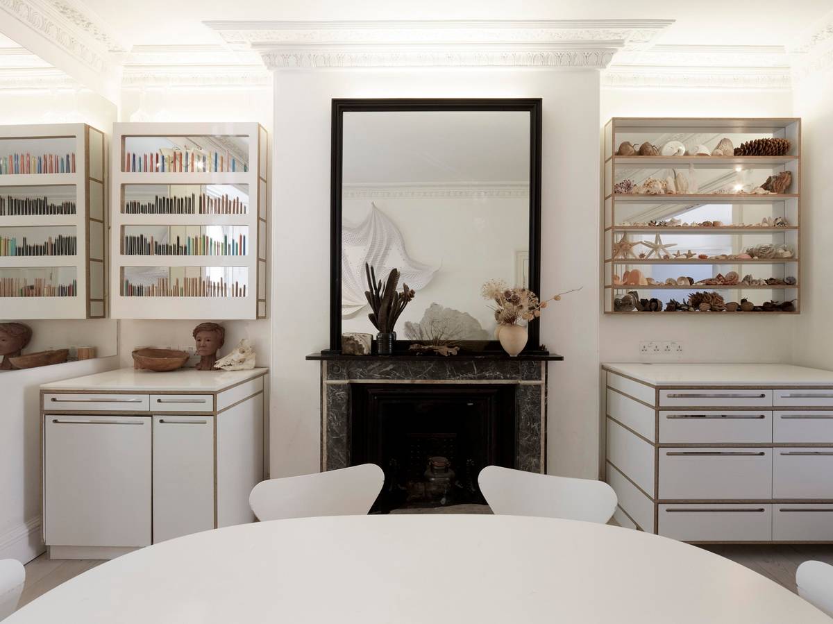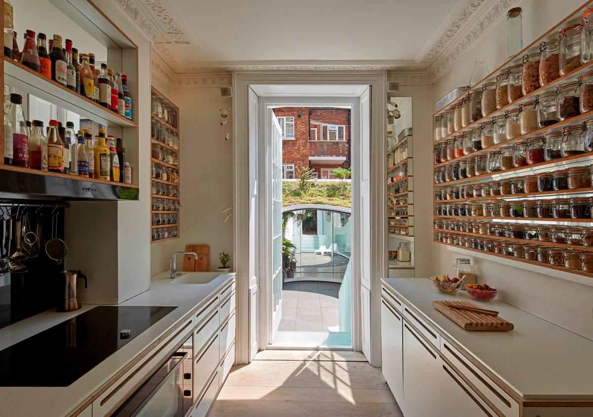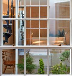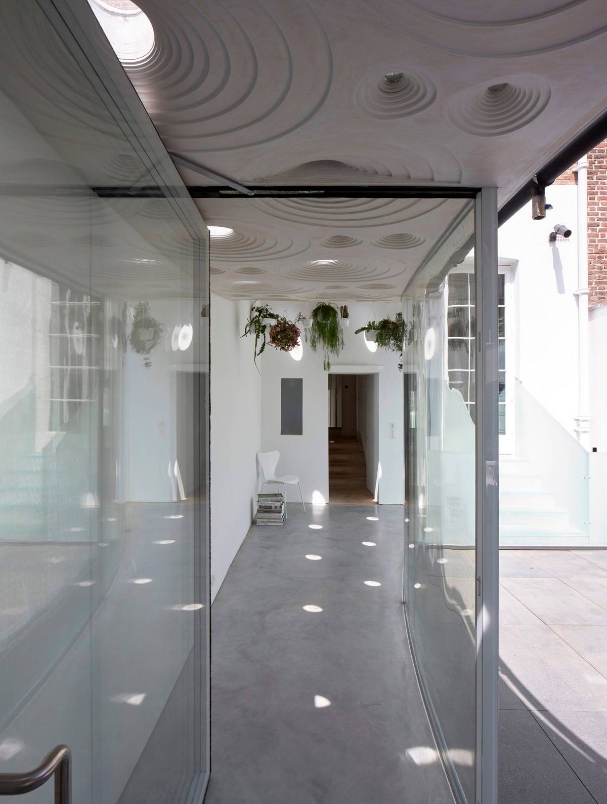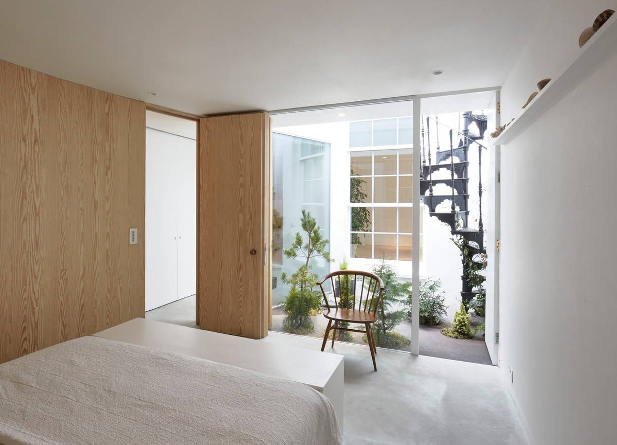 面對天井的另一面是一堵鏡面墻,墻后的小天地包括了廚房、工作間、儲藏室、盆栽棚和用于種植屋頂小樹的土壤。