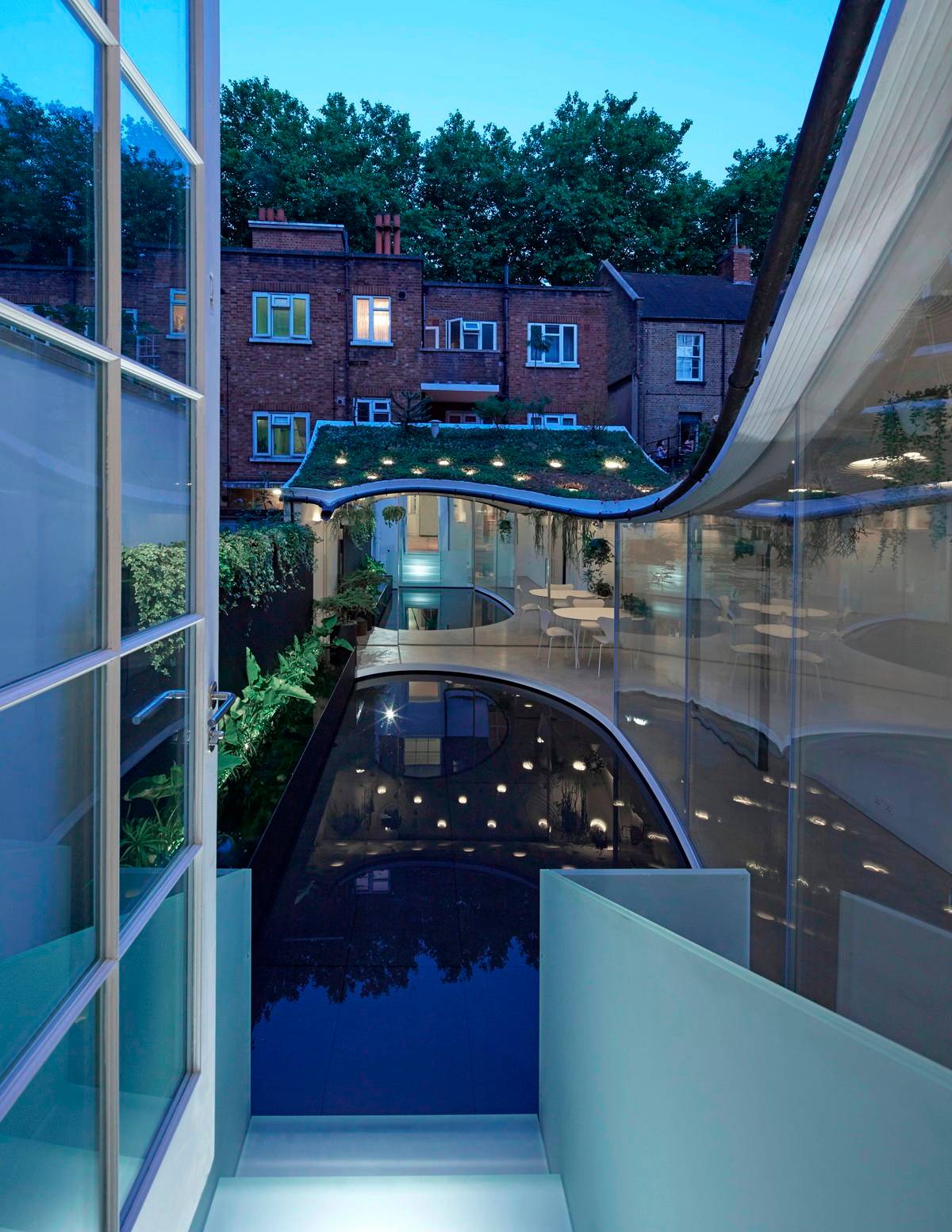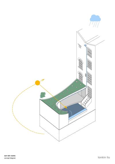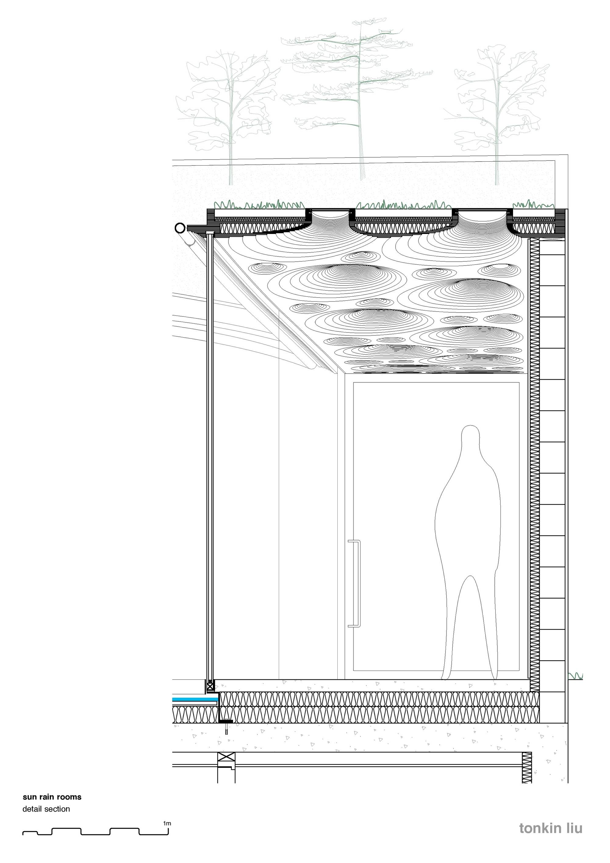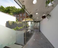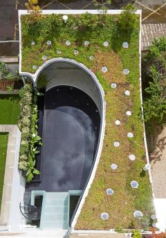 底下是擴張了的地下室,起居洗漱都在這里進行,臥室還正對著一個小小的光井。精心設計的光影變幻,底下的景致同時也是一群標本植物的港灣。在晴雨室里,春意盎然的屋頂、波光粼粼的池水、層層疊加的都市花園都讓人們回歸自然,融入自然,敬畏自然。