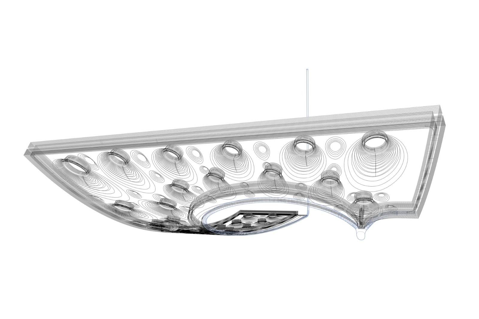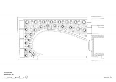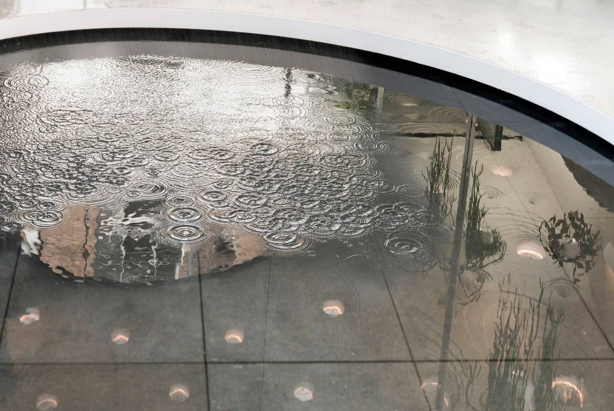 下雨時雨水順著屋頂蜿蜒而下,流入沿著凹型屋頂裝置的水管里,最終匯入蓄水池中。在巧妙的操控下,蓄水池可以溢滿整個天井。在天氣好的日子里它就像一枚鏡子,鏡花水月,歲月安好。屋頂?shù)暮穸葹?.1米,它像一個隔熱層,上面有許多大大小小的圓形天窗,形狀與雨滴落在水面上的圖案交相輝映。下雨的時候,圈圈圓圓圈圈的波紋是壞天氣下的小確幸。在這小小的延伸屋頂下,平淡又詩意的工作和生活有條不絮的進行。面對天井的陽光房在工作時是別有洞天的會議室,閑暇時則是最棒的放松場所。