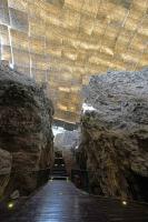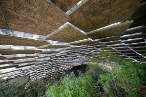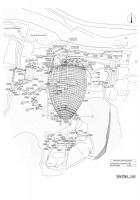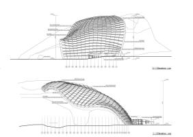 以現(xiàn)存山體等高線為線索,推導(dǎo)出猿人洞未坍塌前的山體形態(tài),以此為基礎(chǔ)得到保護(hù)建筑的整體造型,使新建筑從形態(tài)上與周圍山體環(huán)境融為一體。建筑的外表皮為綠植屋面,按設(shè)計目標(biāo)兩年內(nèi)可以成形,使其隱沒在綠樹從中。內(nèi)表皮抽象模擬山洞意向,向觀眾傳遞遺址地環(huán)境信息。