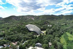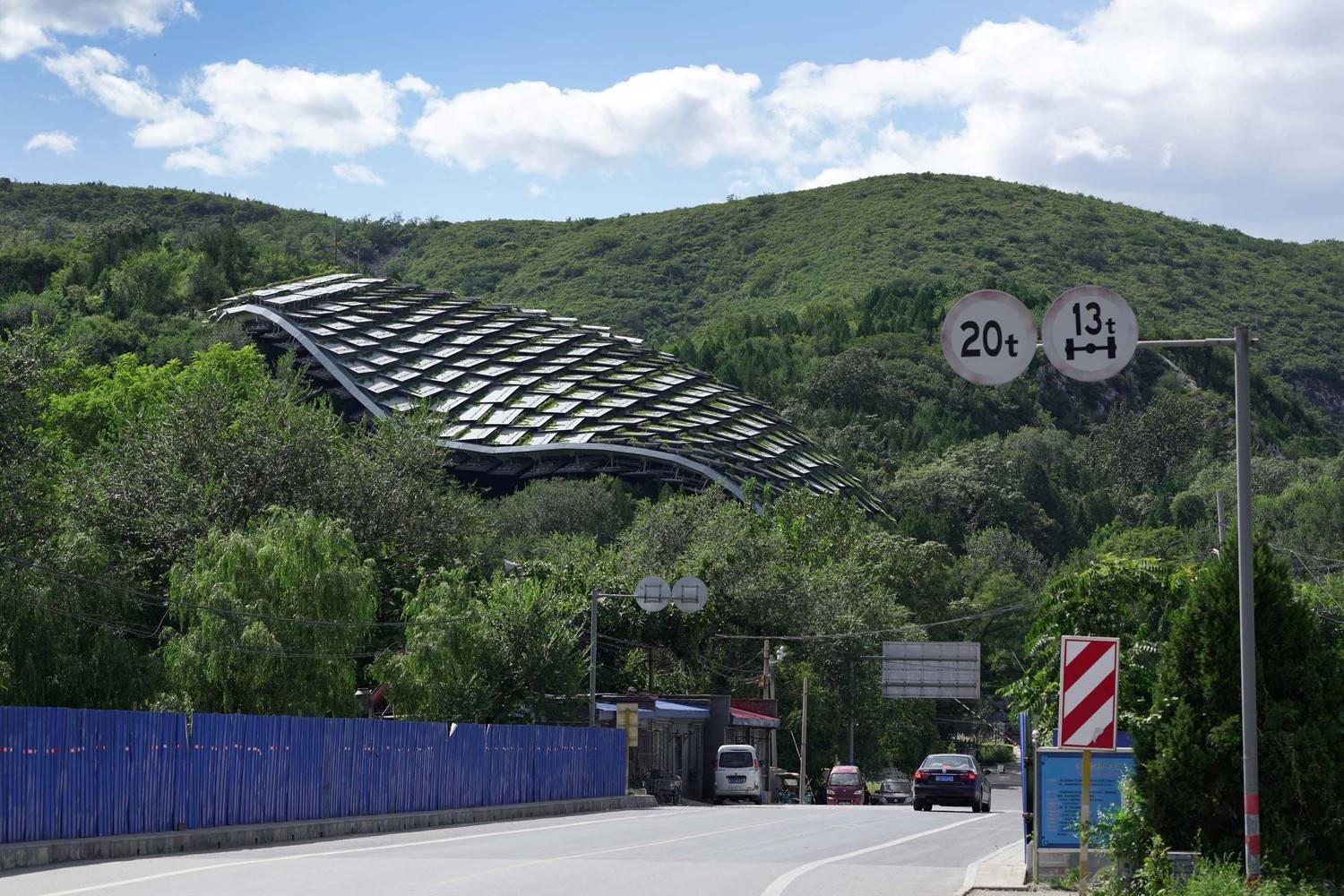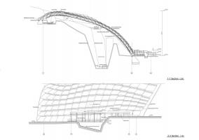 保護(hù)建筑采用空間單層網(wǎng)殼結(jié)構(gòu),以不規(guī)則曲面覆蓋3700余平方米,南北跨度77.5米,東西跨度54.5米,結(jié)構(gòu)落腳點高差30.7米,最大高度35.7米。
