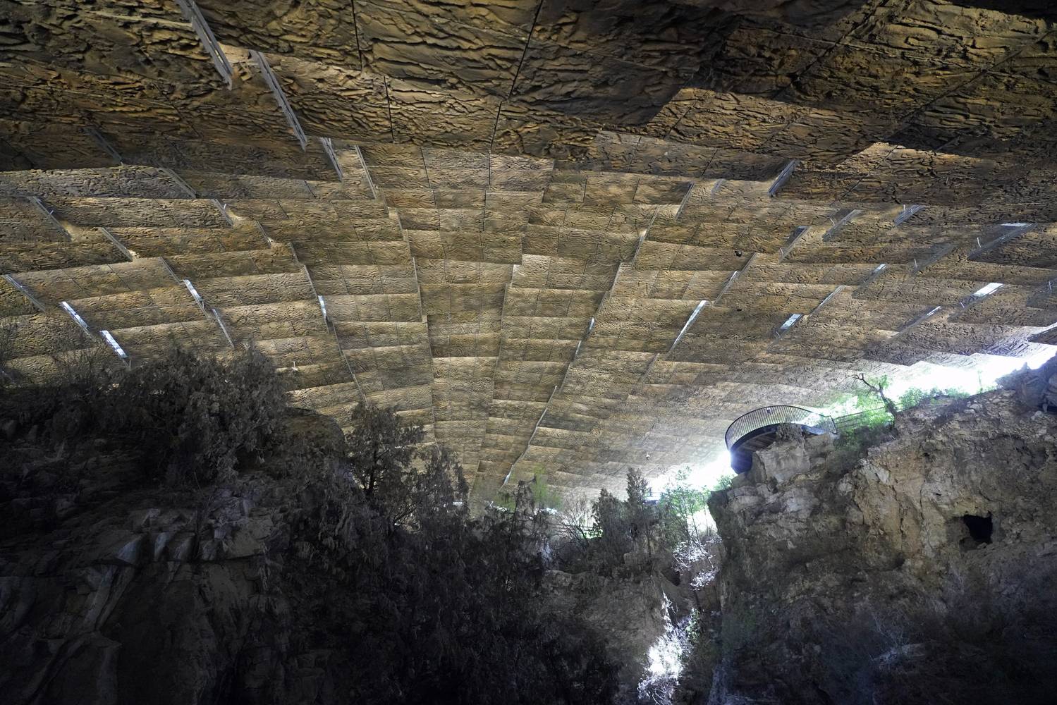 保護(hù)棚遵守最小干預(yù)和可逆性原則,采用大跨度空間單層網(wǎng)殼結(jié)構(gòu),橫跨猿人洞遺址,在南側(cè)山頂及北側(cè)山腳各設(shè)置一排落腳點。落腳點均選在敏感區(qū)域之外平坦巖層之上,不接觸遺跡及其賦存巖壁,以此覆蓋需要保護(hù)的最小面積。