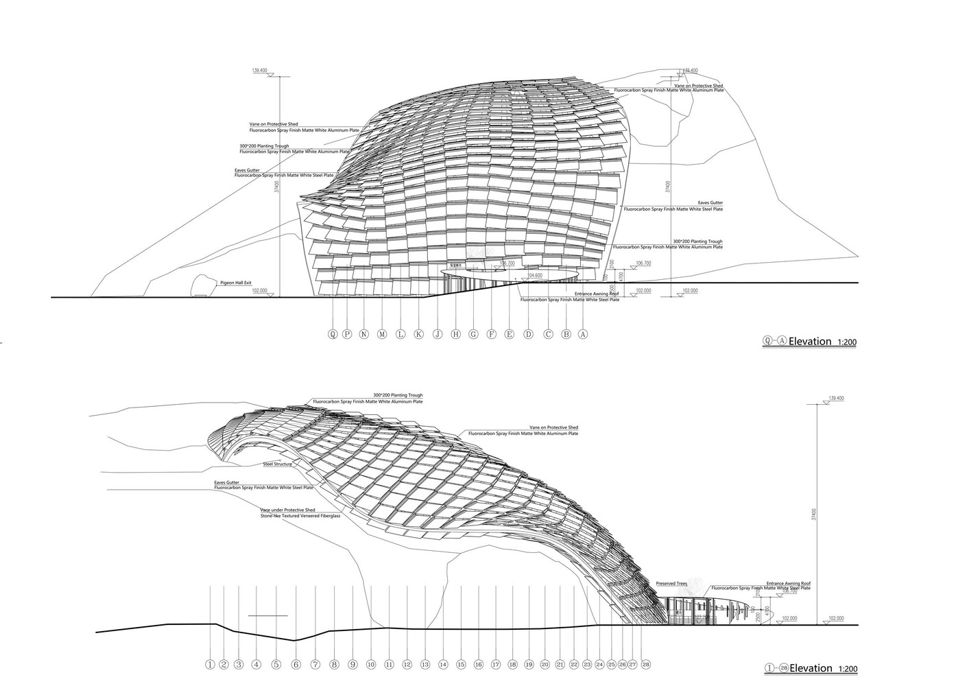 采用雙層表皮,形成溫濕度等環(huán)境因素變化的緩沖層。內(nèi)外表皮葉片由參數(shù)化計算自動生成,葉片搭接緊密,雨水通過有組織的方式,由保護(hù)棚最高處葉片向周圍葉片逐層下降排出,其間隙提供均勻的自然采光和通風(fēng)。其中上葉片420片,下葉片405片,總共825片。