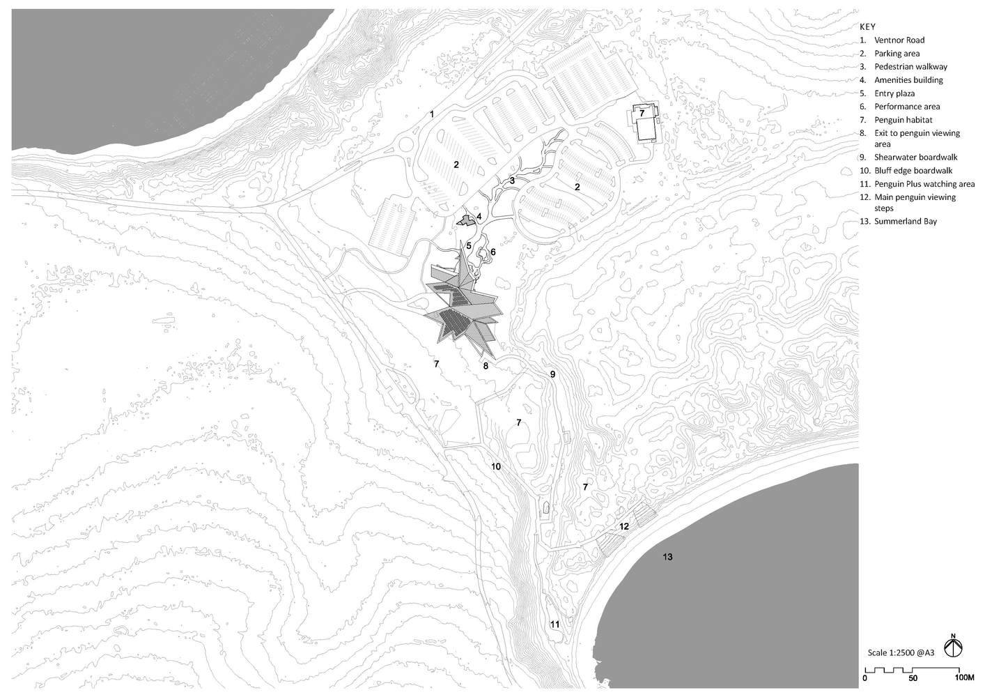 一個多世紀(jì)以來,人們絡(luò)繹不絕地在黃昏時分來到菲利普島,觀看小企鵝們走上岸邊。人們能夠在一個壯觀而敏感的景觀中親近企鵝,這使其成為全球同類體驗最重要的場所之一,而菲利普島上的“企鵝歸巢”在之后成為了澳大利亞排位第一的野生動物景點——每日傍晚有4000名游客前來。在二十世紀(jì)80年代,薩默蘭住宅區(qū)內(nèi)有177間住宅,研究表明企鵝們會于1997年在“企鵝歸巢”消失。為此,州政府通過致力于買下整塊地產(chǎn)來確保小企鵝們的未來——環(huán)境保護(hù)上的世界首創(chuàng)。同時,菲利普島自然公園成為了企鵝護(hù)理與企鵝棲居地開發(fā)的杰出權(quán)威機(jī)構(gòu)。新的“企鵝歸巢”游客中心必須通過圖解、實驗與功能的背景,承載起游園與保護(hù)功能的愿景。