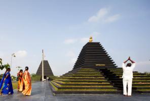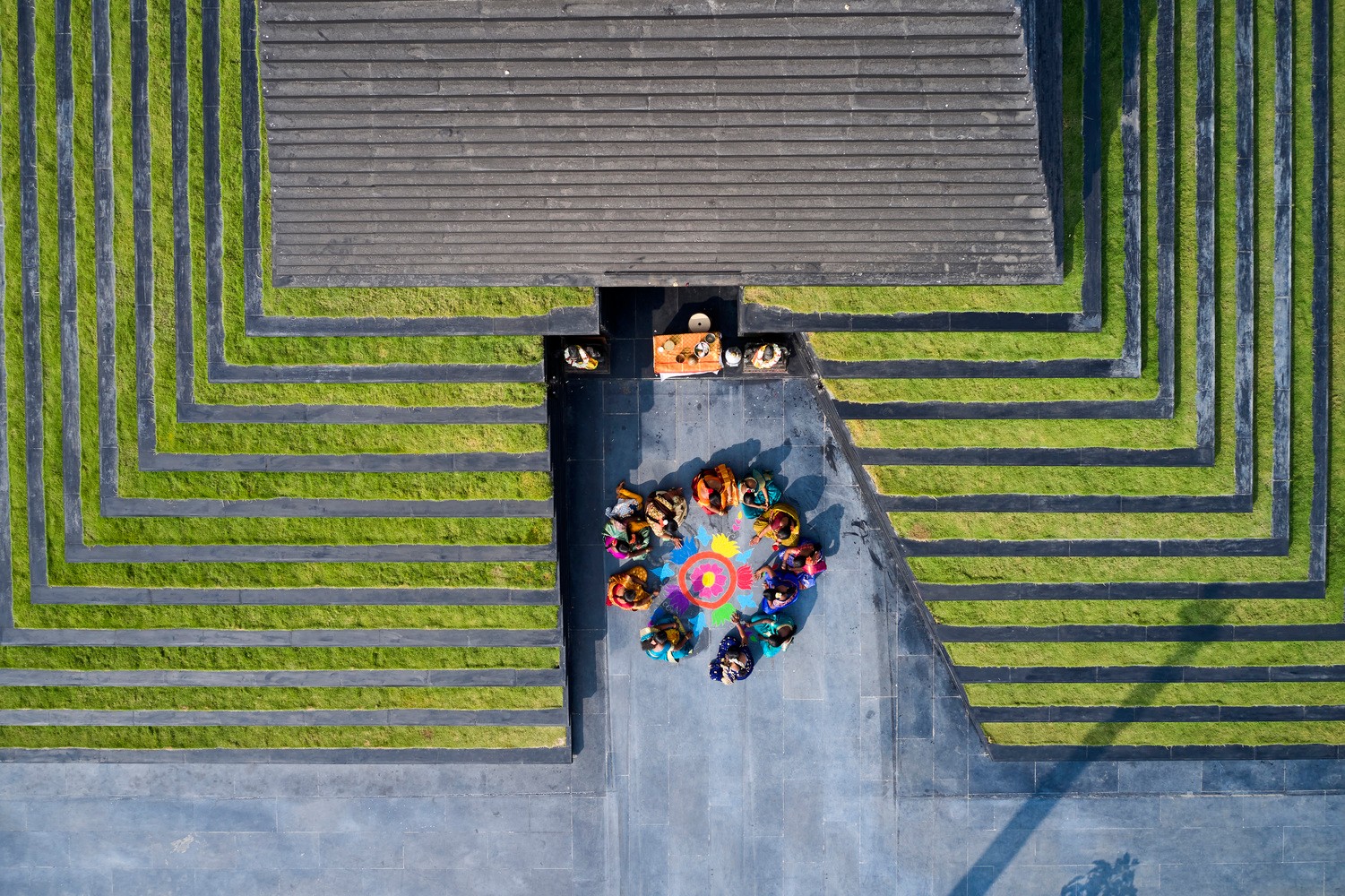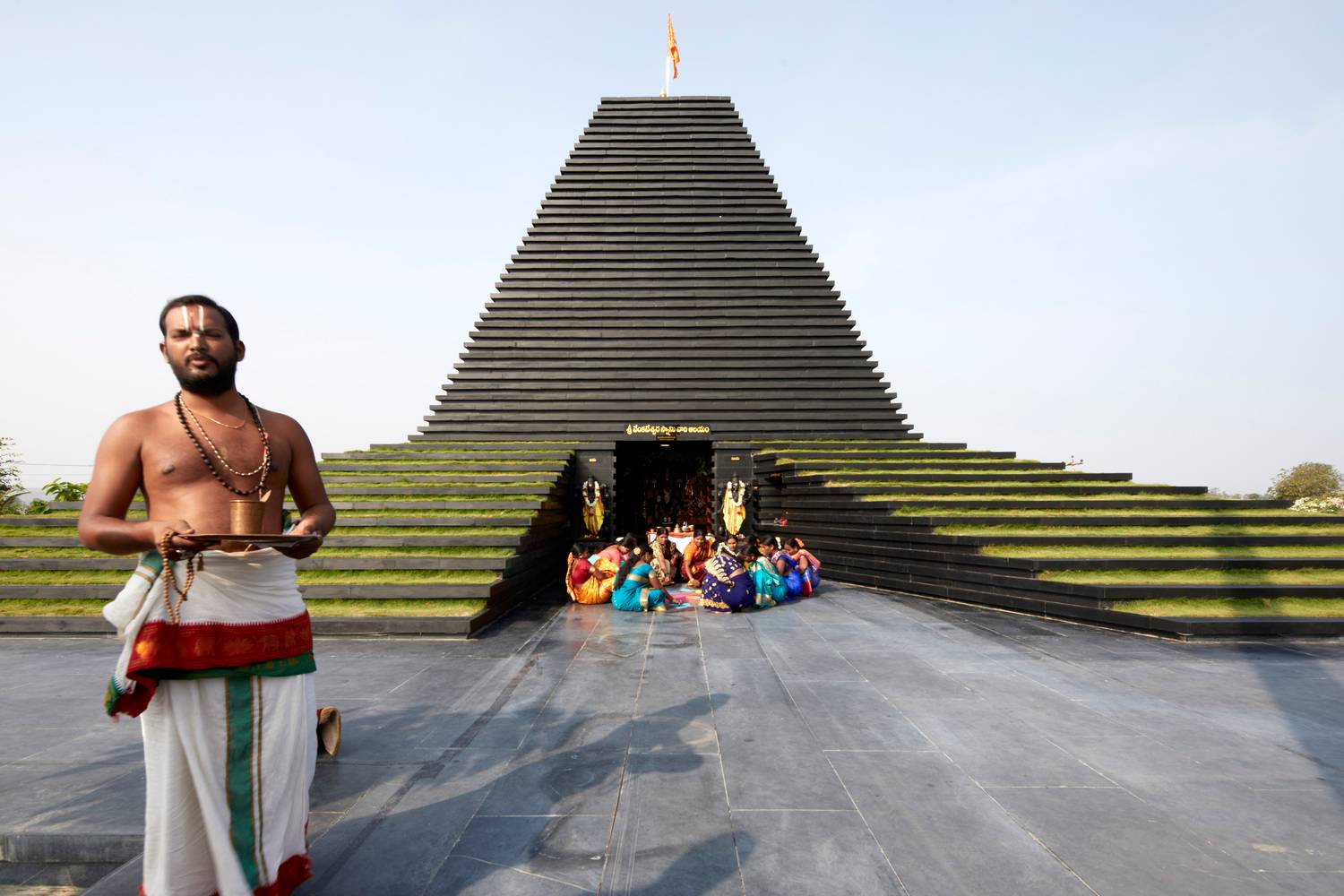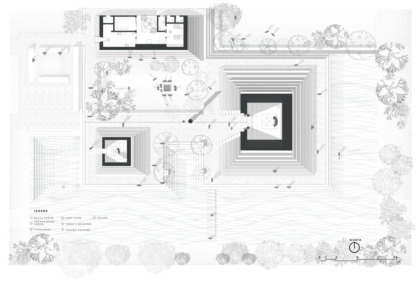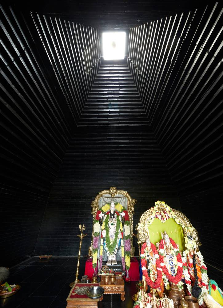 寺廟本身的規(guī)劃來源于印度南部 Tirupathi 一座10世紀(jì)廟宇,它們供奉同一位神祗。相似的例子有, Balaji 與 Varahaswamy 的寺廟和圣池(Pushkarini,一種水箱)。建造過程使用當(dāng)?shù)匾椎玫暮谏沂?,將其堆疊形成寺廟主體。相同的堆疊輪廓同樣運(yùn)用于下半部分,將土壤與植物種植在此,以緩沖熱量。最后,石塊堆疊形成了石梯,即通向水面的臺(tái)階。