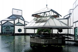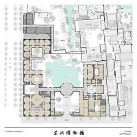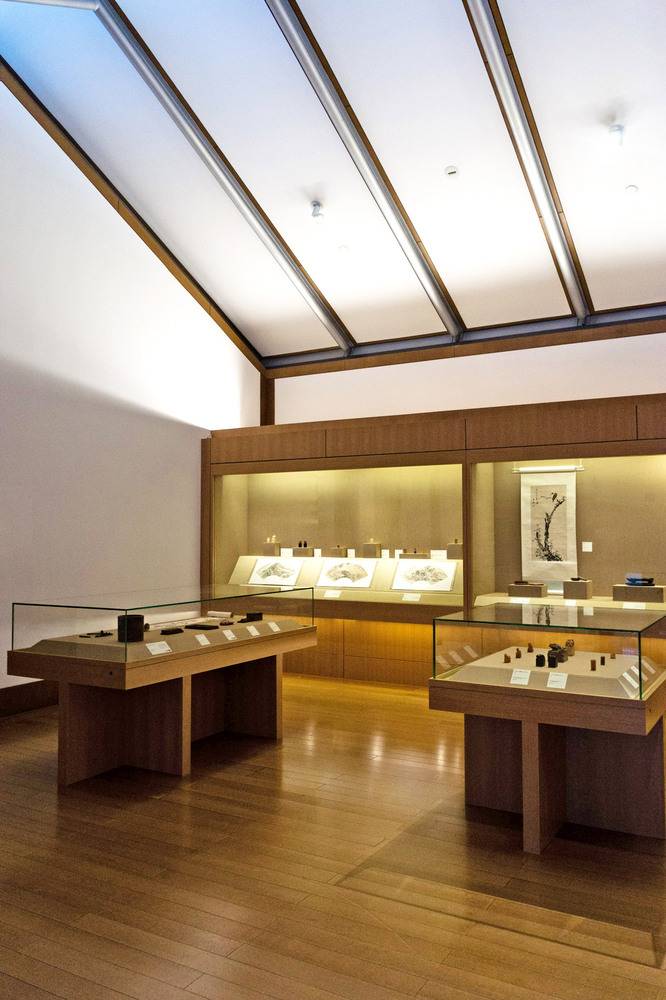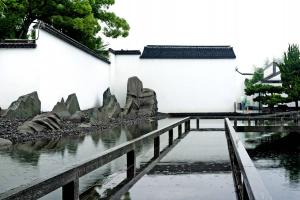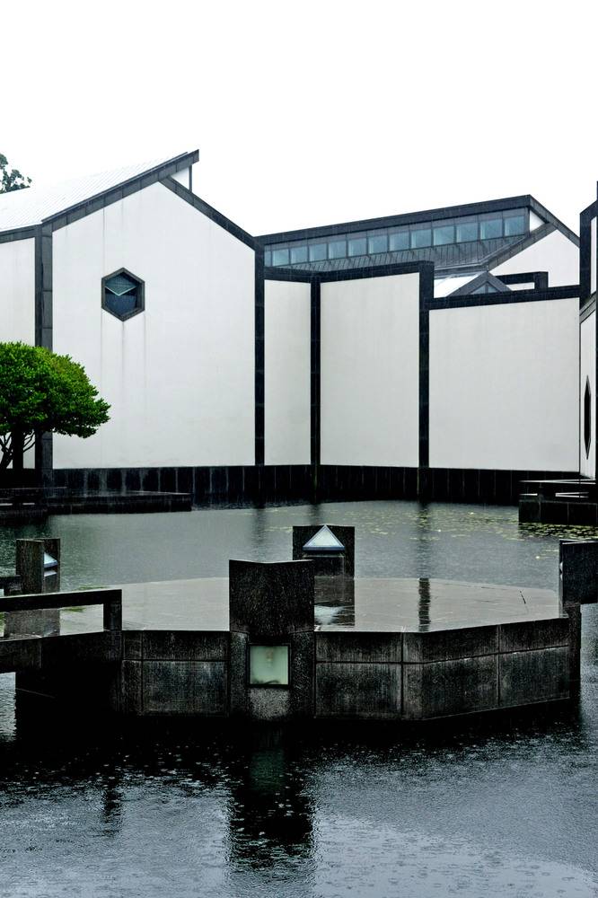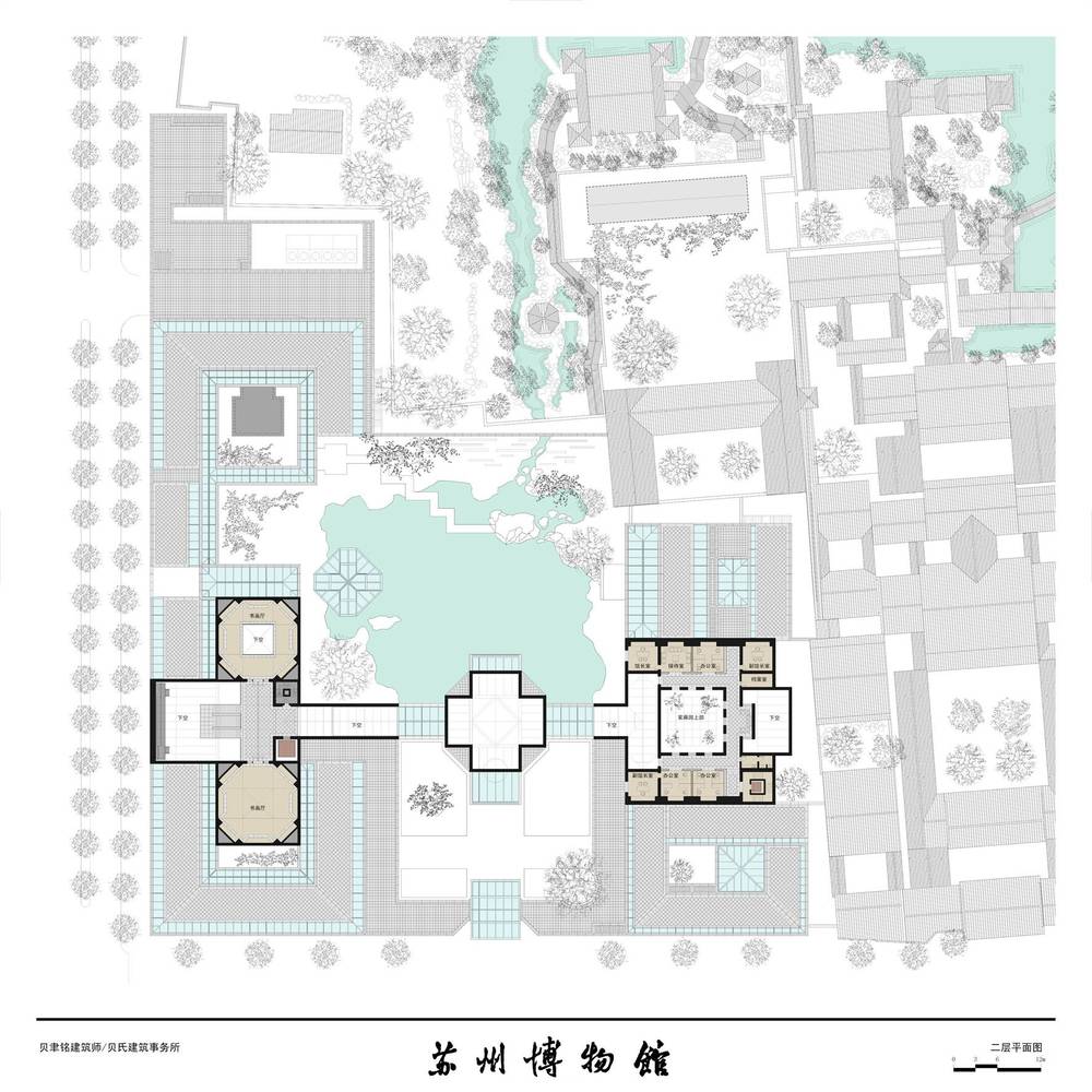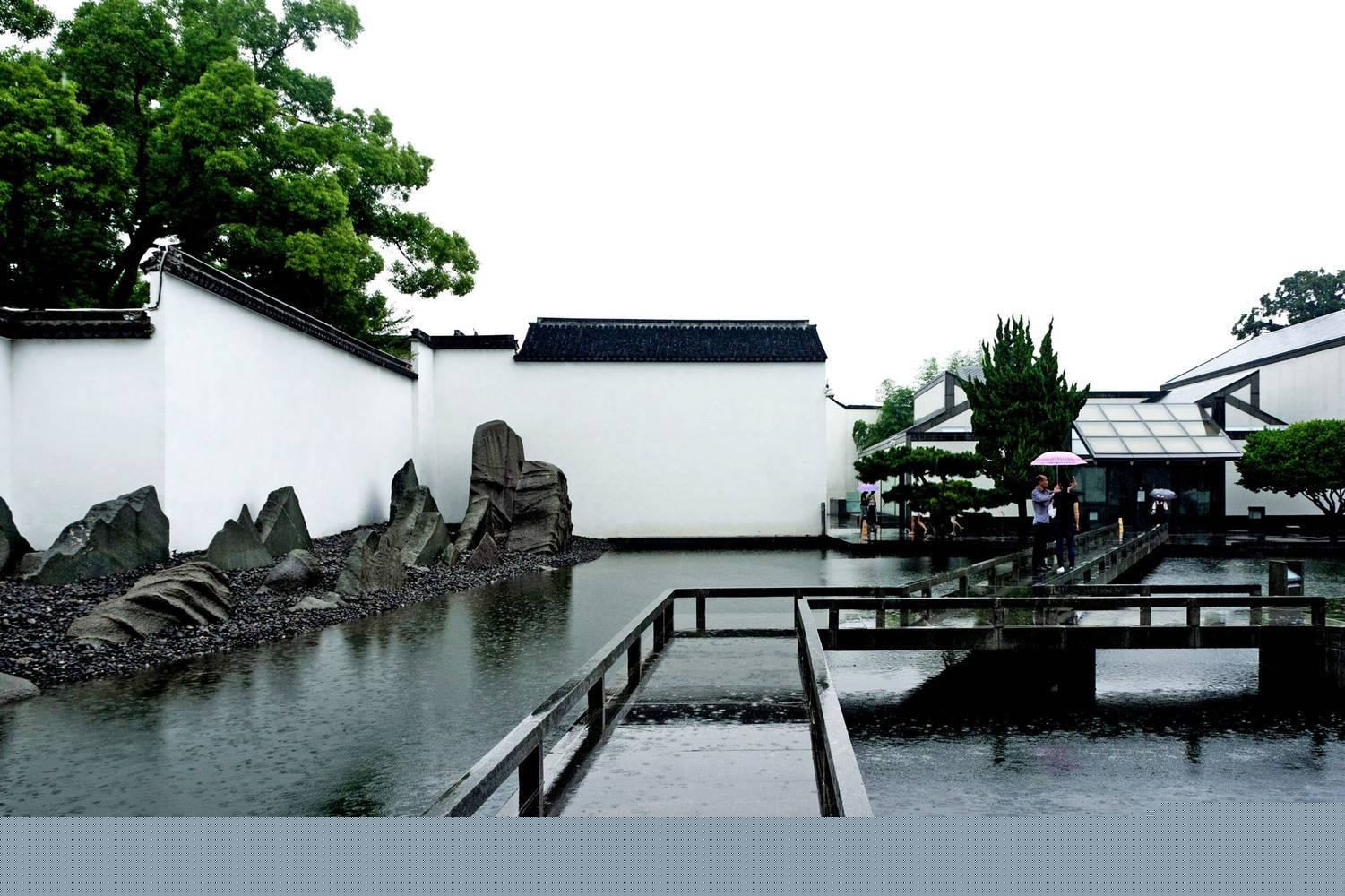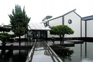 與傳統(tǒng)的蘇州建筑一樣,這個藝術(shù)博物館的設計是圍繞一系列花園和庭院進行的,這些花園和庭院協(xié)調(diào)了建筑和周圍環(huán)境的關(guān)系。庭院中的水,與園林外延展的城市肌理相結(jié)合,形成一個完整的水體圖形。園中的展廳圍繞著回廊的網(wǎng)絡組織,形成一個封閉的網(wǎng)絡,在調(diào)節(jié)景觀的同時為內(nèi)部庭院創(chuàng)造隱私和親密感。它們暗指了宋代山水畫中的“透視轉(zhuǎn)換”技法,旨在迫使游客積極探索園林中的景致。[3] 建在水上的庭院中的道路由一組石橋組成并連接起來,環(huán)繞著位于庭院中心的涼亭,正如中國傳統(tǒng)園林中的情形一般。