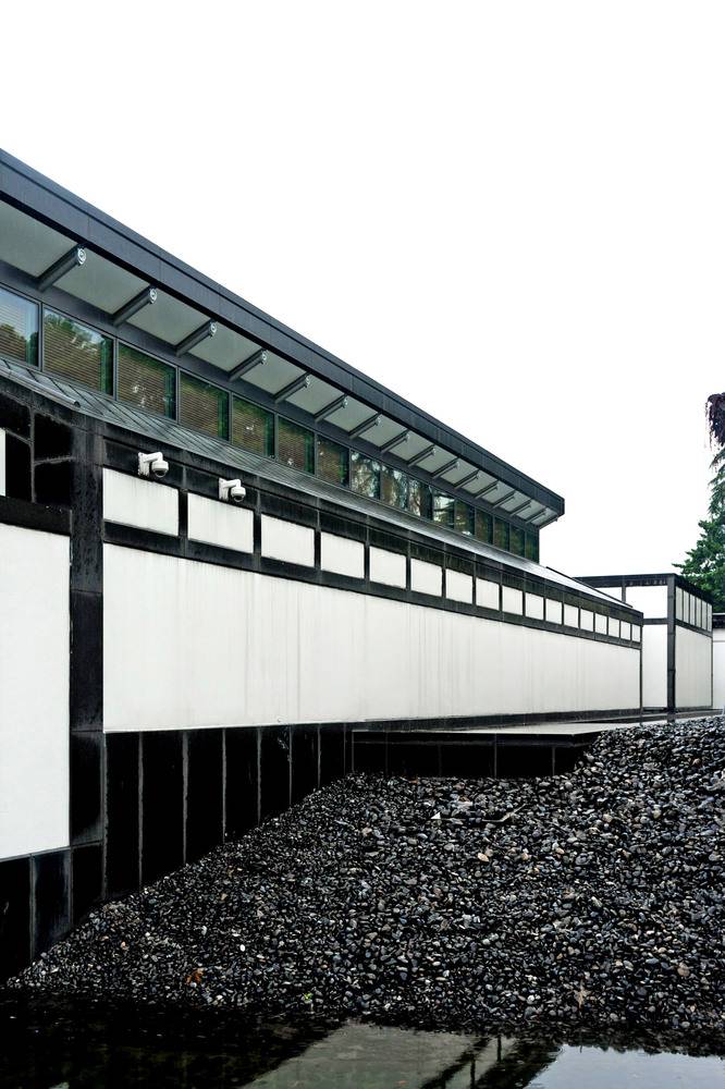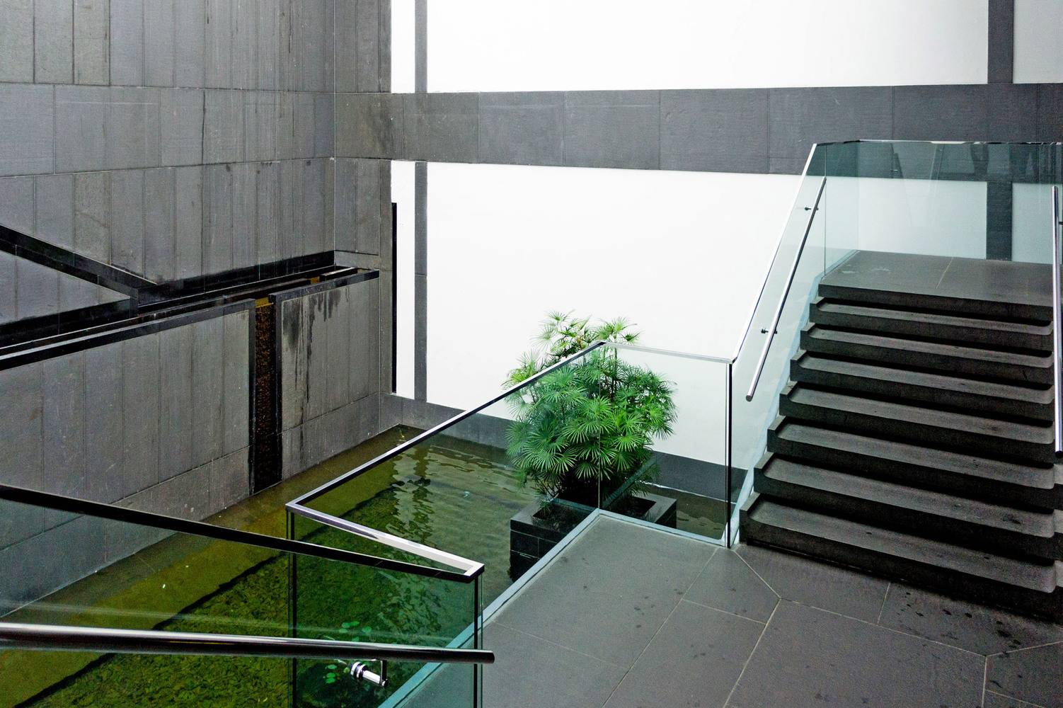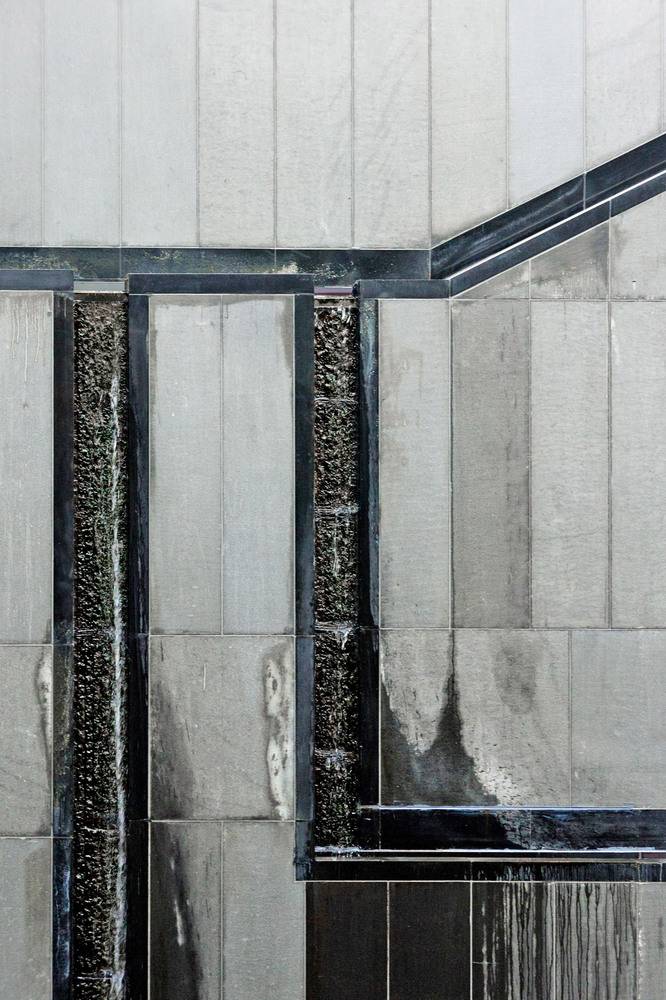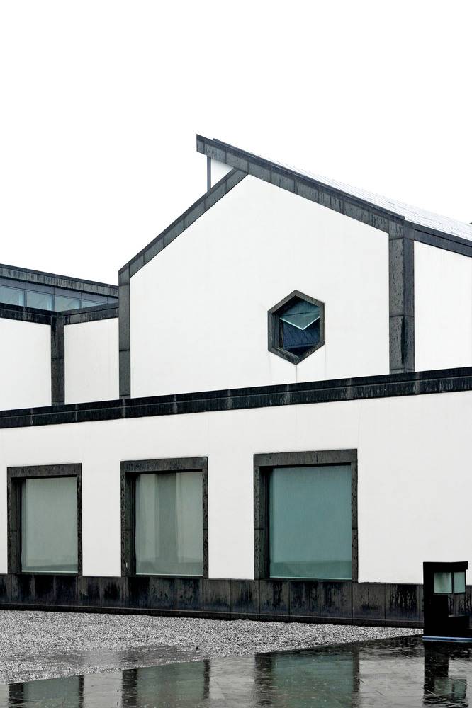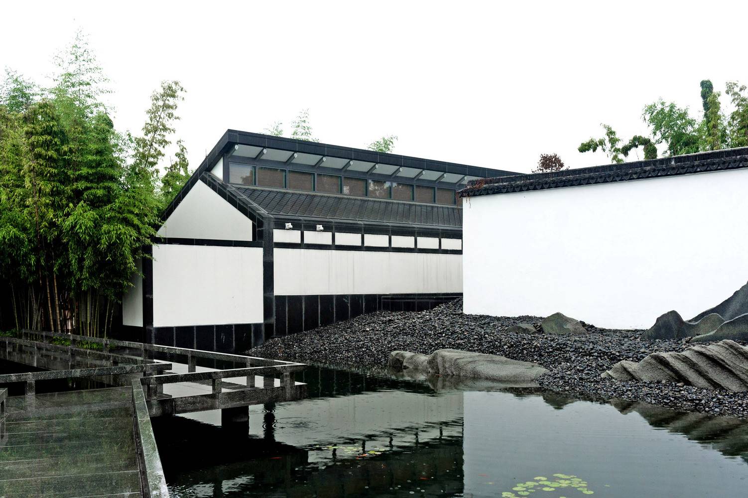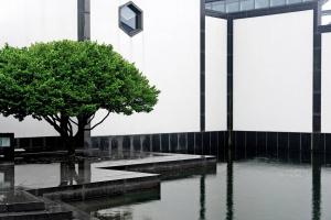 庭院中央的水庭也以當代風格的園林巖石裝飾為特色,與隔壁拙政園的景觀相呼應。這些巖石的層次感在白色的背景墻上形成了一組細微的輪廓和剪影,讓人聯(lián)想到中國傳統(tǒng)水墨畫中的隱喻性,像是在一張白色的紙上畫出的潑墨山水畫。