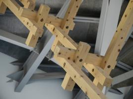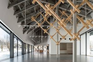 場(chǎng)地中的樹(shù)林設(shè)有木制拖車房,因此游客既可以享受野營(yíng)也可以享受豪華露營(yíng)。建筑的大面積屋頂形態(tài)呼應(yīng)著白馬村三座山峰的輪廓,室內(nèi)的木制框架則使用了小直徑的木材,以此在內(nèi)部空間打造樹(shù)枝和雪花的景象。