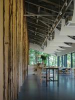 室內(nèi)空間被與防水布相同的面料分為幾個(gè)部分,留有樹(shù)皮痕跡的木制百葉窗沿著墻壁排列,以此營(yíng)造出室內(nèi)的“戶外郊游”空間。