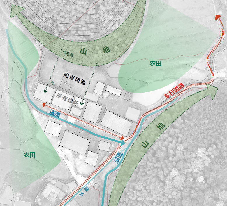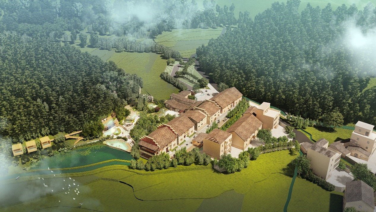 The project site is surrounded by mountains on two sides and water on three sides, in a pattern surrounded by mountains and water and farmland. The existing concrete road with good foundation leads directly to the project site. The existing buildings are well-preserved residential houses with local architectural characteristics, which provide a good architectural foundation for interest of the tourism.