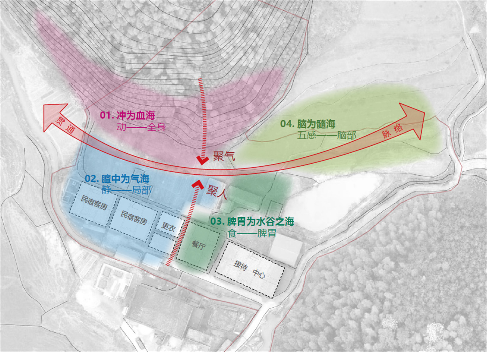 After conducting a field survey of the site, we believe that Jintang Hot Spring’s has high-quality medical value. On the one hand, It can give people physiological "treatment"; on the other hand, the ecological and rural environment of the site can give people a mental “treatment”. Therefore, the design should also conform to the feeling of "healthy and natural". And we compare the site traffic streamlines to the veins of the human body, and apply the concept of "Sihai" in Chinese medicine to the layout of zoning activities.