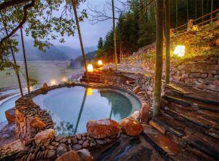 ▲視野最開闊的疊泉泡池,下承瀑布泡池。@錢山金湯溫泉體驗館